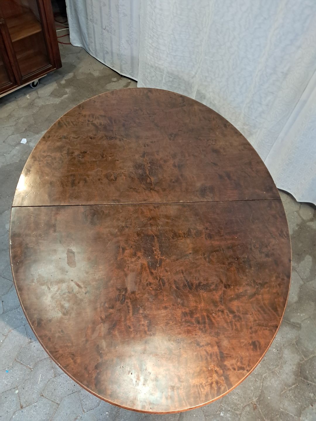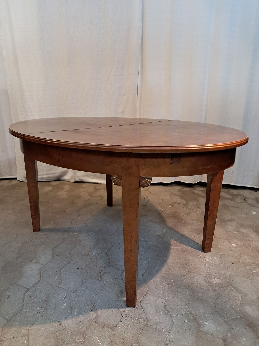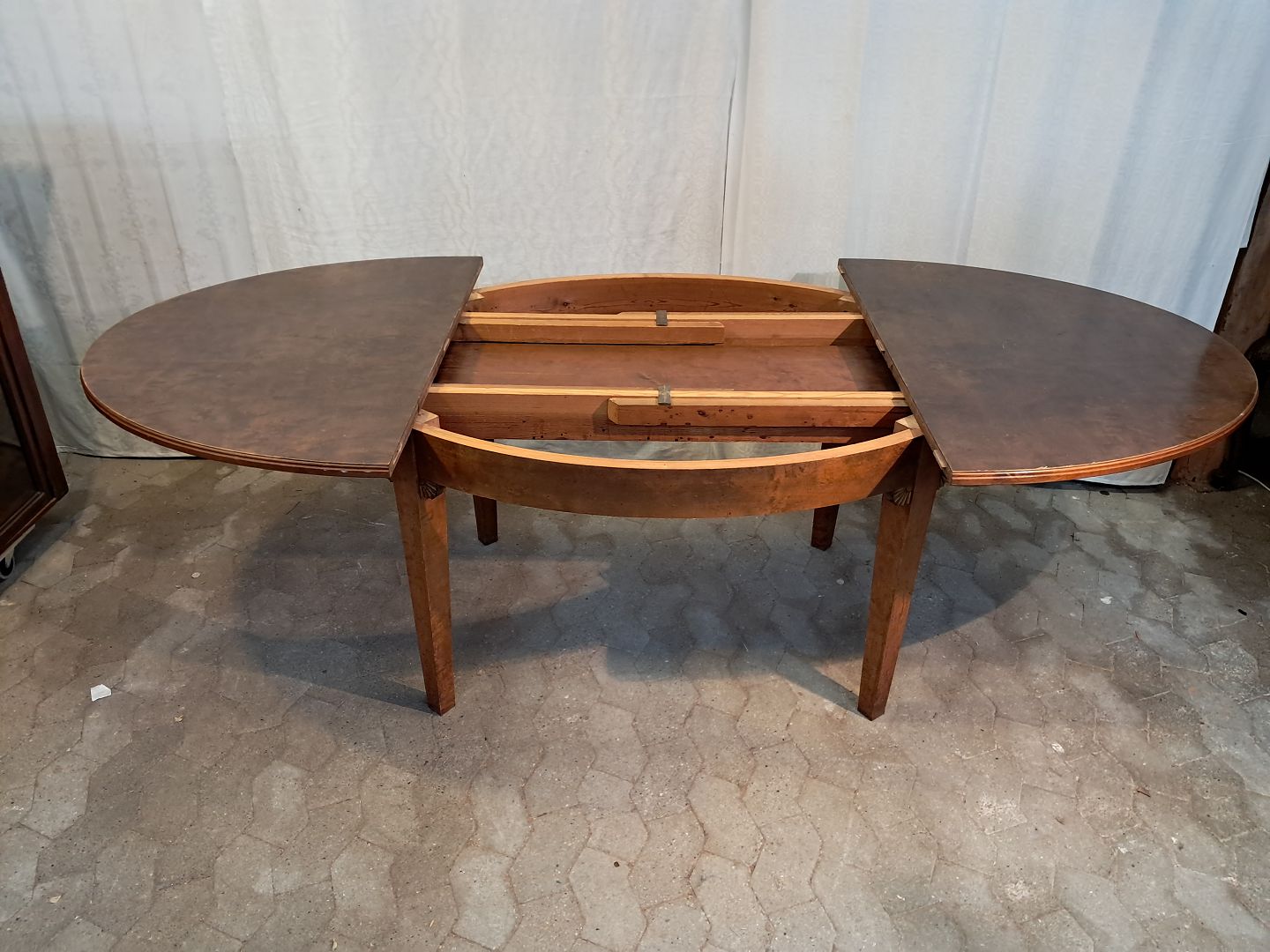 Spisebord i fineret birketræ med 3 tillægsplader, fra 1920erne.Det har brugsspor.