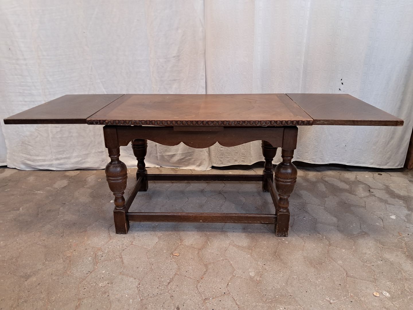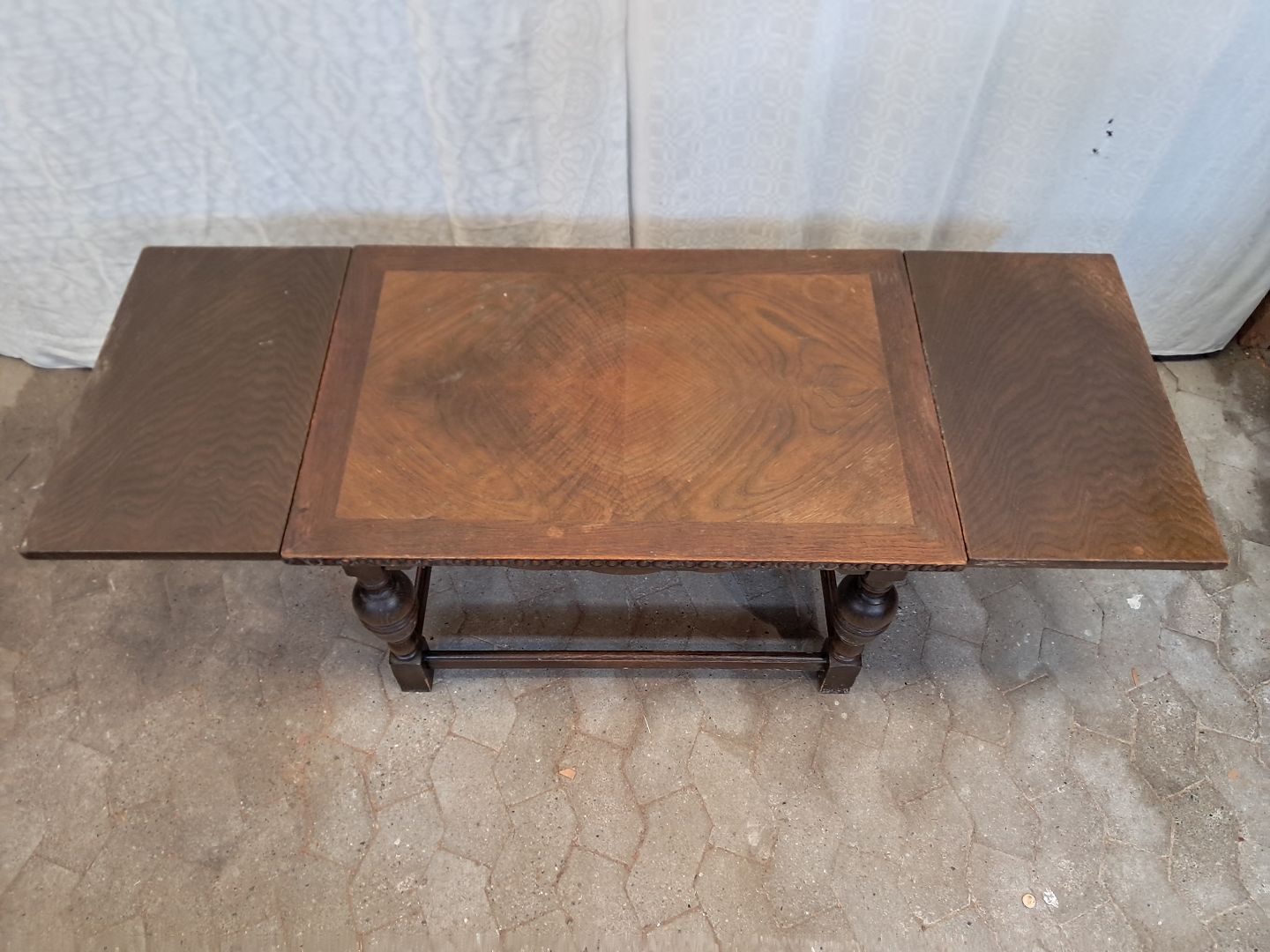 Sofabord i fineret egetræ med hollandsk udtræk, fra 1980erne.Det har brugsspor.