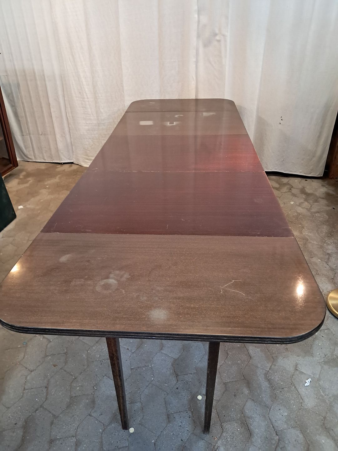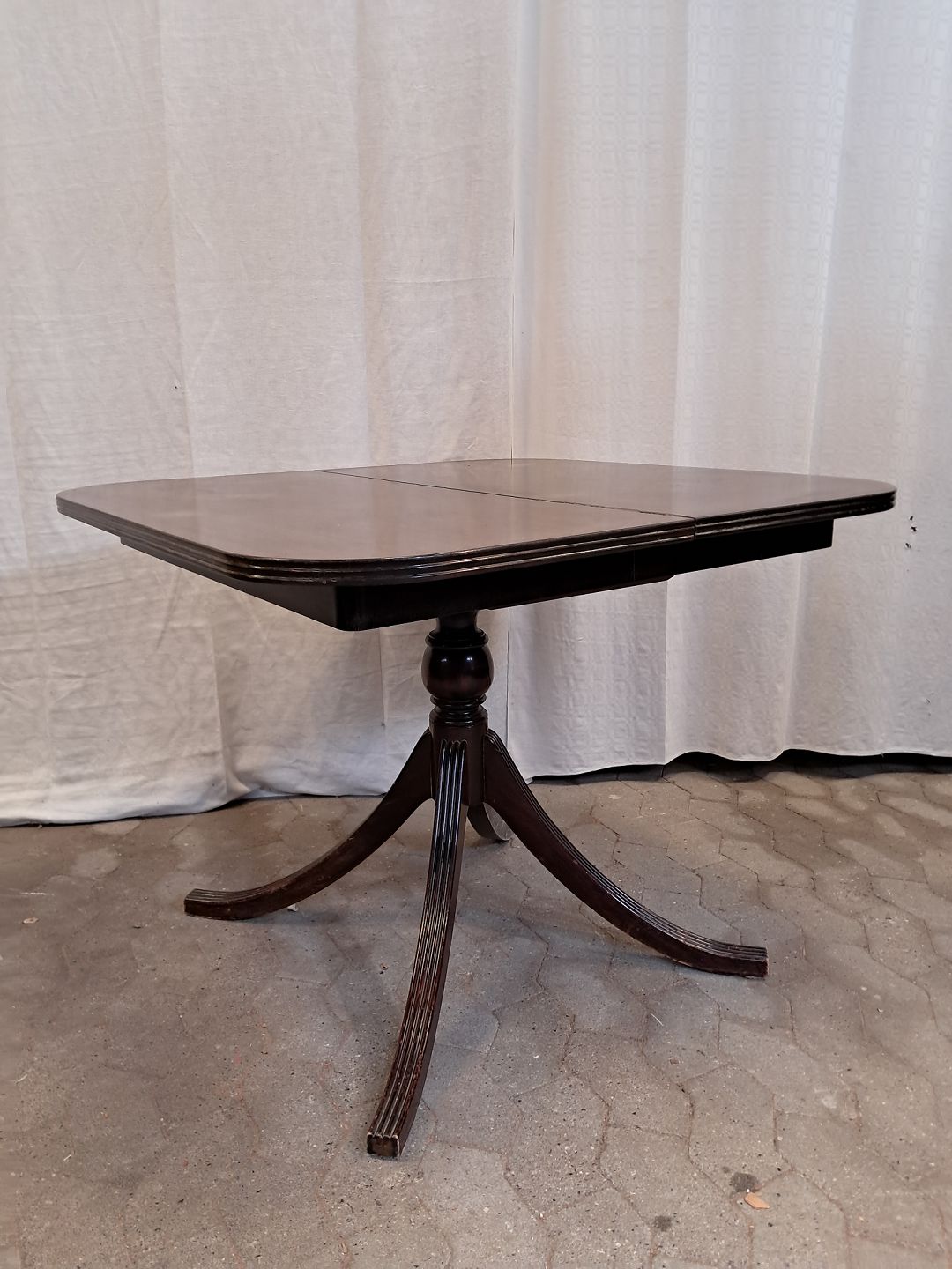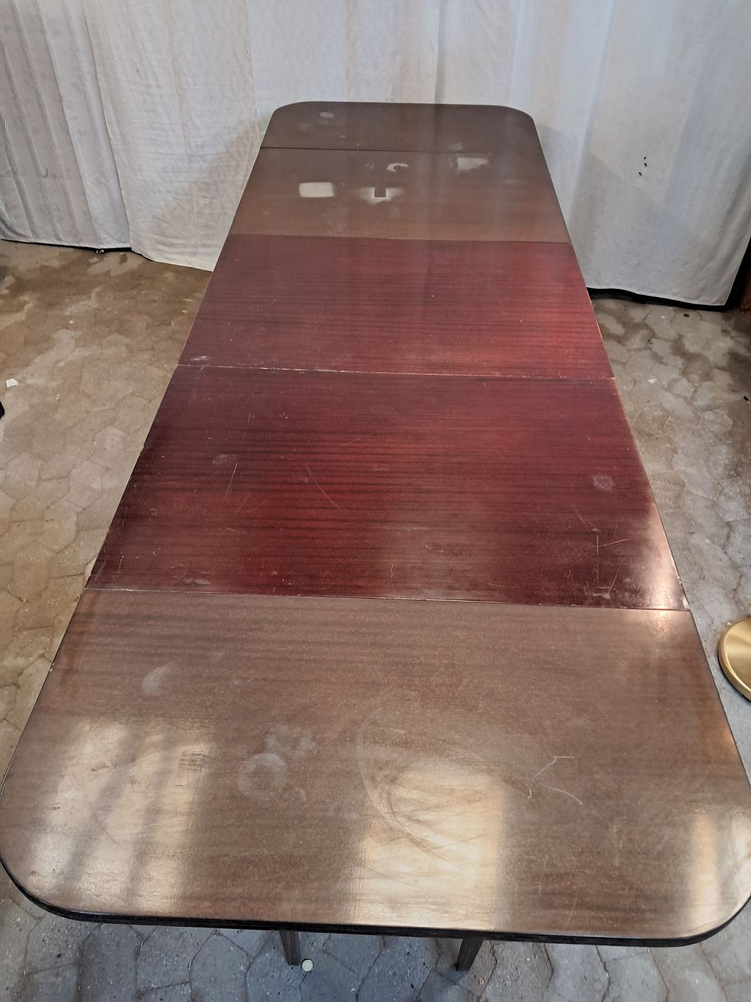 Spisebord i fineret mahogni med 3 tillægsplader.Det har brugsspor og er falmet i farven.