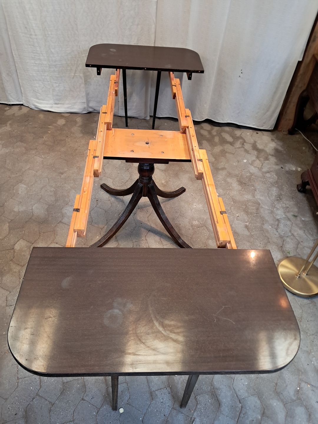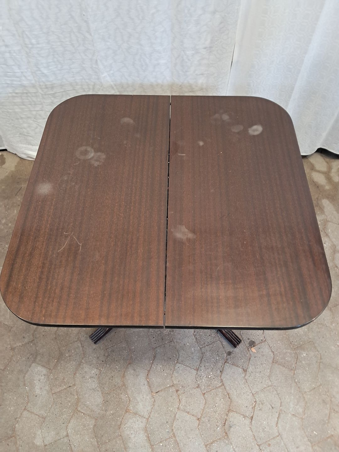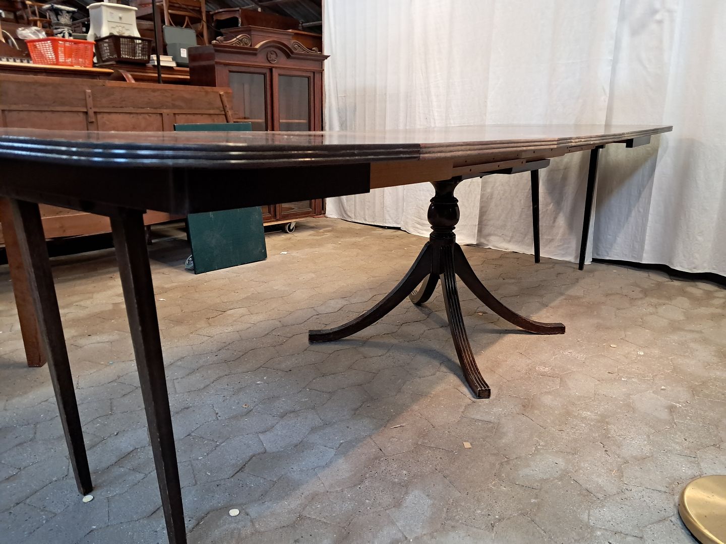 Spisebord i fineret mahogni med 3 tillægsplader.Det har brugsspor og er falmet i farven.