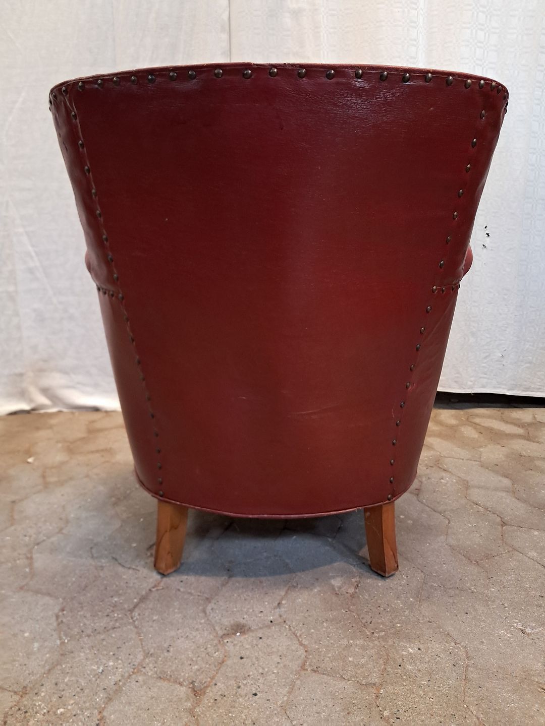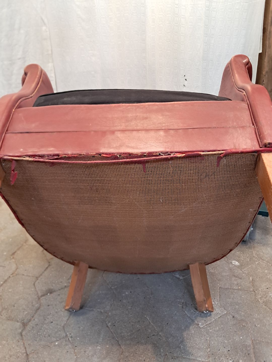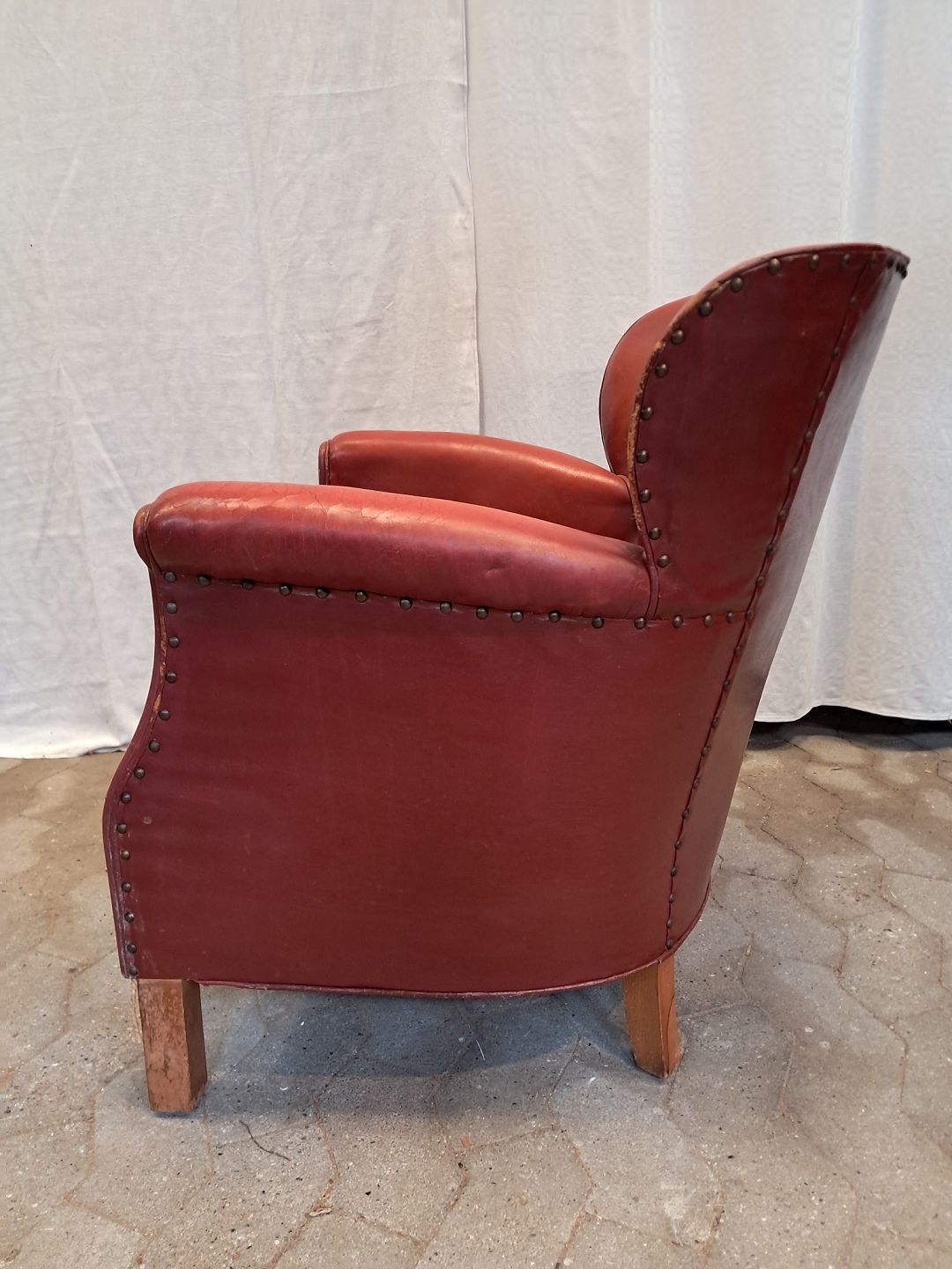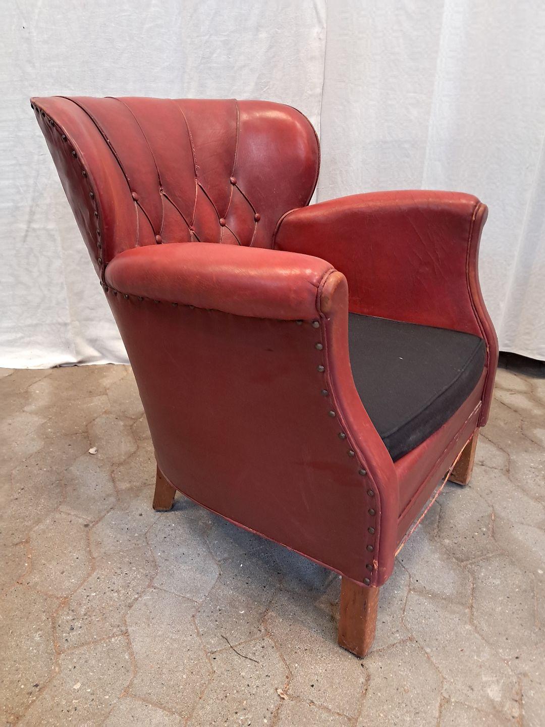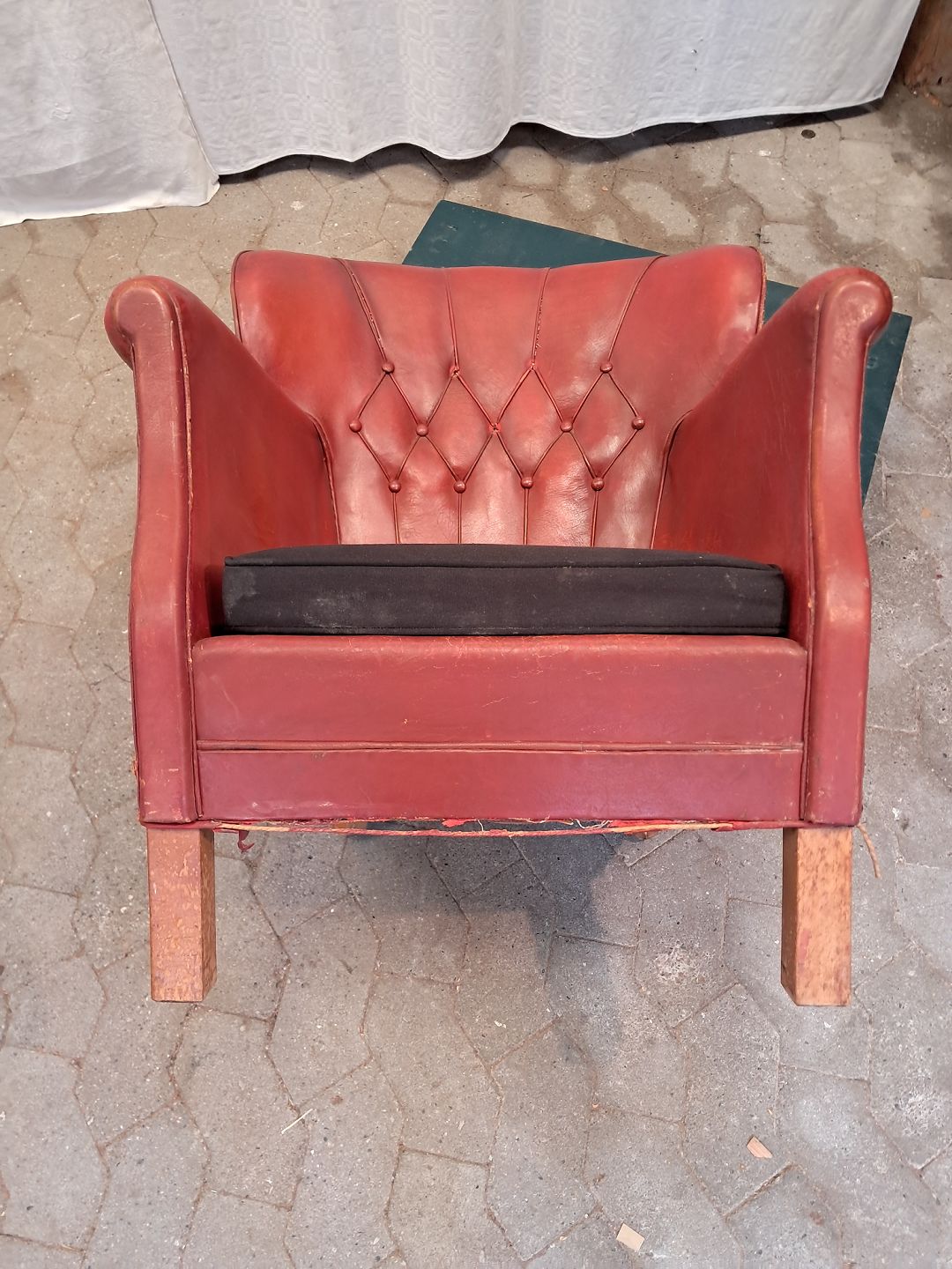 Lænestol i læder, fra 1930erne.Den har brugsspor og defekter.