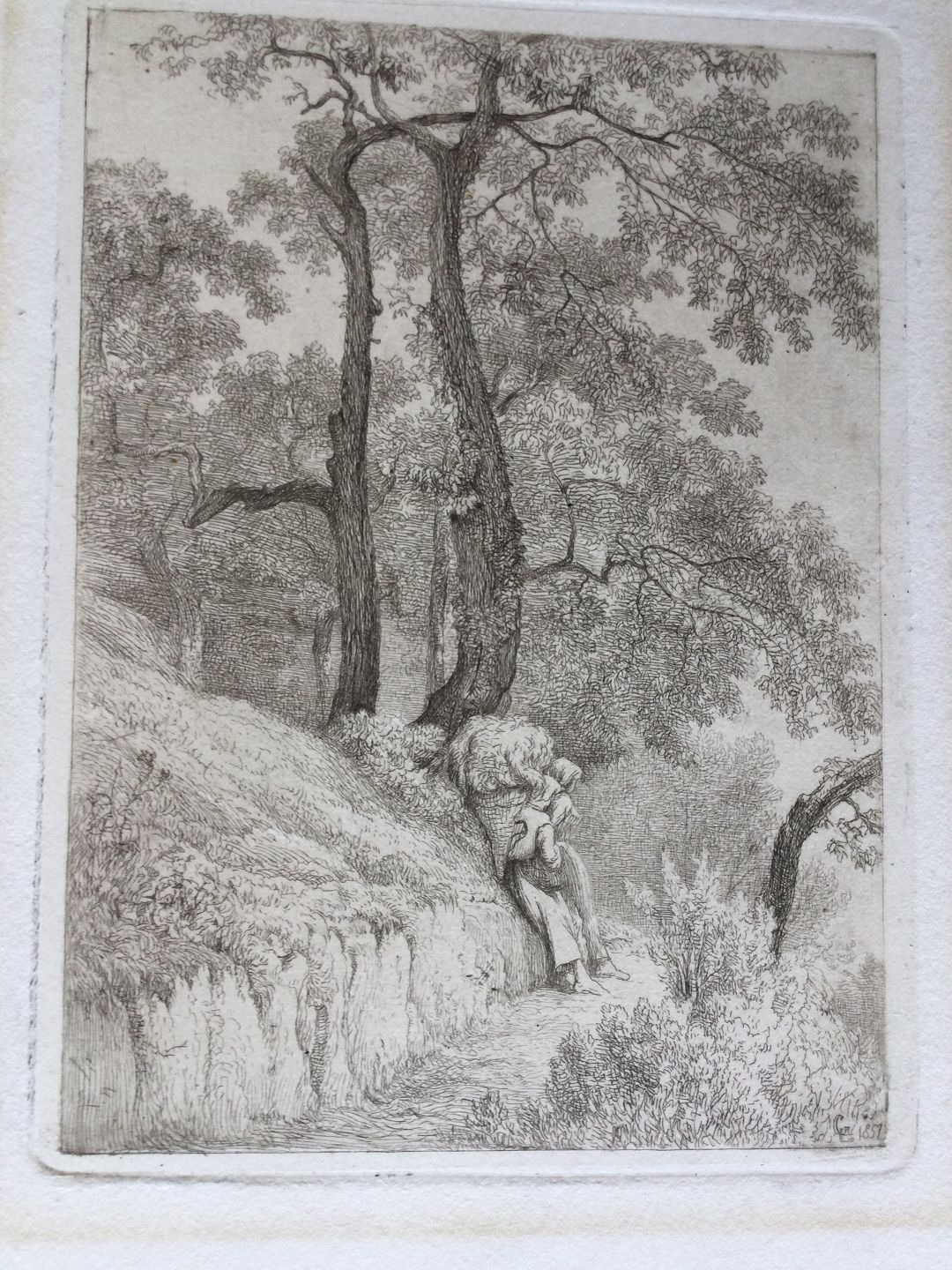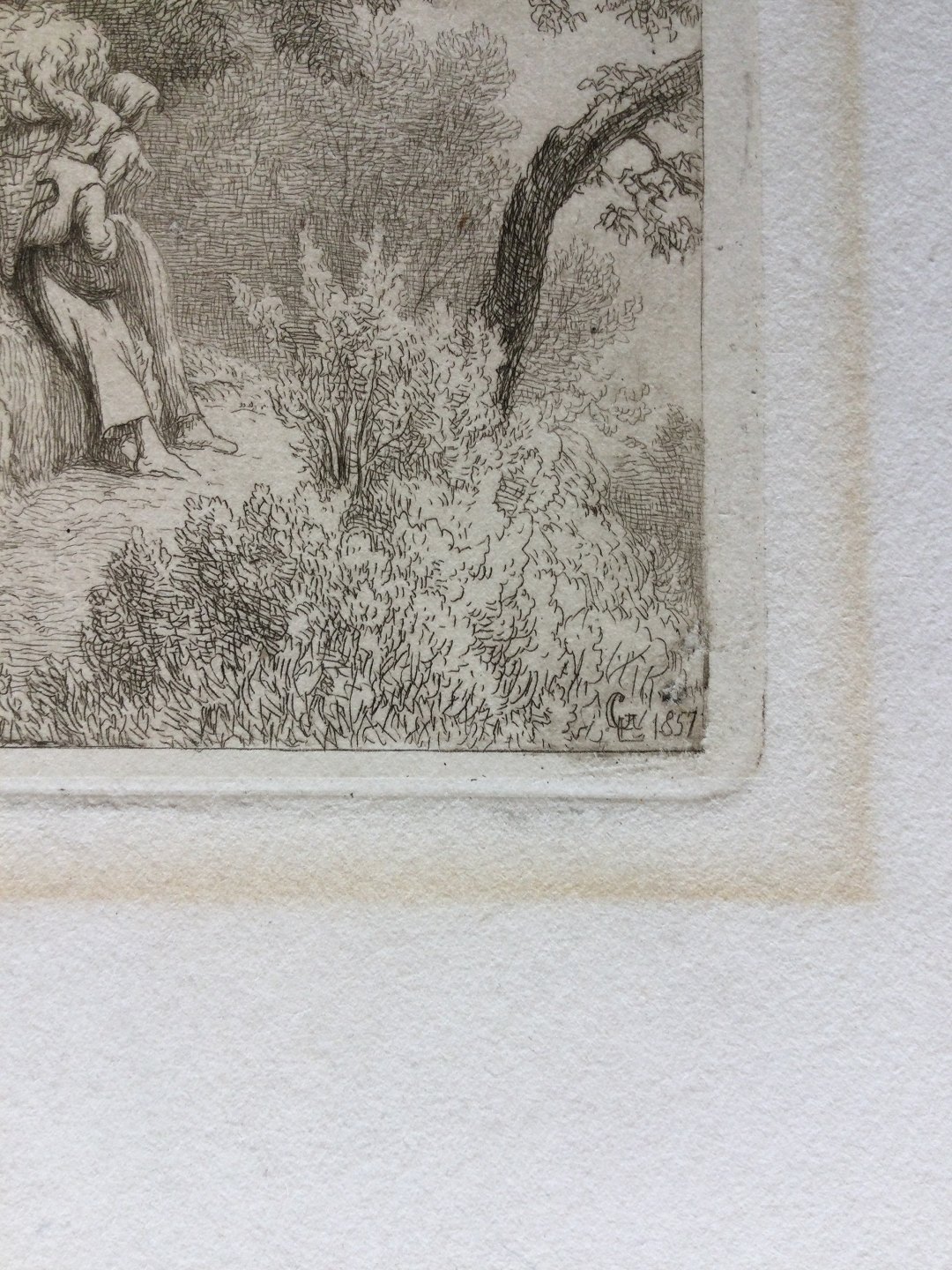 Radering af Louis Gurlitt 1857 - 2 kvinder med fyldte kurve i landskab.