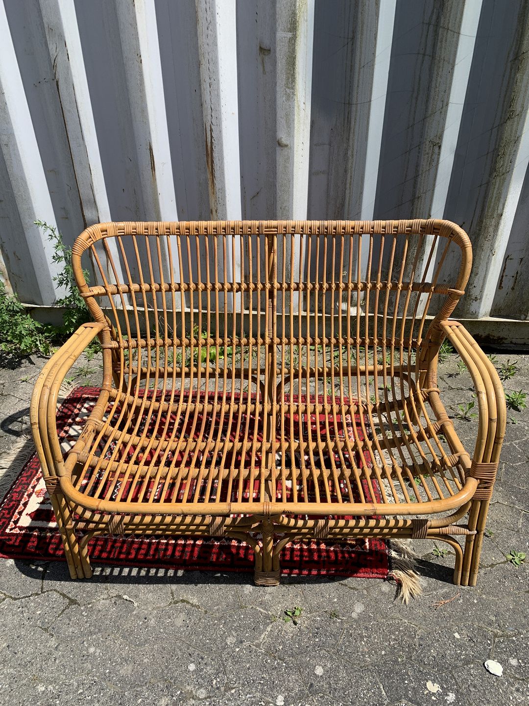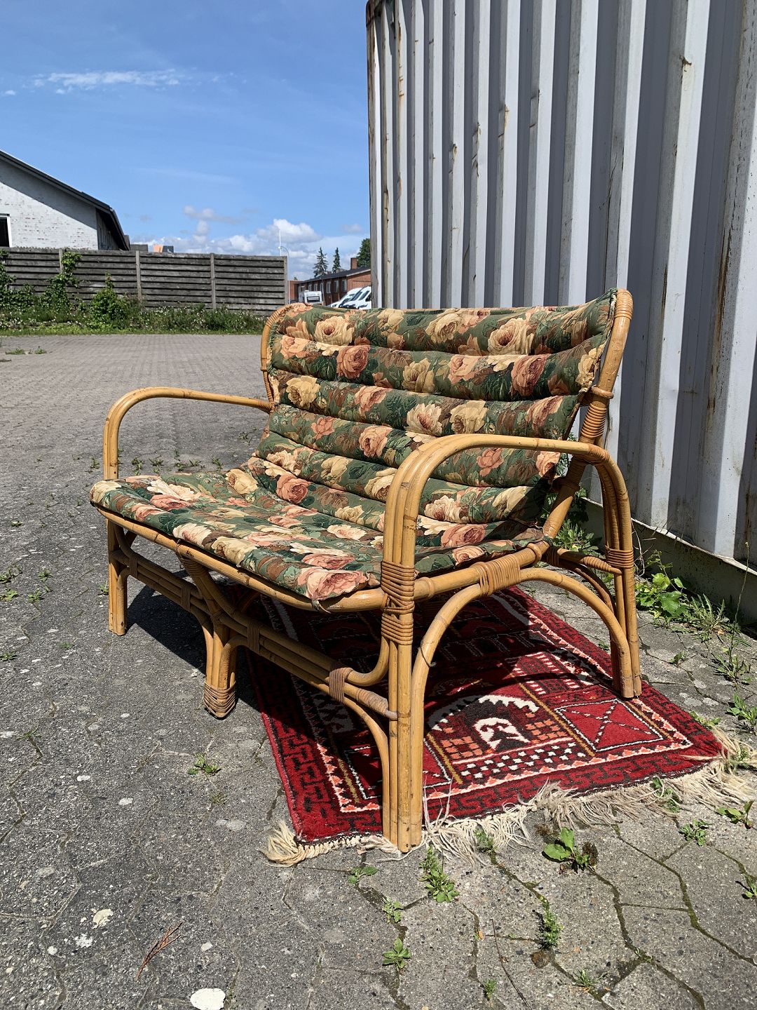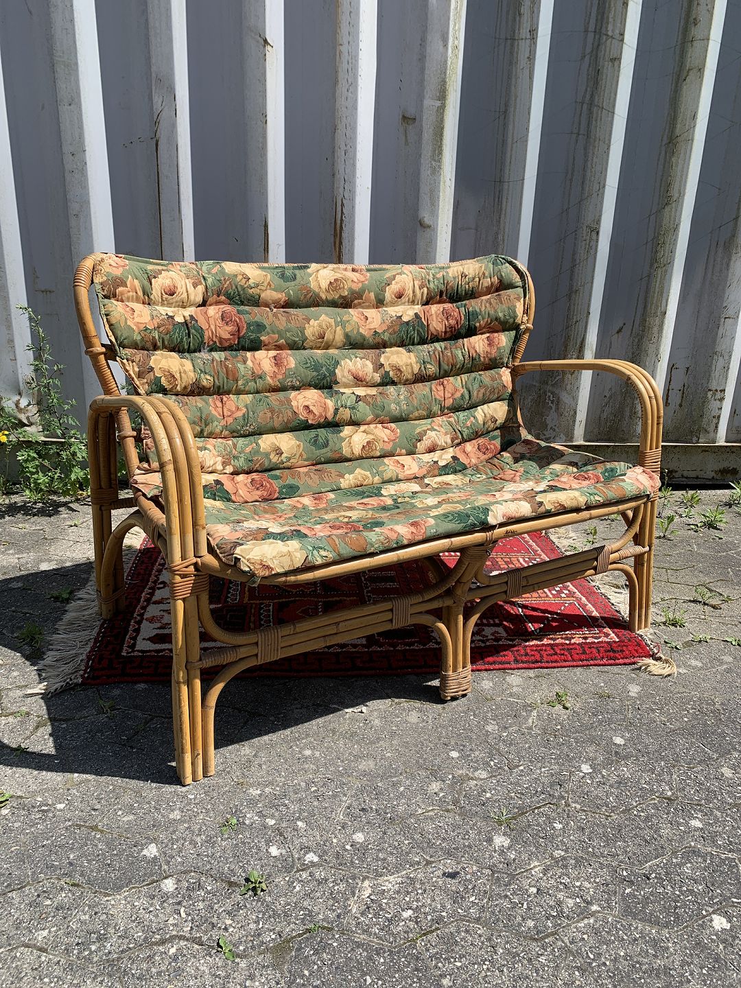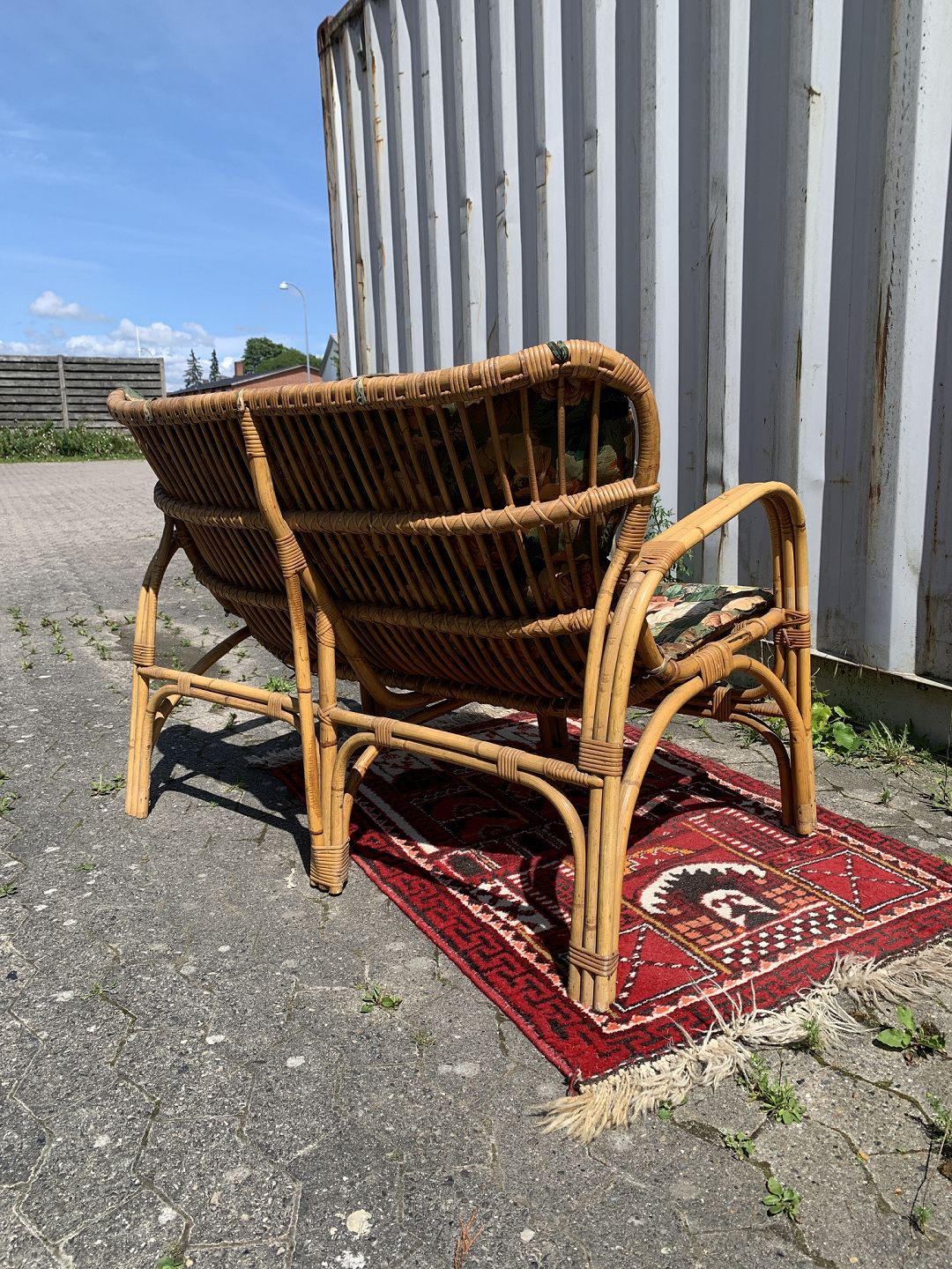 Bambus sofa med hynde, fra 1960-1970erne.Den har brugsspor og små defekter.