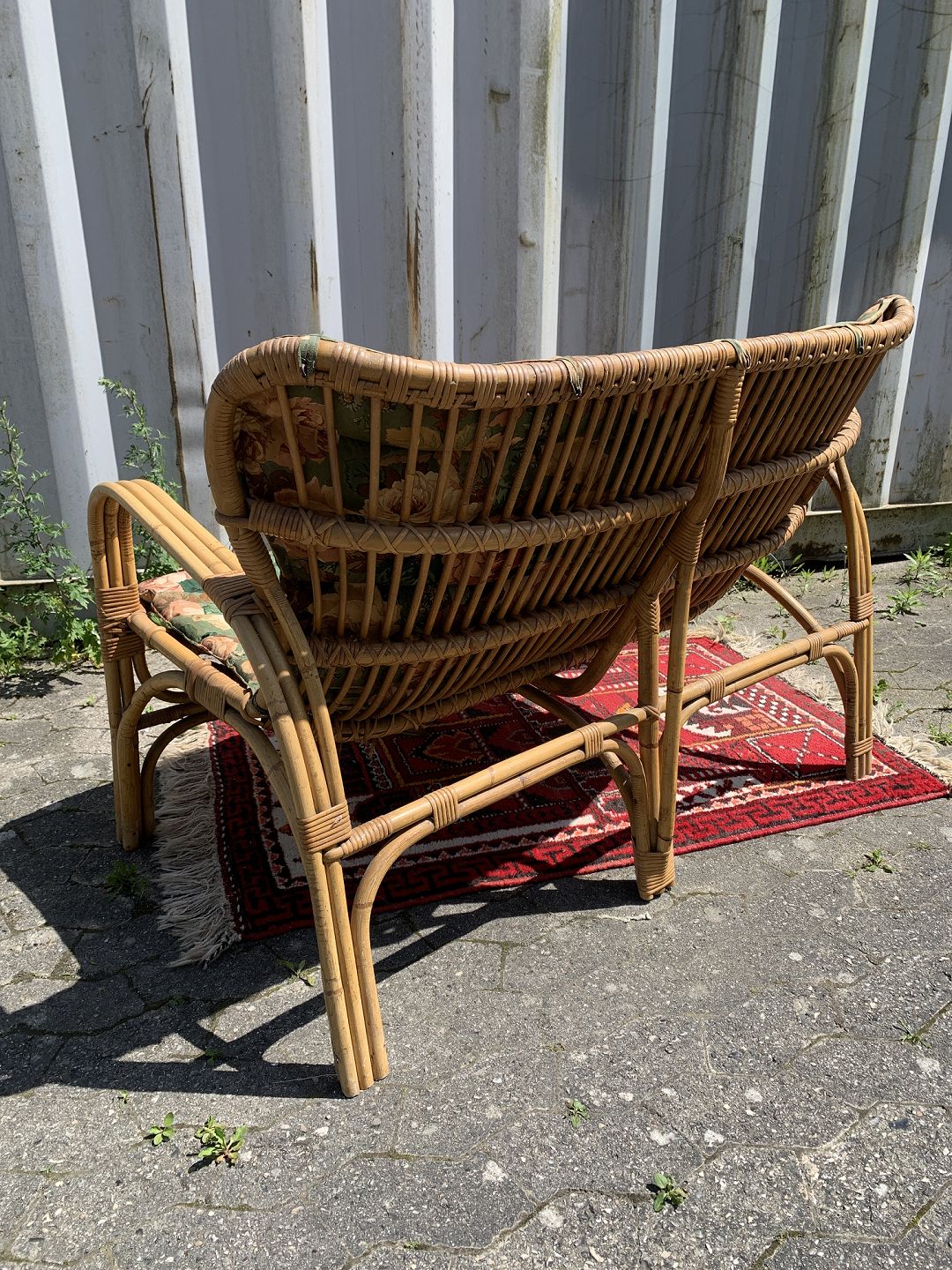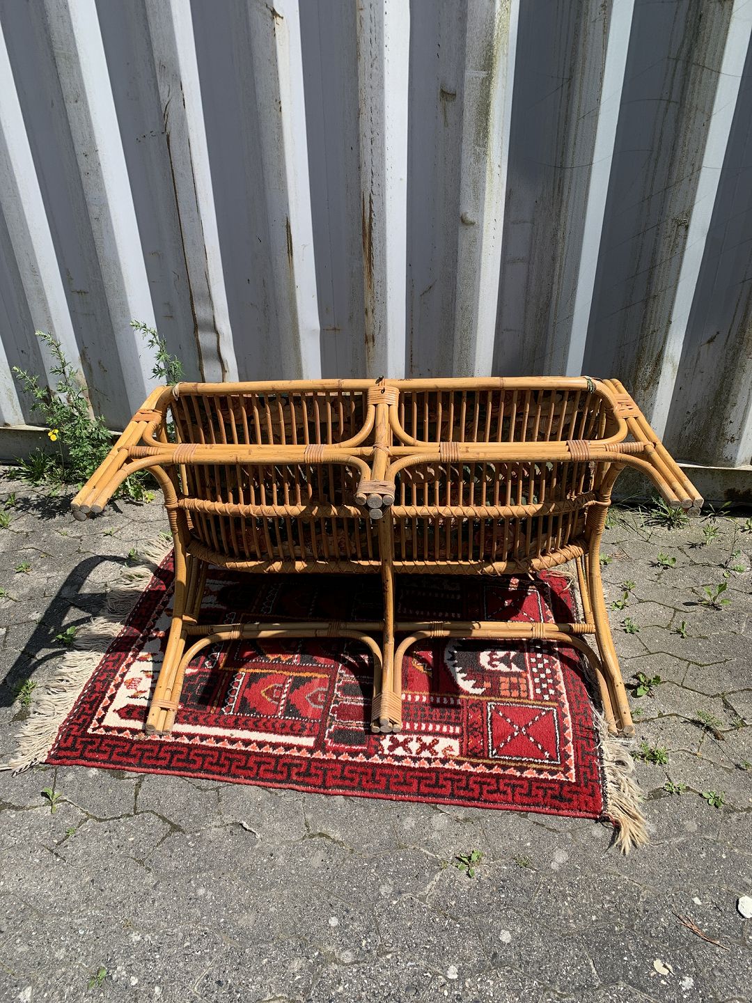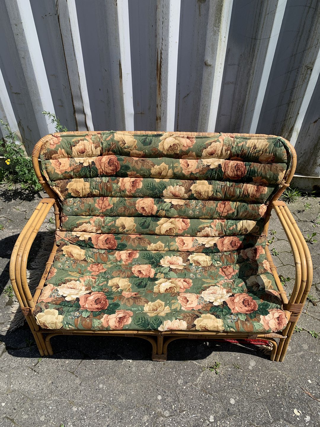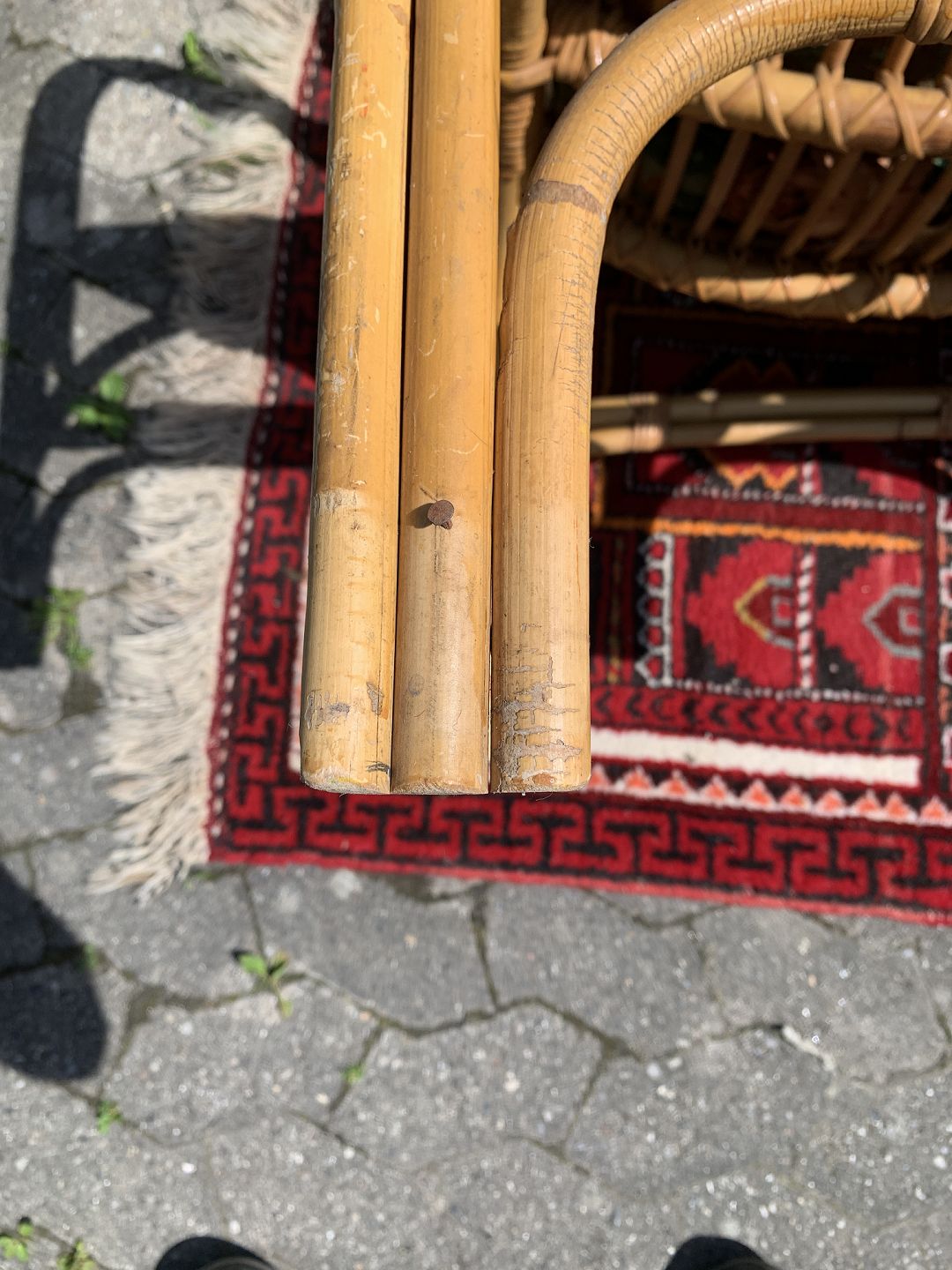 Bambus sofa med hynde, fra 1960-1970erne.Den har brugsspor og små defekter.