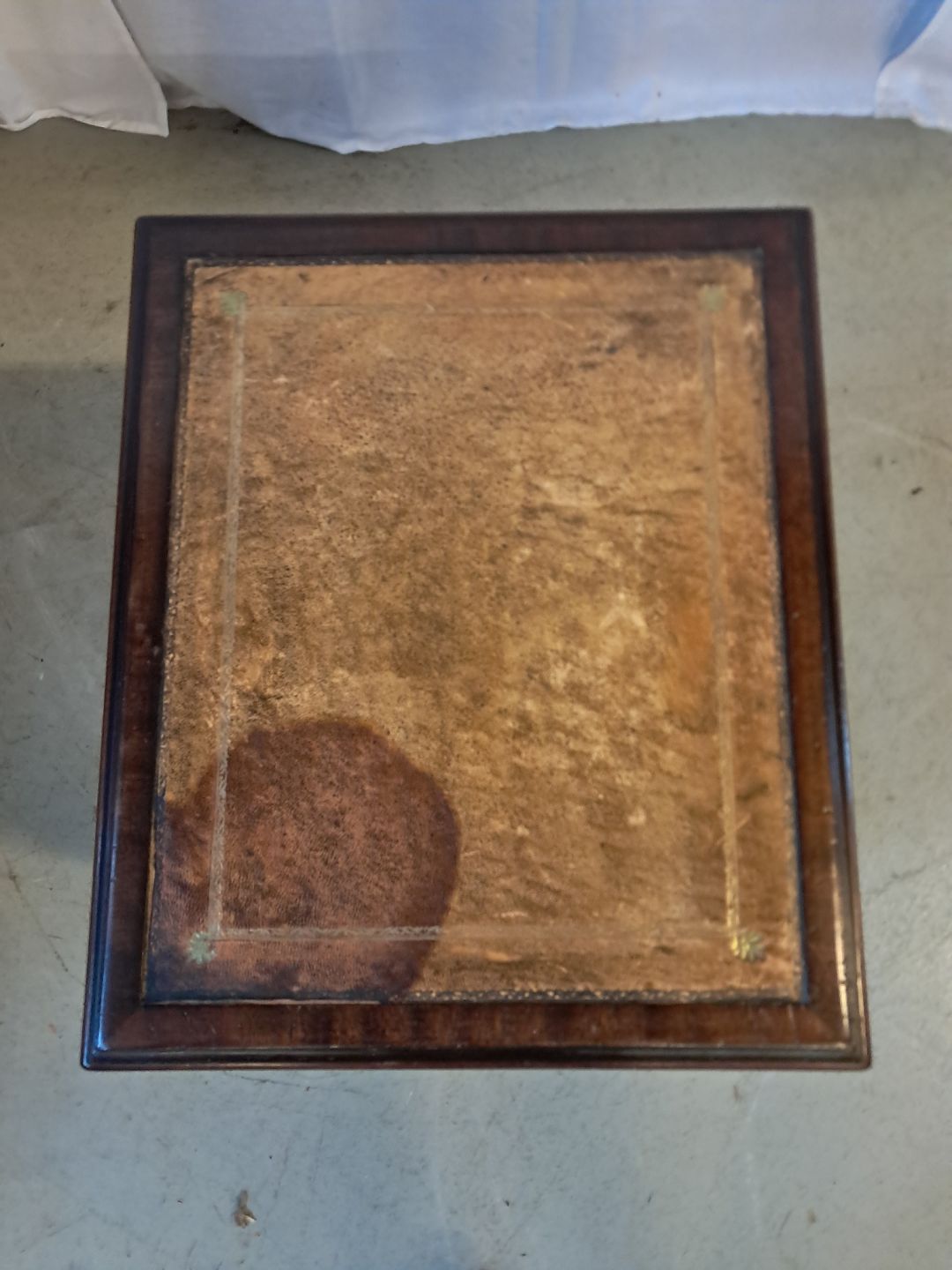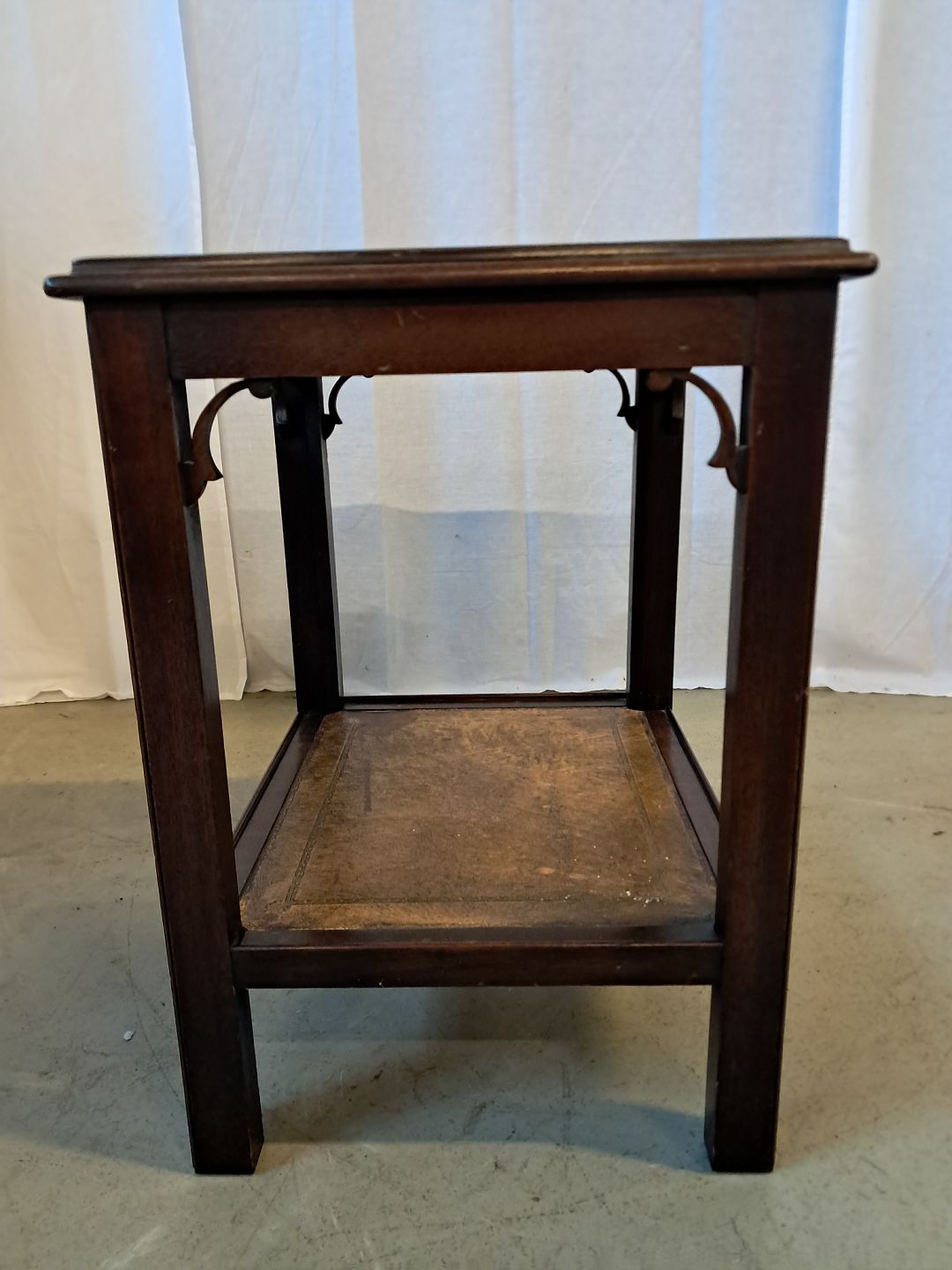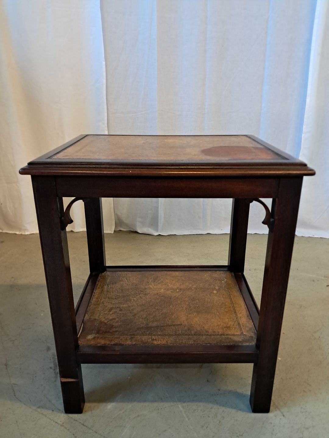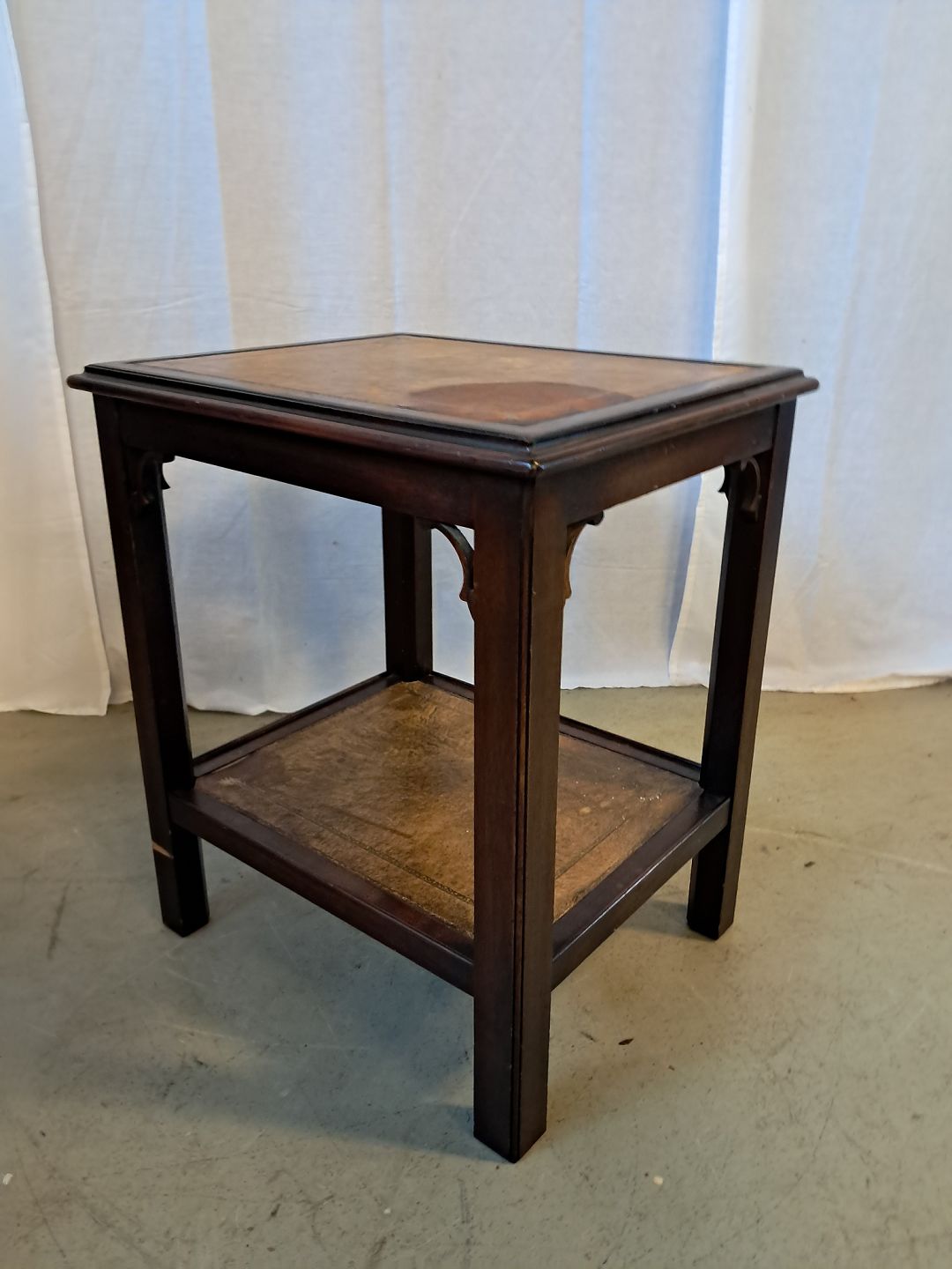 Lampebord i fineret mahogni med læder indlæg, fra 1980erne.Det har brugsspor.