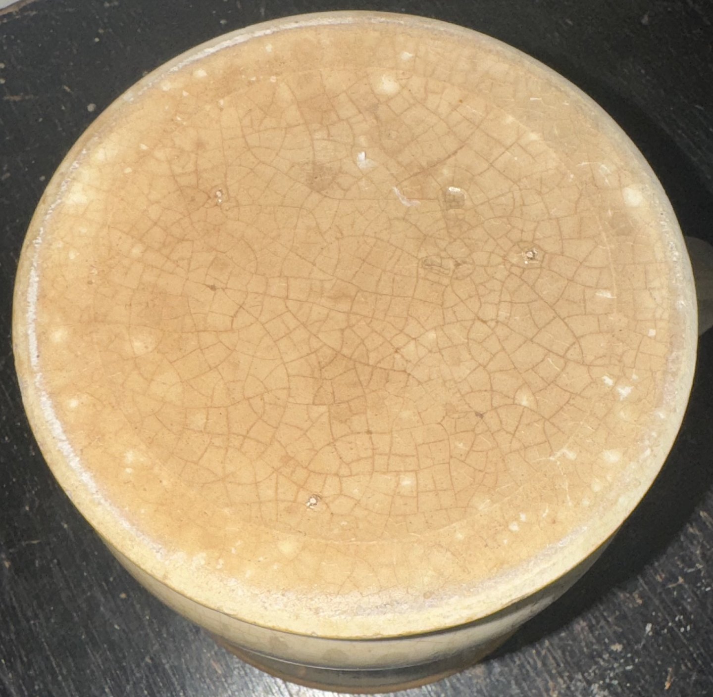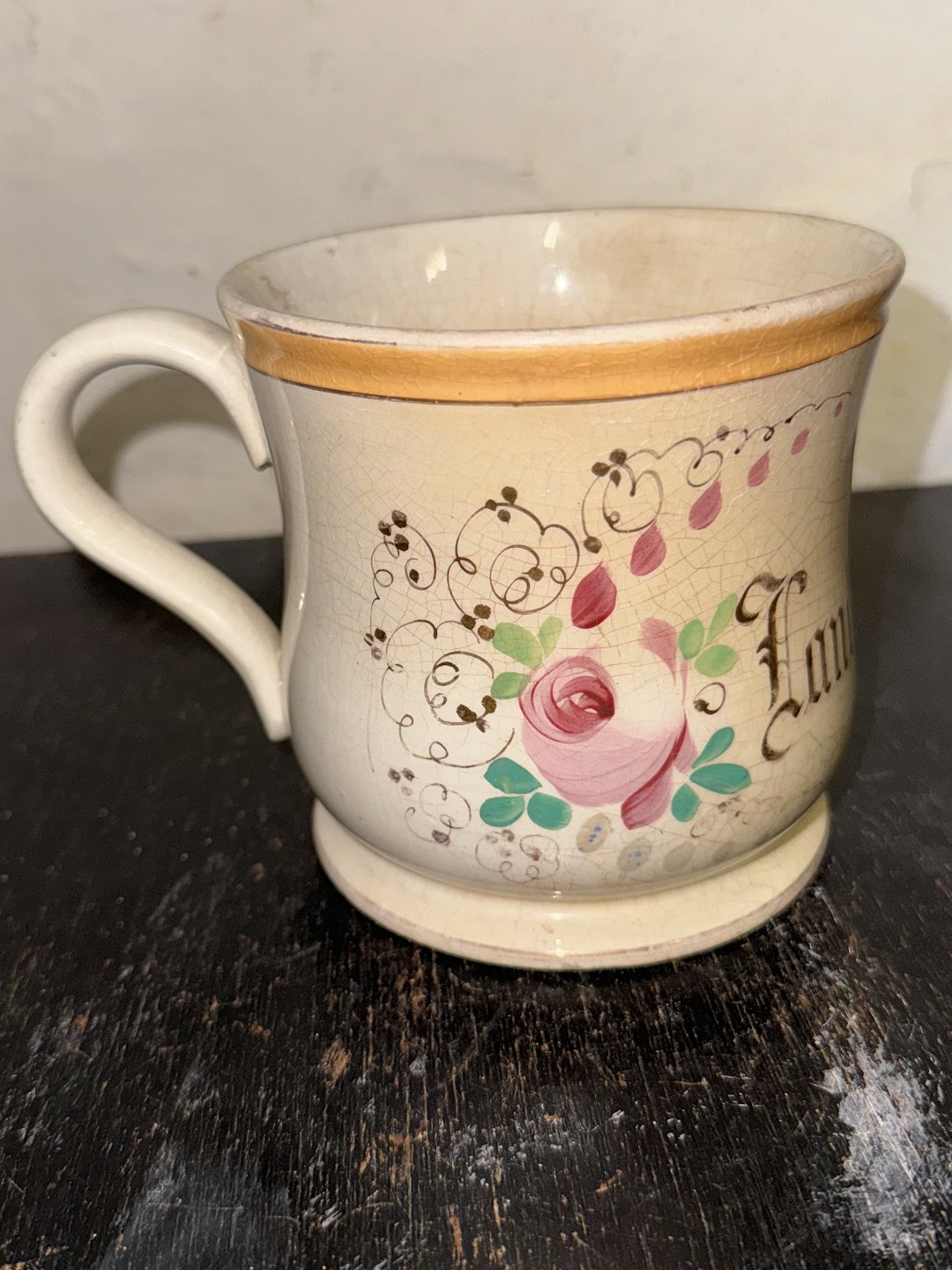 Ældre Aluminia krus i fajance med hank. Håndmalede blomster samt “Leve Landmanden” Fabriksstemplet (utydeligt) på bunden. Almindeligt brugsslid og krakkeleringer. Ingen skader eller reparationer. Mål: 11,5 cm højt