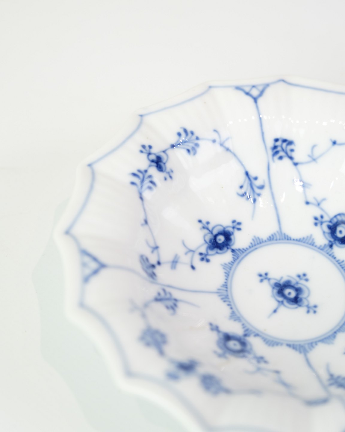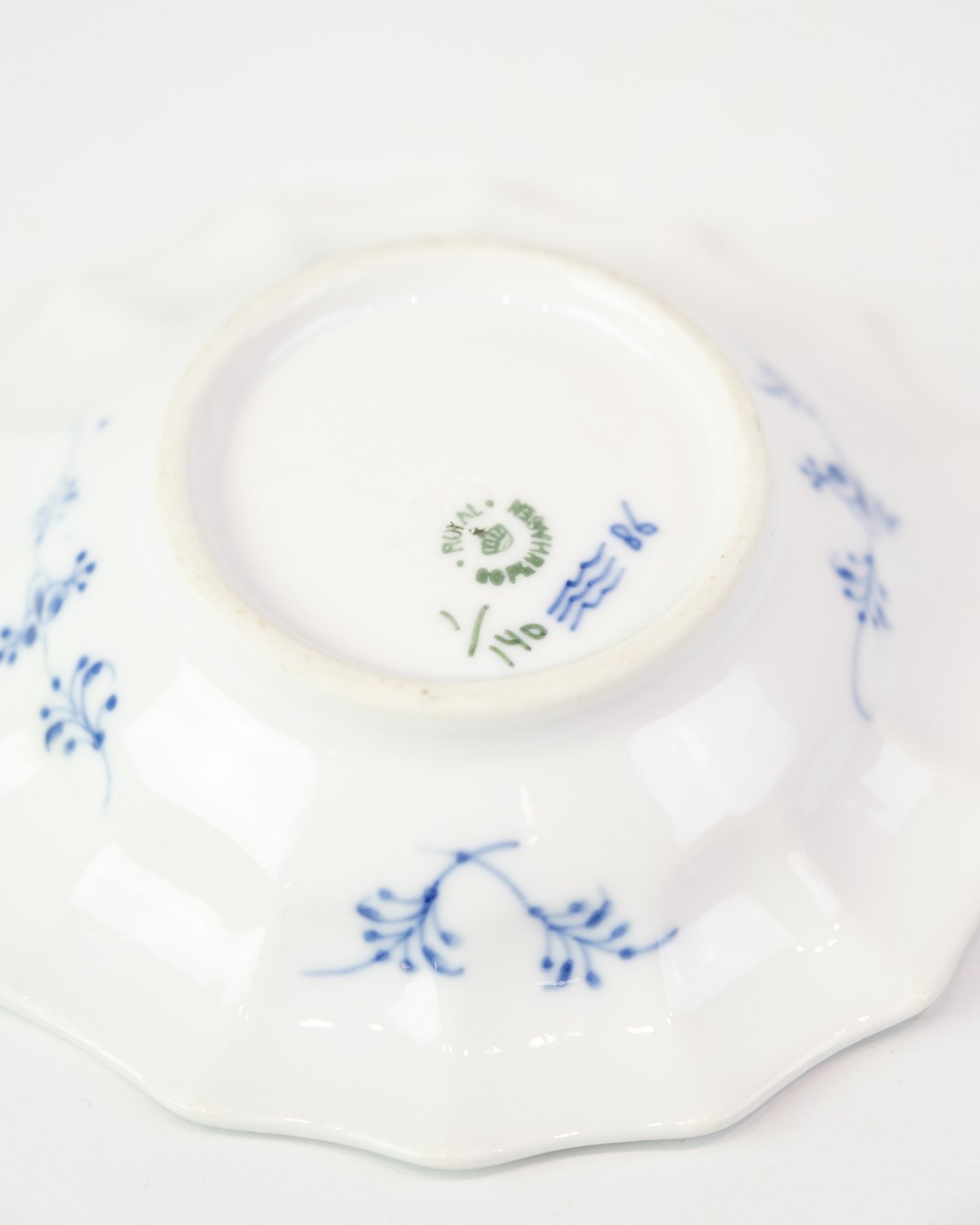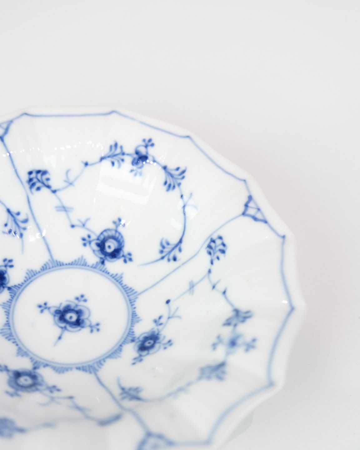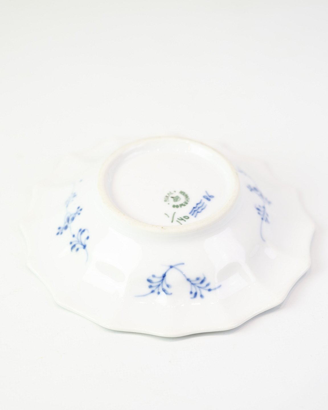 Elegante wellenförmige Schale von Royal Copenhagen im ikonischen Blaue-Gerappt-Dekor. Die Schale hat die Modellnummer 140/1 und einen Durchmesser von 15 cm. Aus handbemaltem Porzellan mit klassischer blauer Dekoration gefertigt.Material: Porzellan