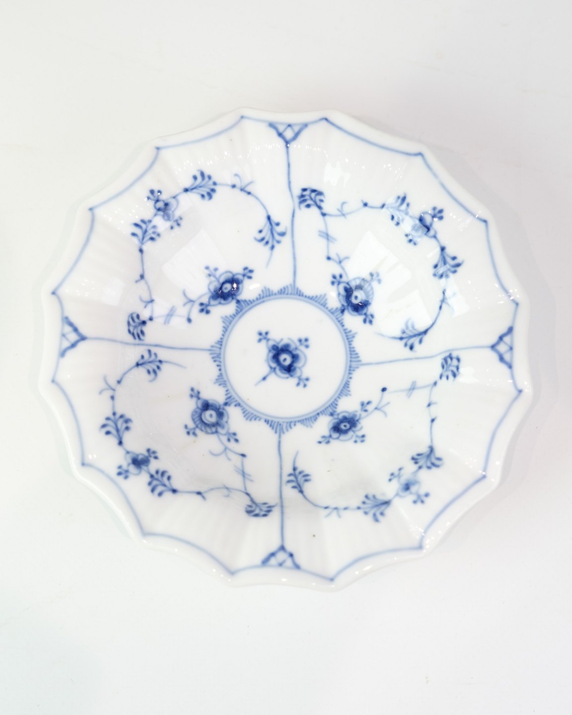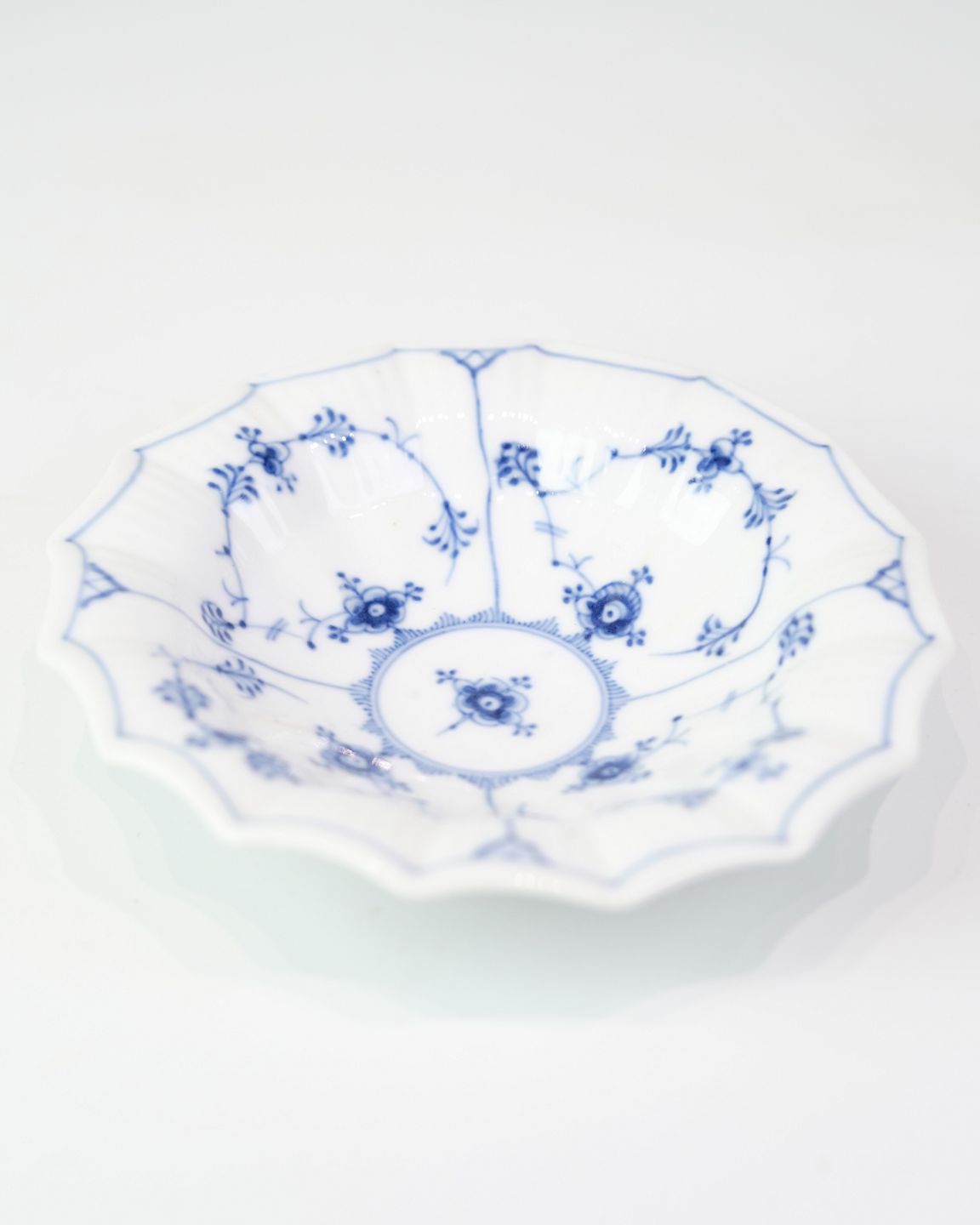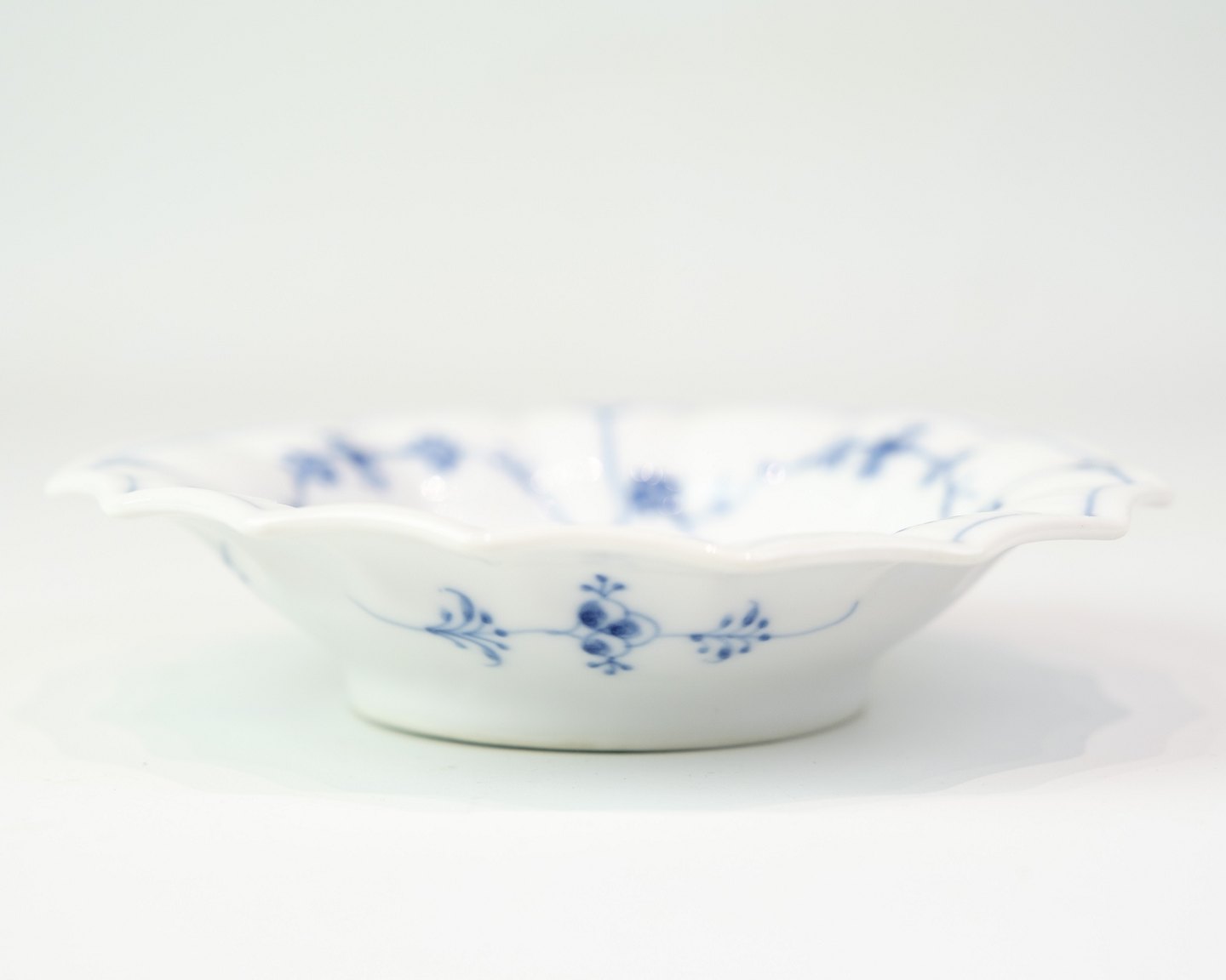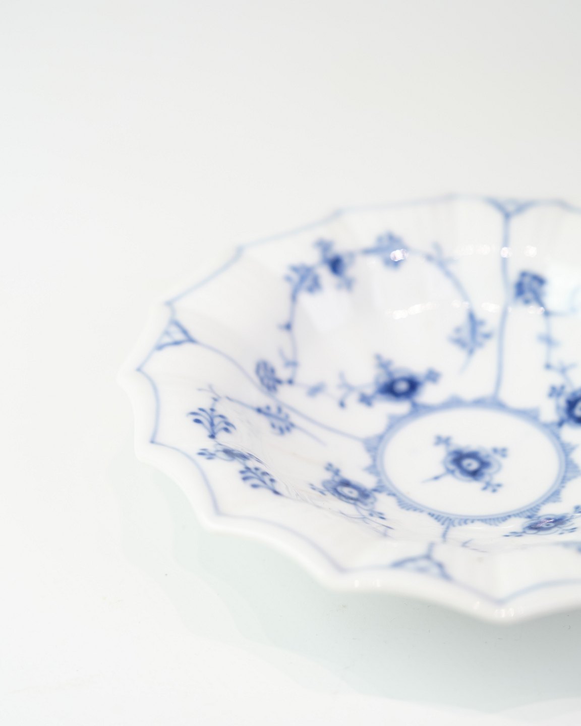 Elegante wellenförmige Schale von Royal Copenhagen im ikonischen Blaue-Gerappt-Dekor. Die Schale hat die Modellnummer 140/1 und einen Durchmesser von 15 cm. Aus handbemaltem Porzellan mit klassischer blauer Dekoration gefertigt.Material: Porzellan