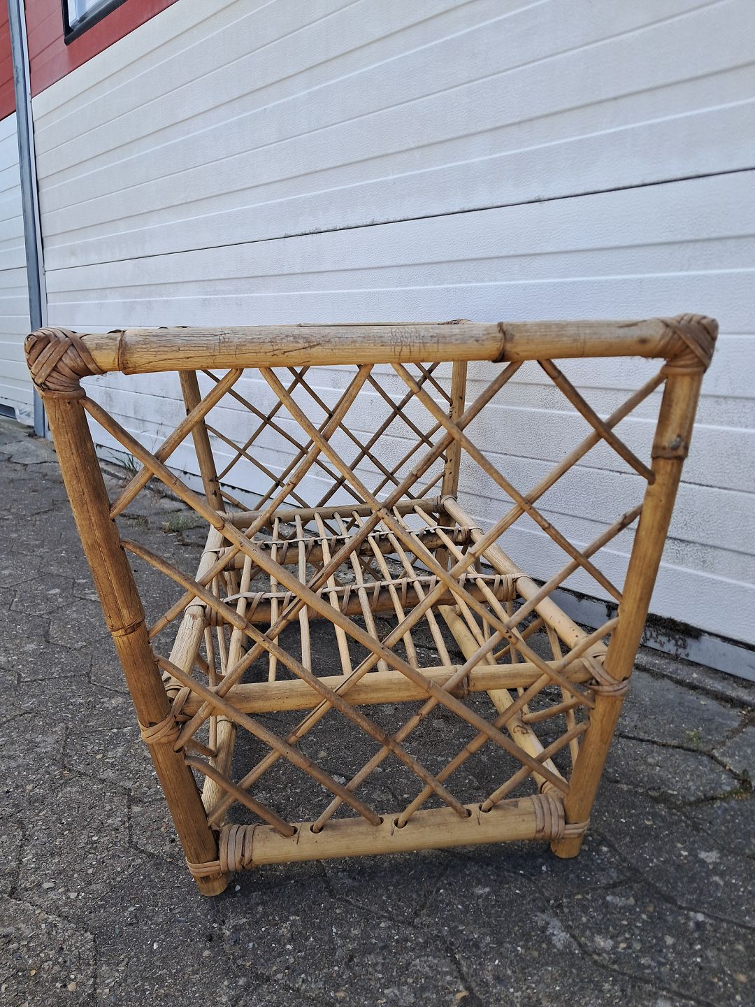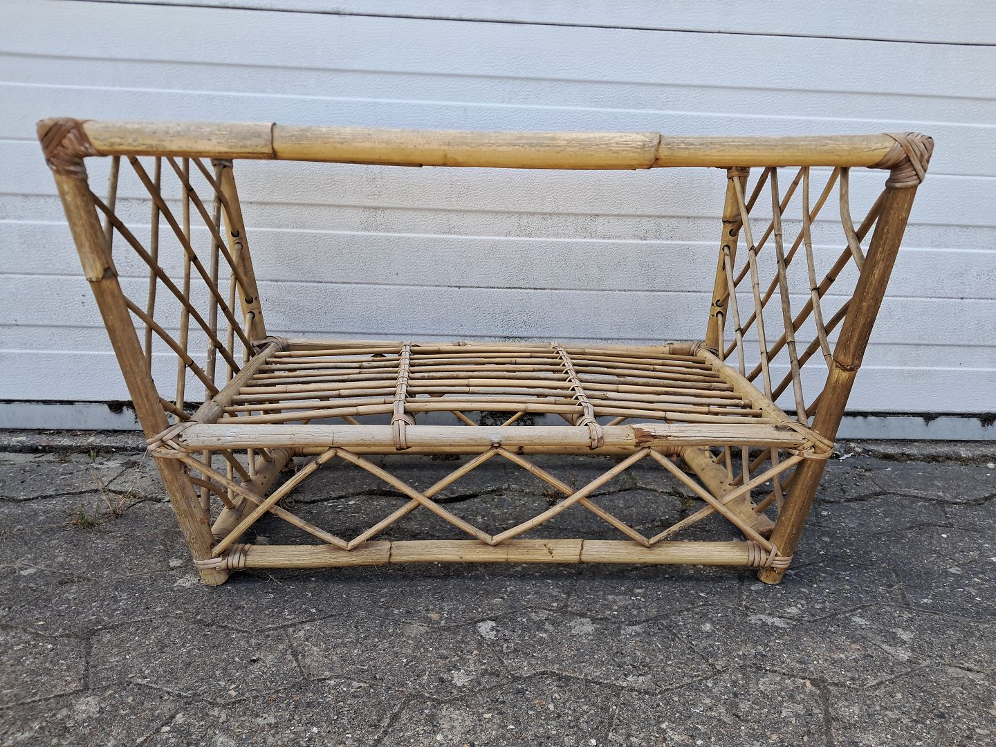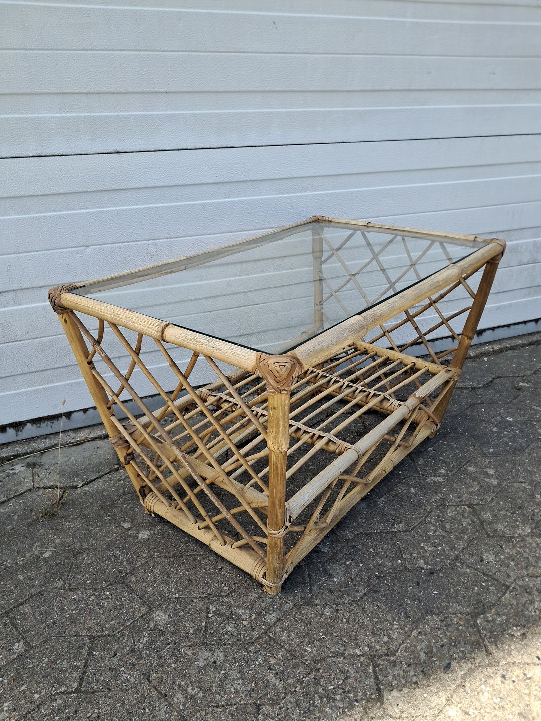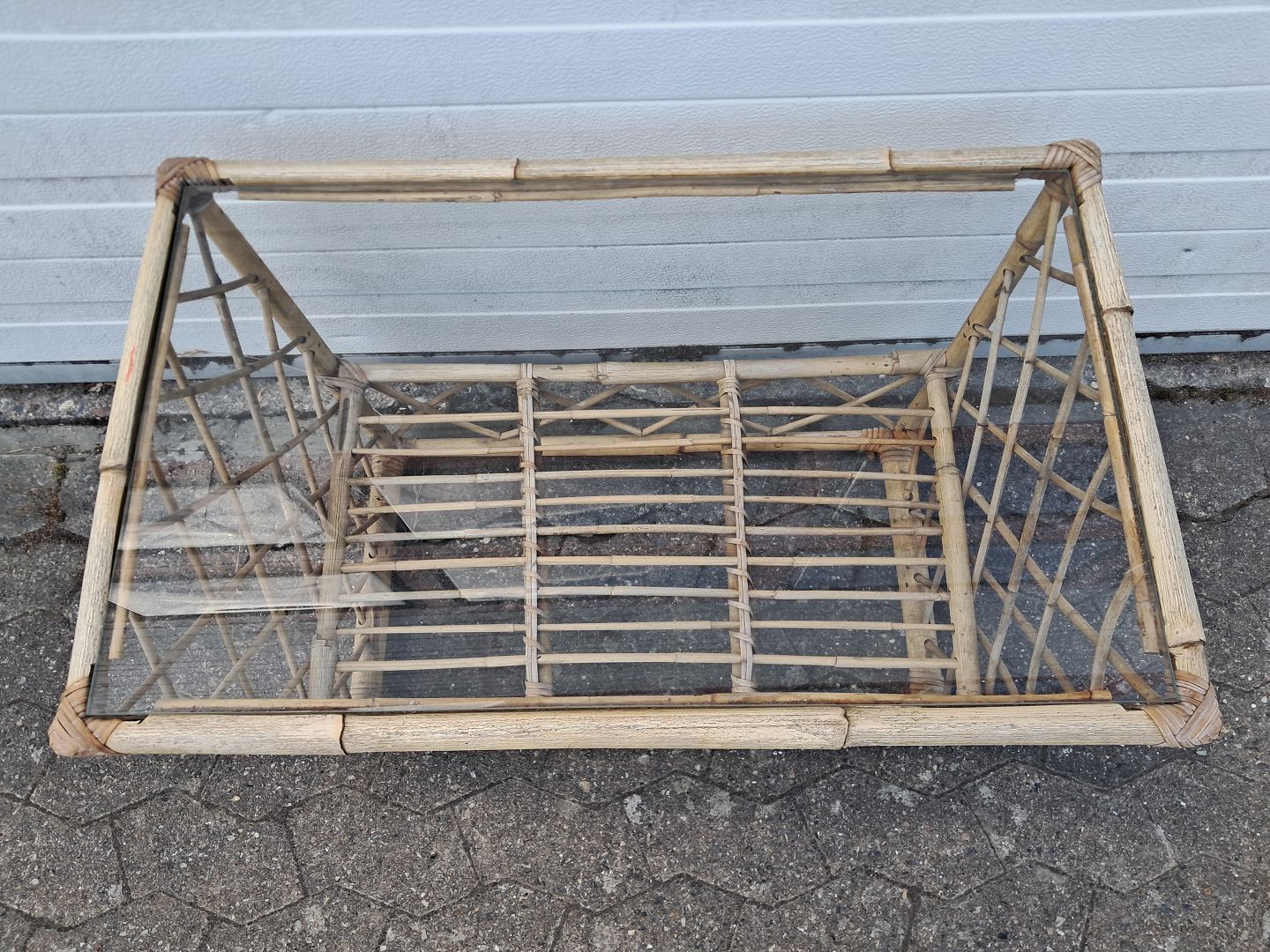 Sofabord i bambus med glasplade, fra 1970erne.Det har brugsspor.