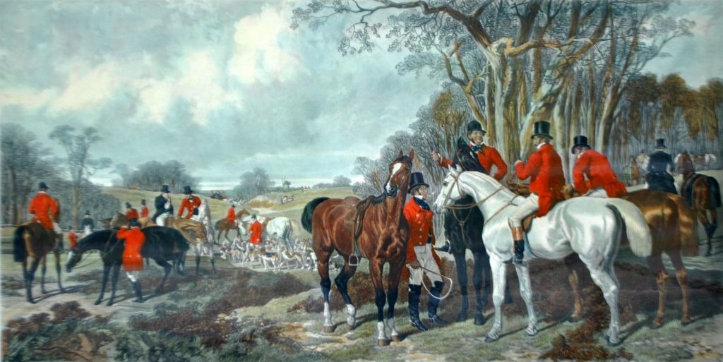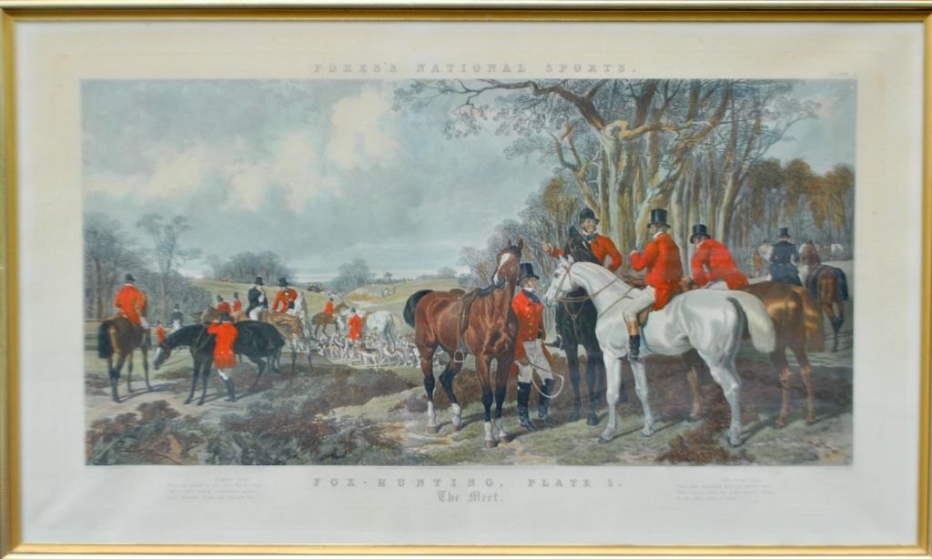 Englischer Künstler (19. Jahrhundert): Fuchsjagd, Tafel 1 „The Meet“, 1852, London, England. Handkolorierte Lithographie. Nach John Frederick Herring dem Älteren (1795–1865). Stich von J. Harris (1808–1846). Gedruckt von Fores für die National Sports-Serie. Mit Unterschriften und Gedicht. H: 62 cm. B: 107 cm.Gerahmt: H: 77 cm. B: 130 cm.