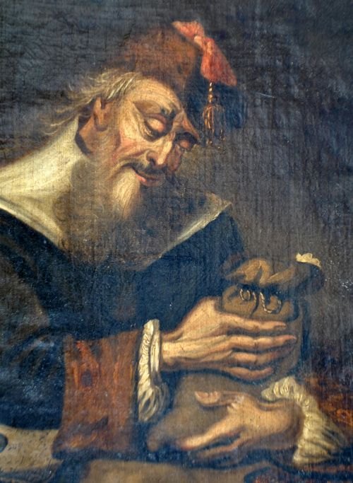 Myn, Georg van der (1727/28 - 1763) Niederlande - nach: Der Wucherer. "Der Wucherer". Schwach signiert: 1766. Öl auf Leinwand. 53 x 43.Ungerahmt.