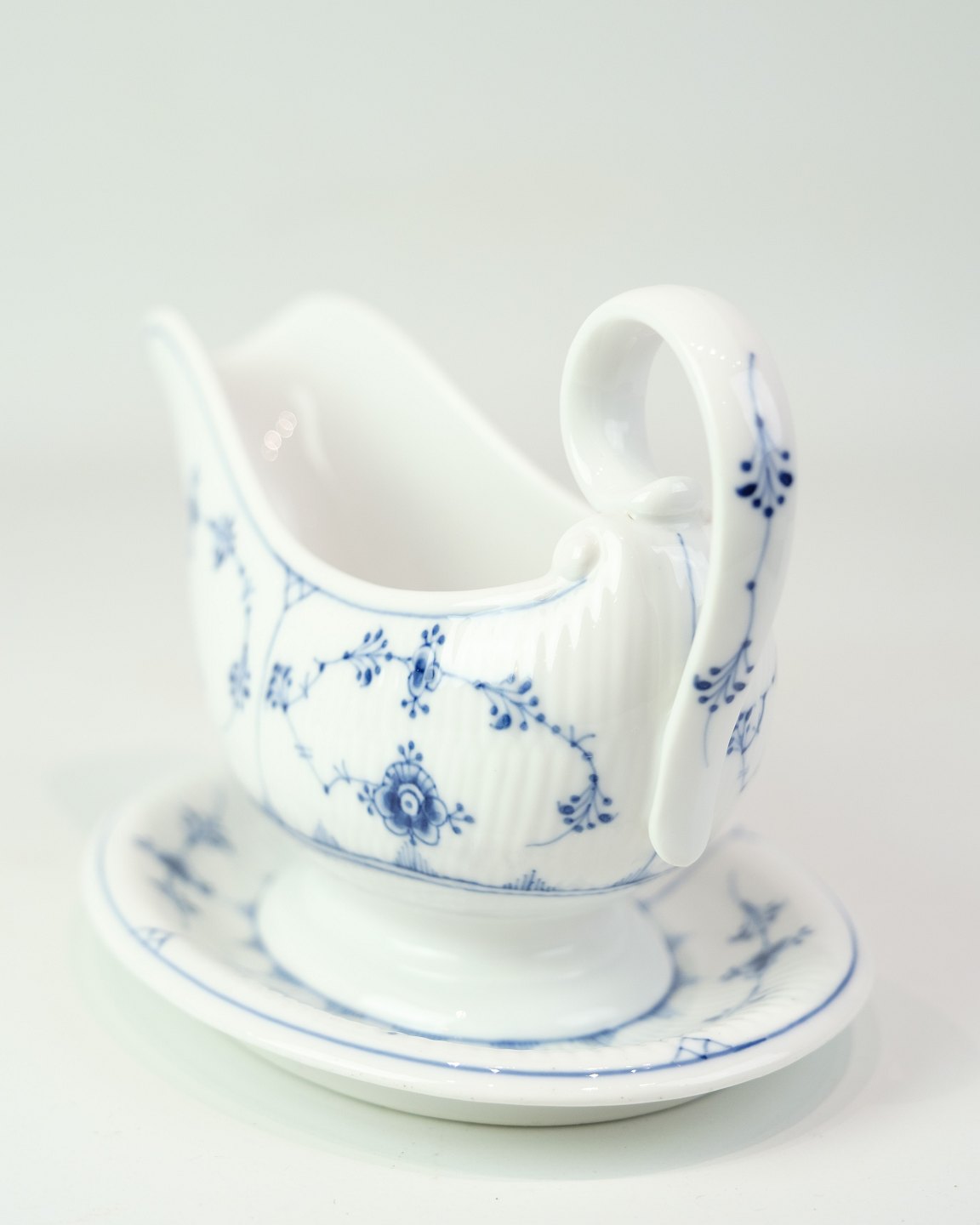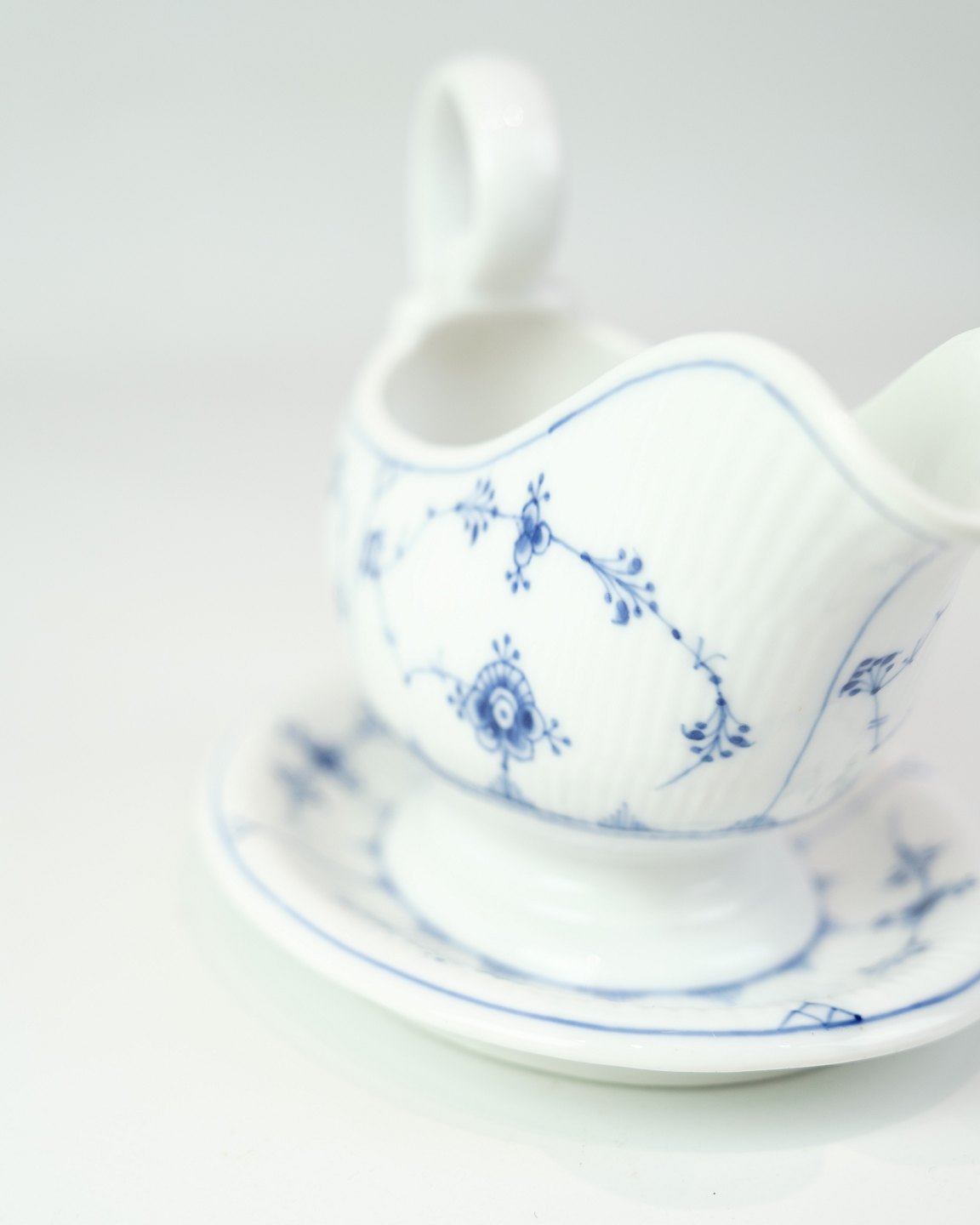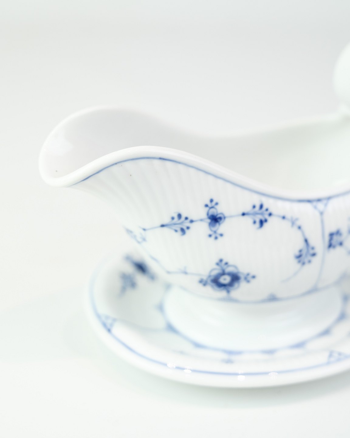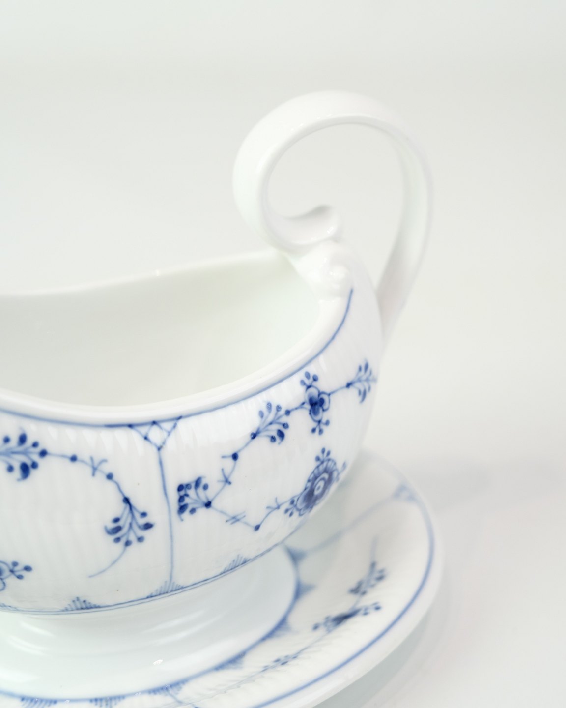 Klassische Sauciere mit passender Untertasse von Royal Copenhagen im ikonischen Blaue-Gerappt-Dekor. Das Modell ist Nr. 200 und aus handbemaltem Porzellan mit kobaltblauer Dekoration gefertigt.Material: Porzellan
