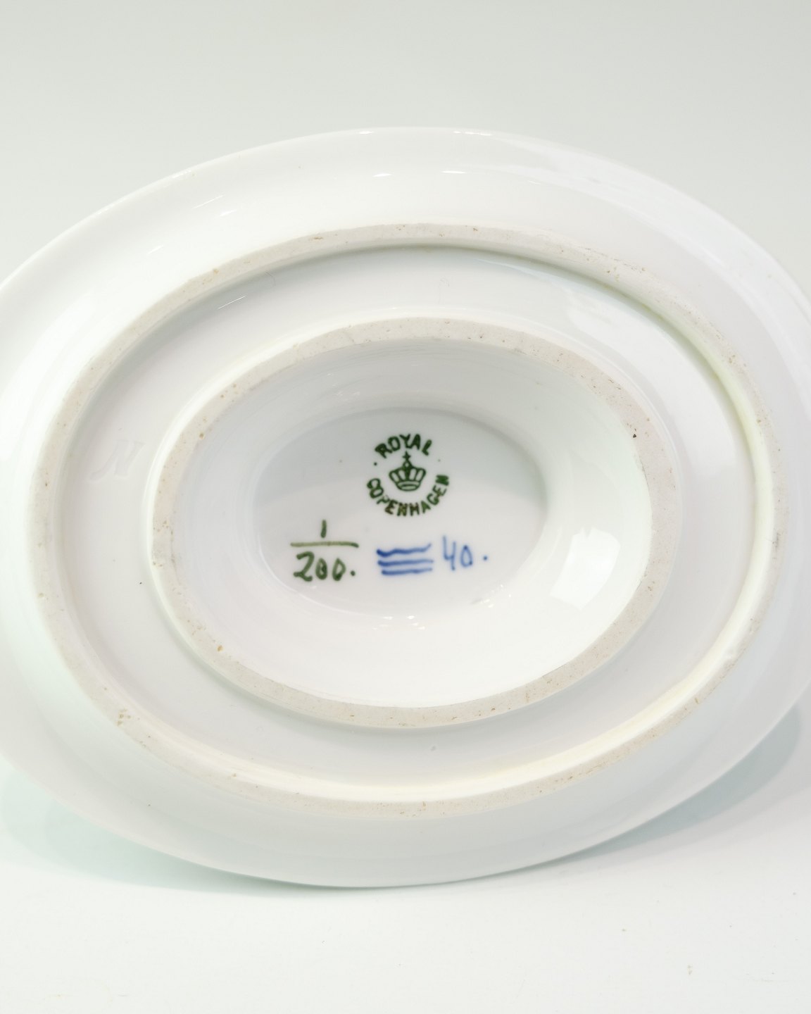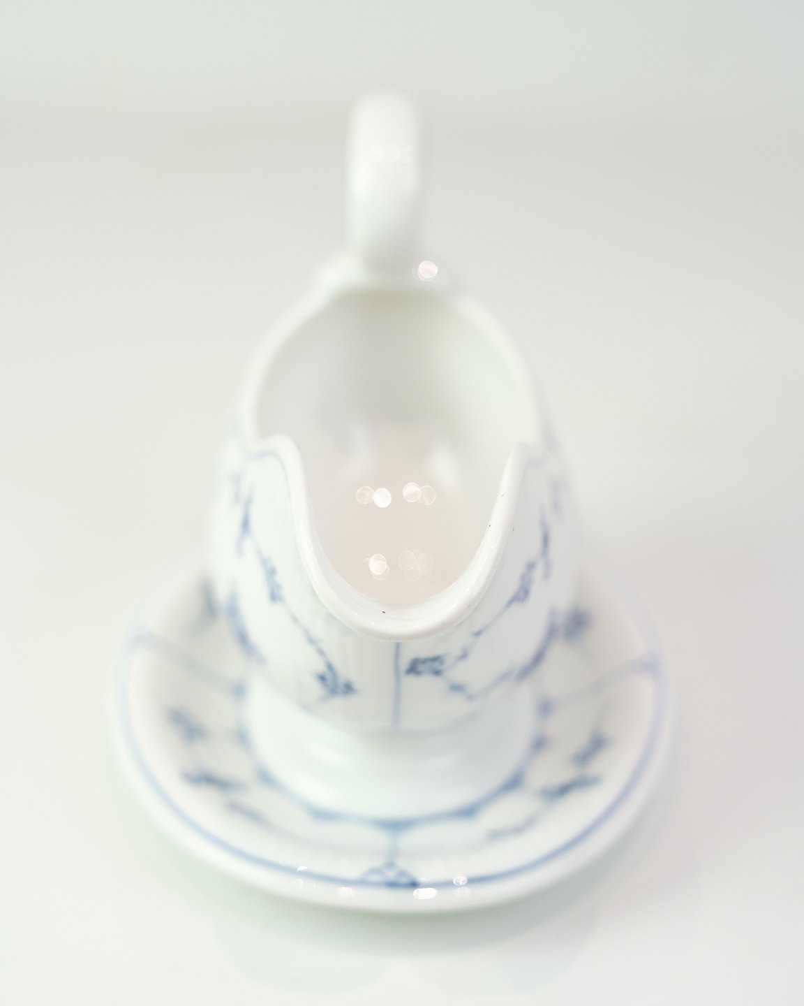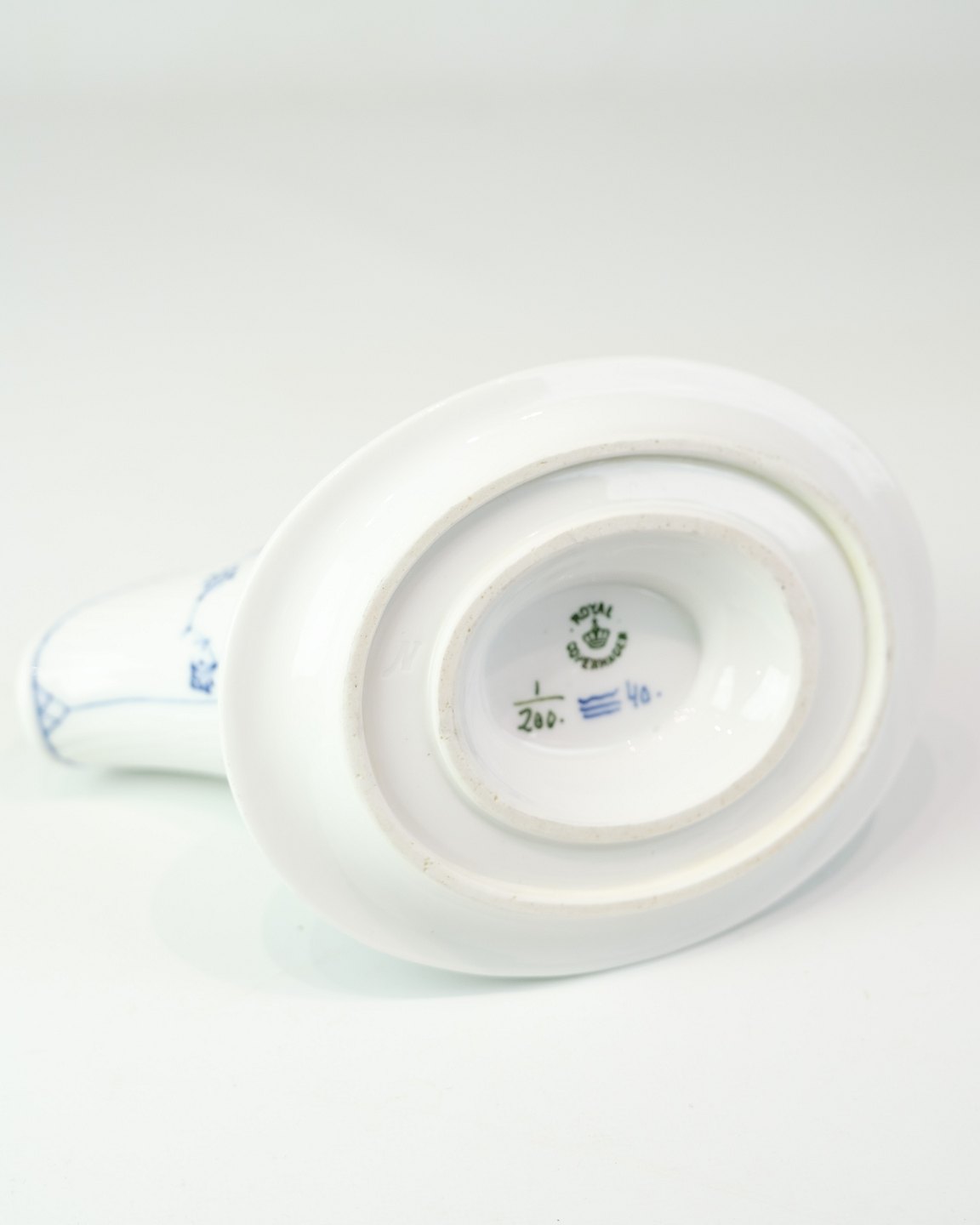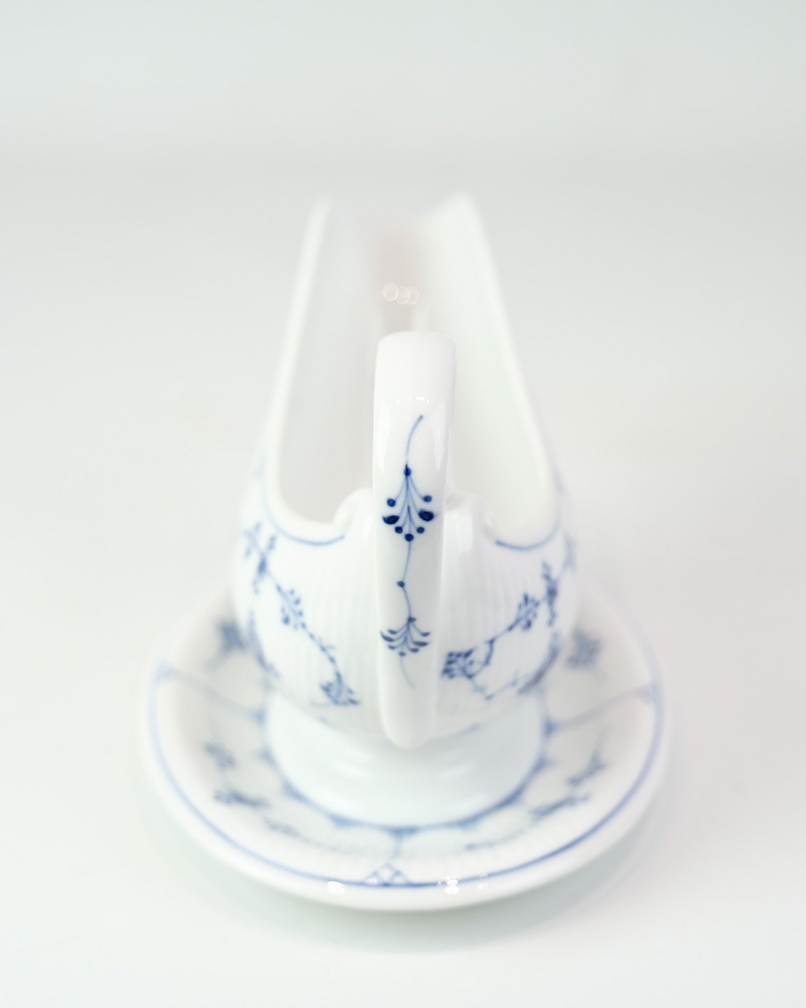Klassische Sauciere mit passender Untertasse von Royal Copenhagen im ikonischen Blaue-Gerappt-Dekor. Das Modell ist Nr. 200 und aus handbemaltem Porzellan mit kobaltblauer Dekoration gefertigt.Material: Porzellan