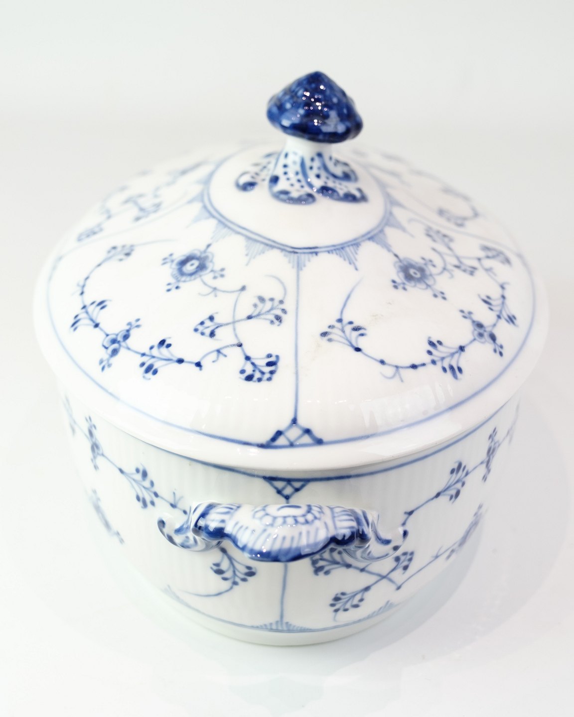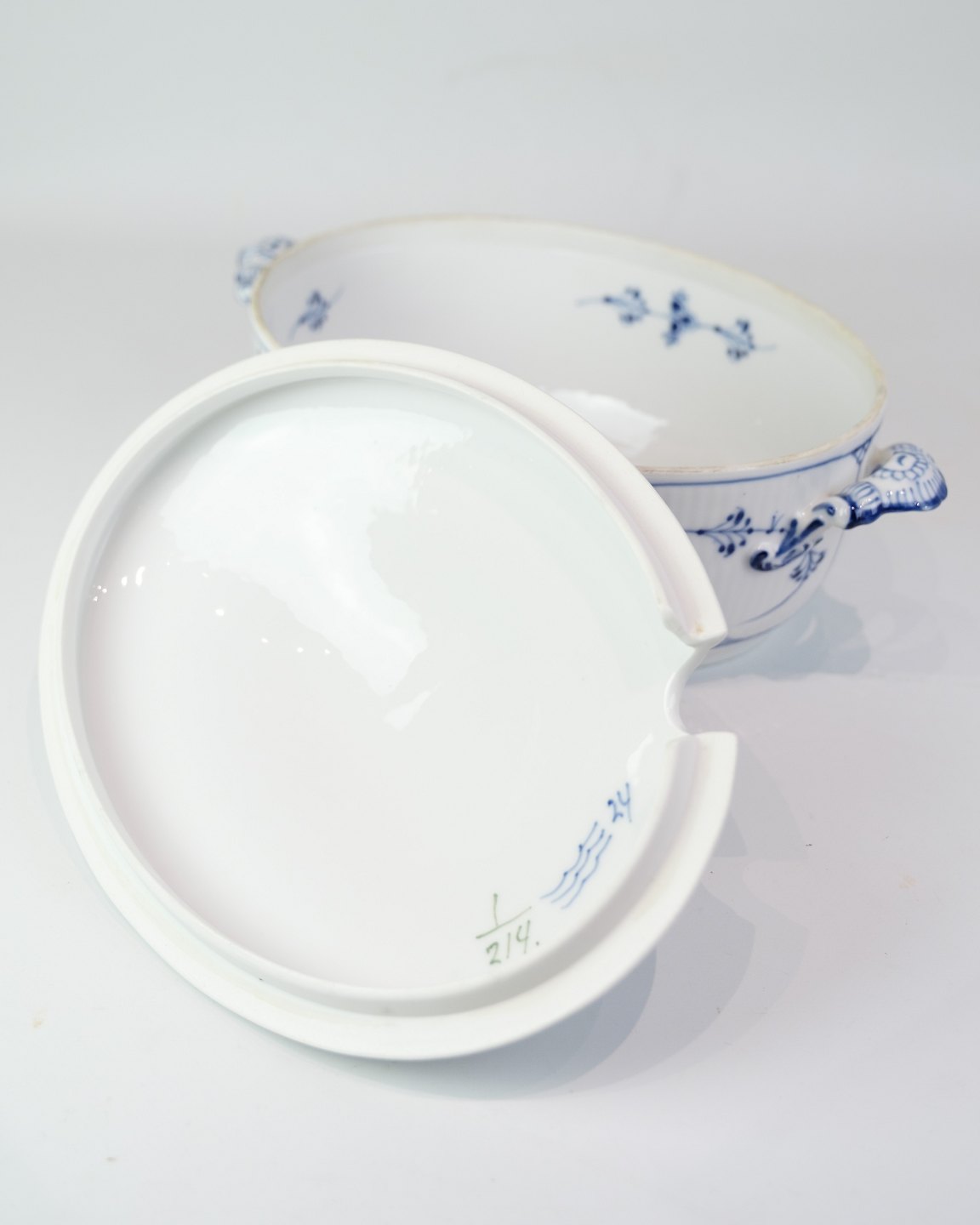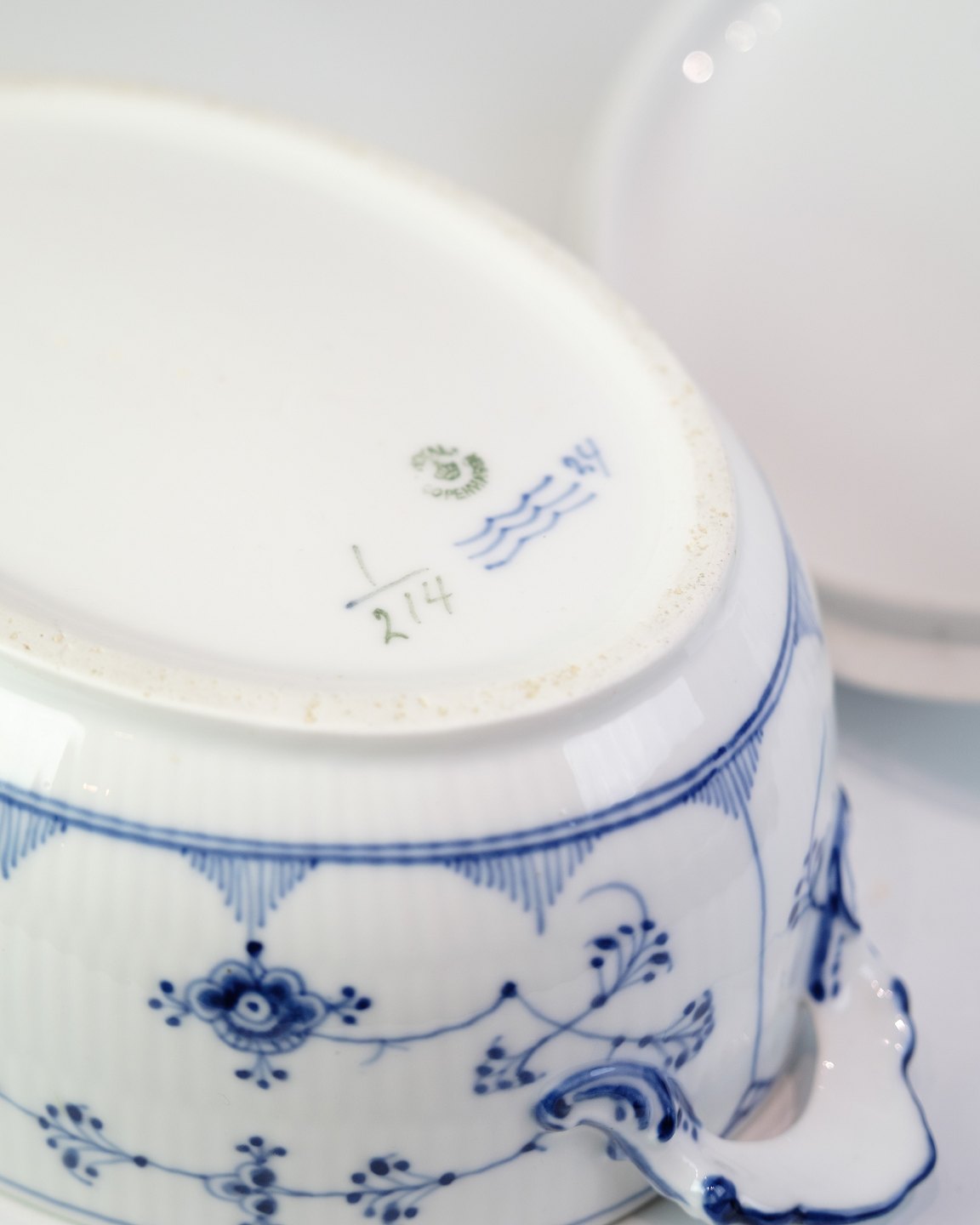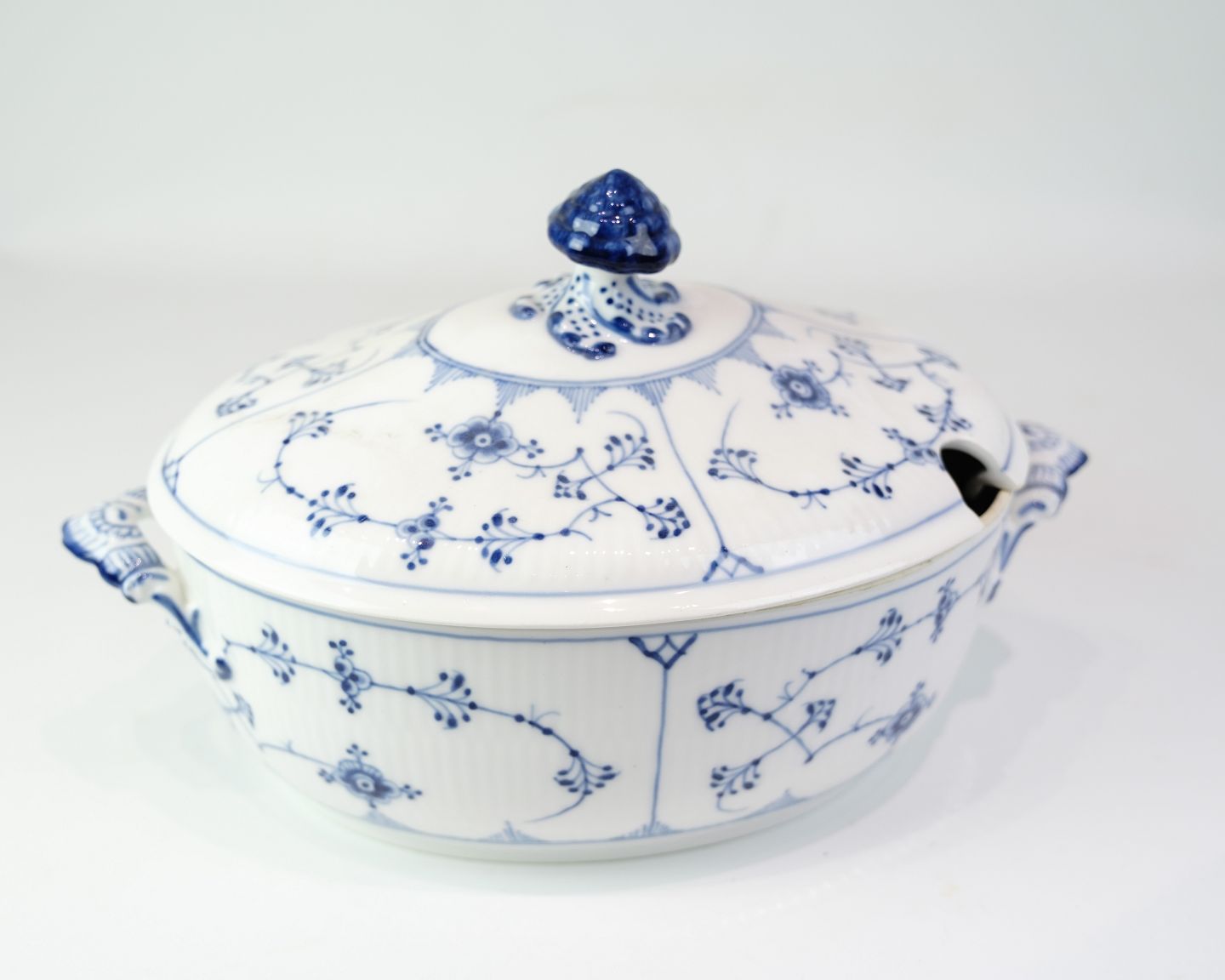 Klassische Terrine von Royal Copenhagen im zeitlosen Blaue-Gerappt-Dekor. Das Modell ist Nr. 214 und datiert auf etwa 1950.Material: Porzellan