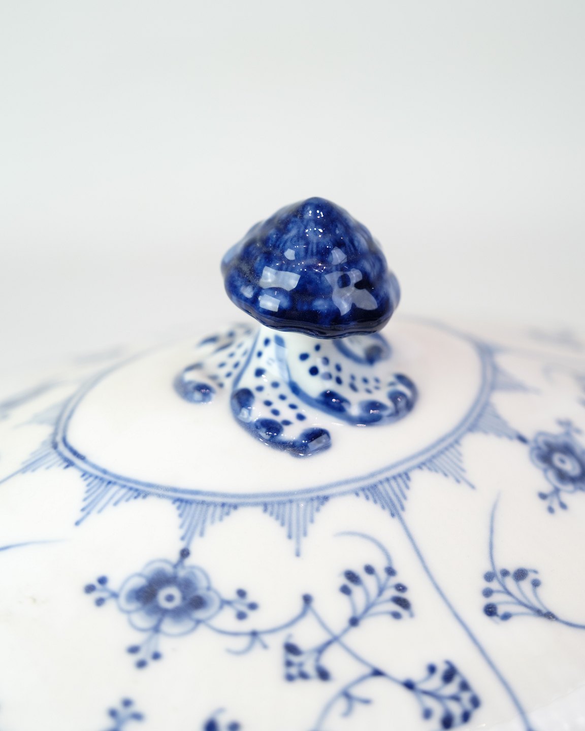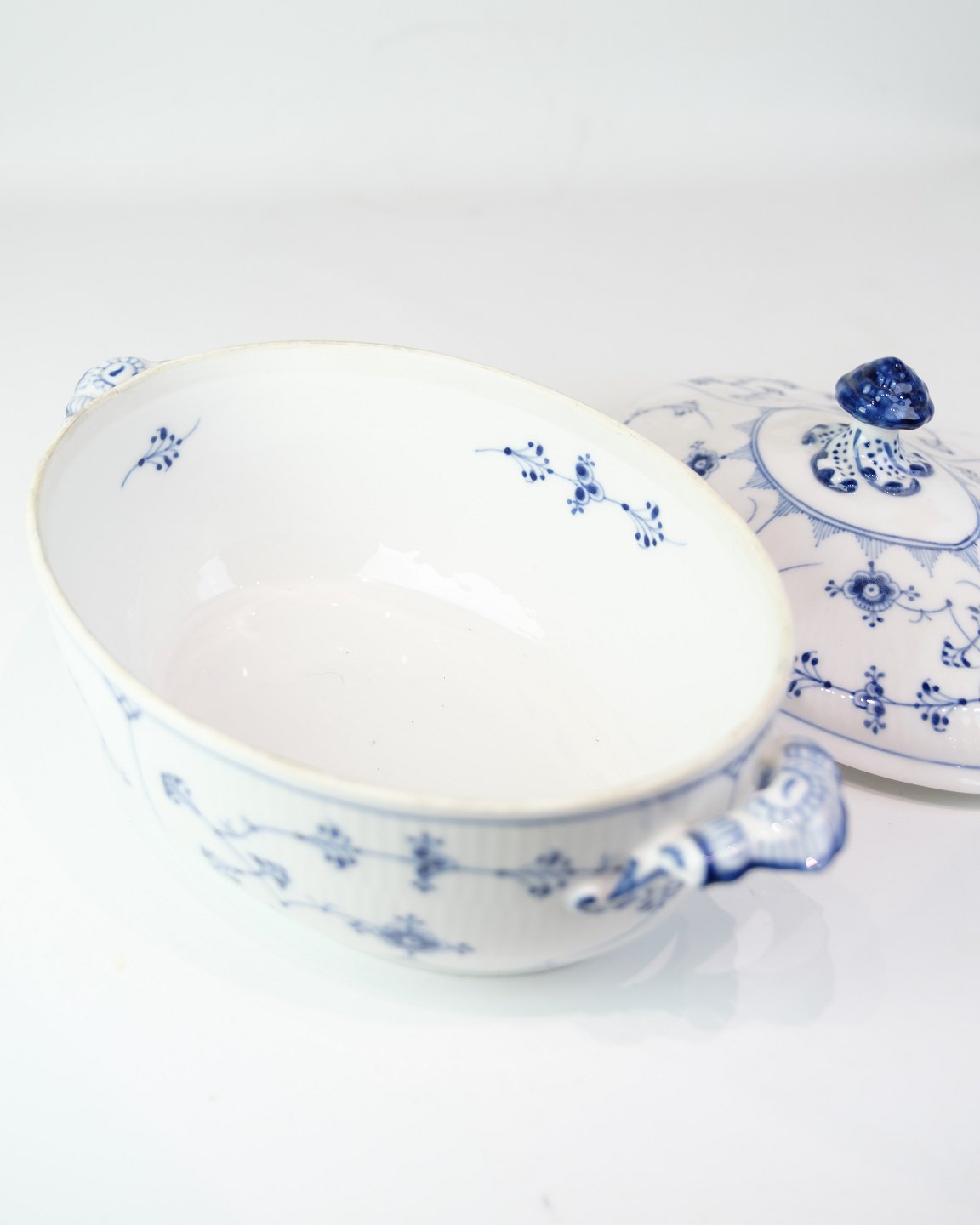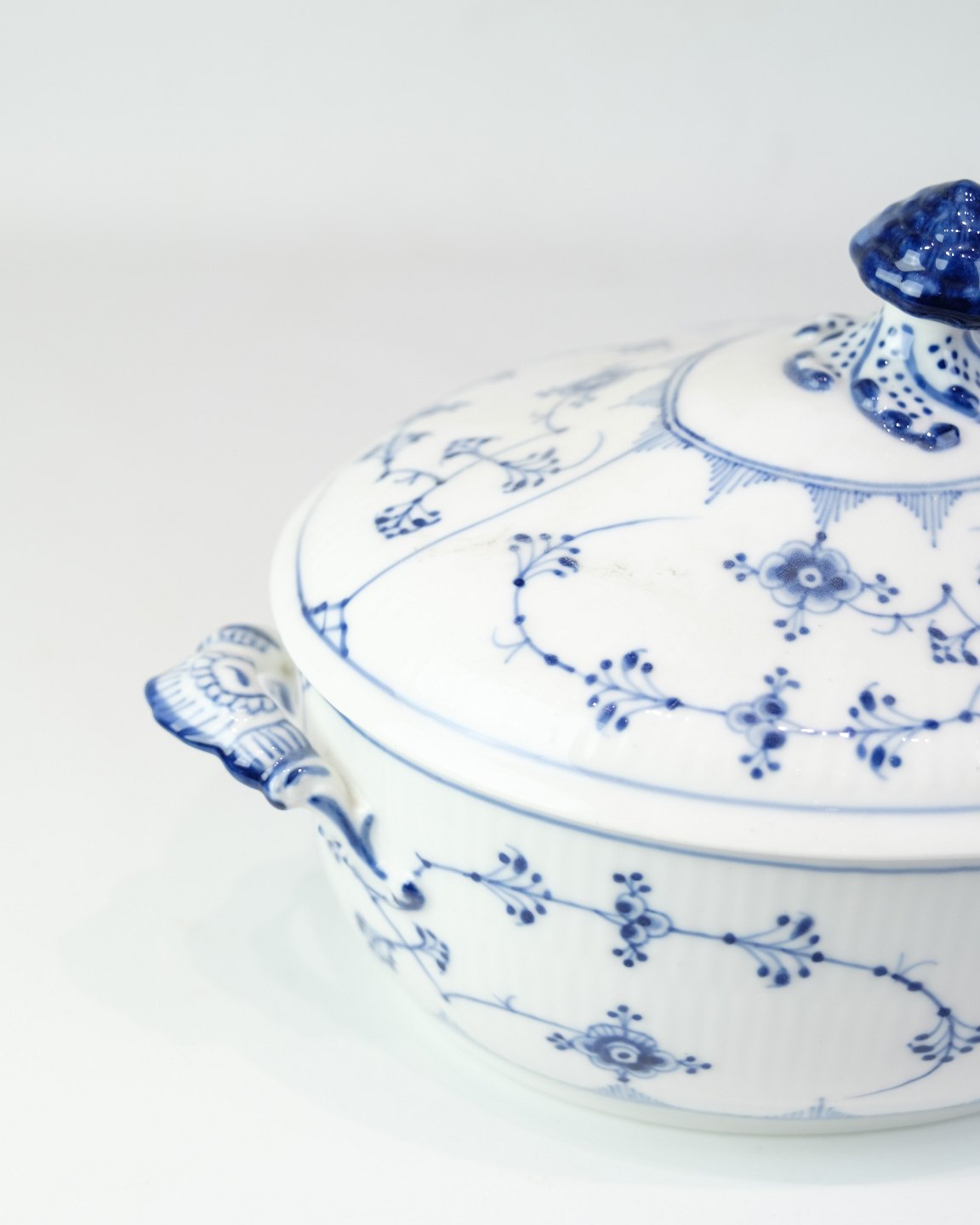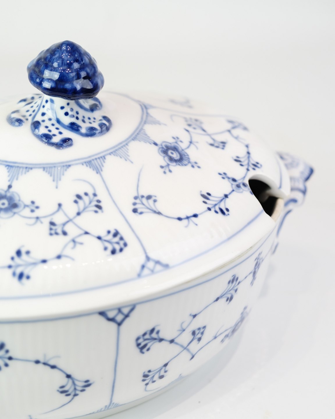 Klassische Terrine von Royal Copenhagen im zeitlosen Blaue-Gerappt-Dekor. Das Modell ist Nr. 214 und datiert auf etwa 1950.Material: Porzellan