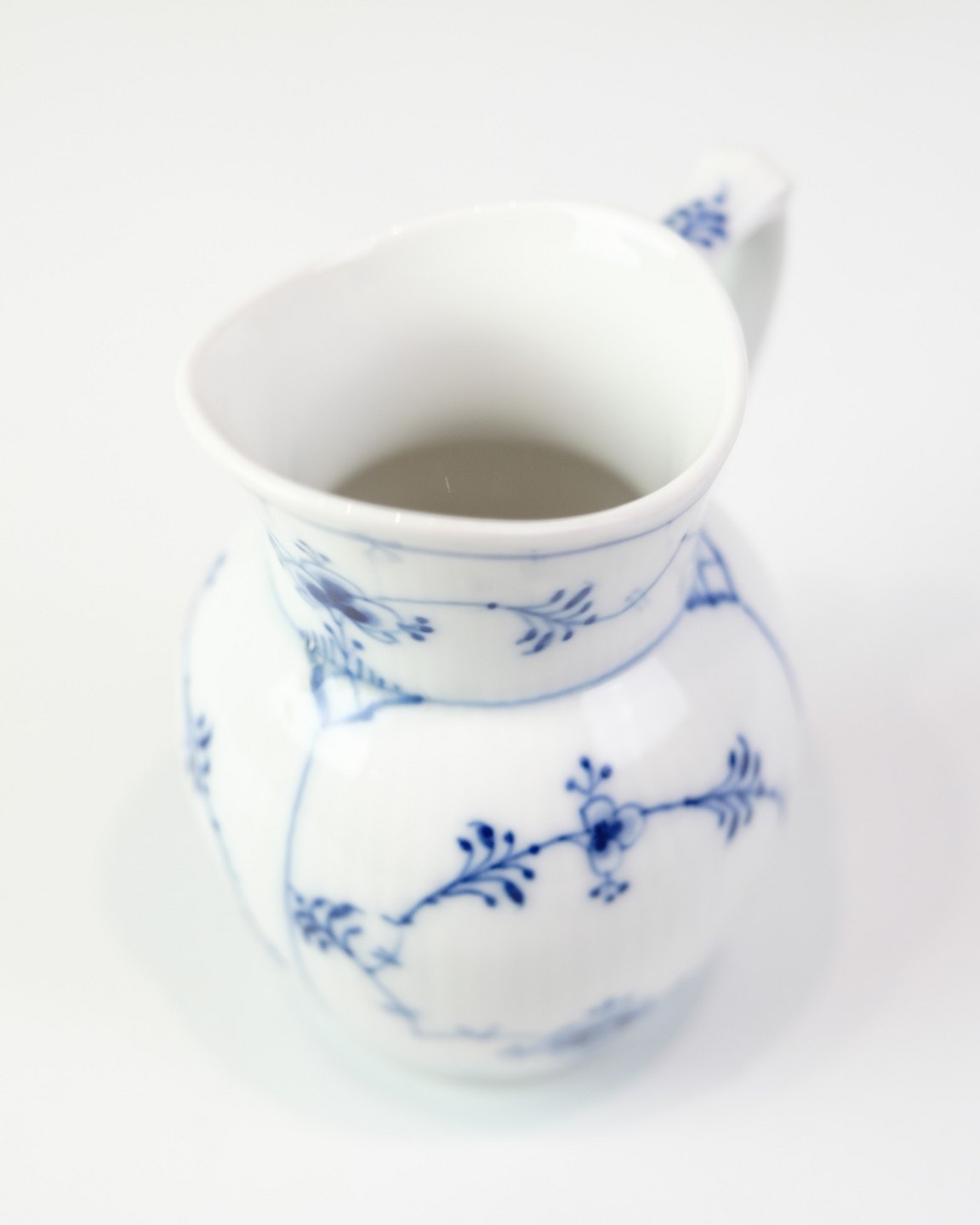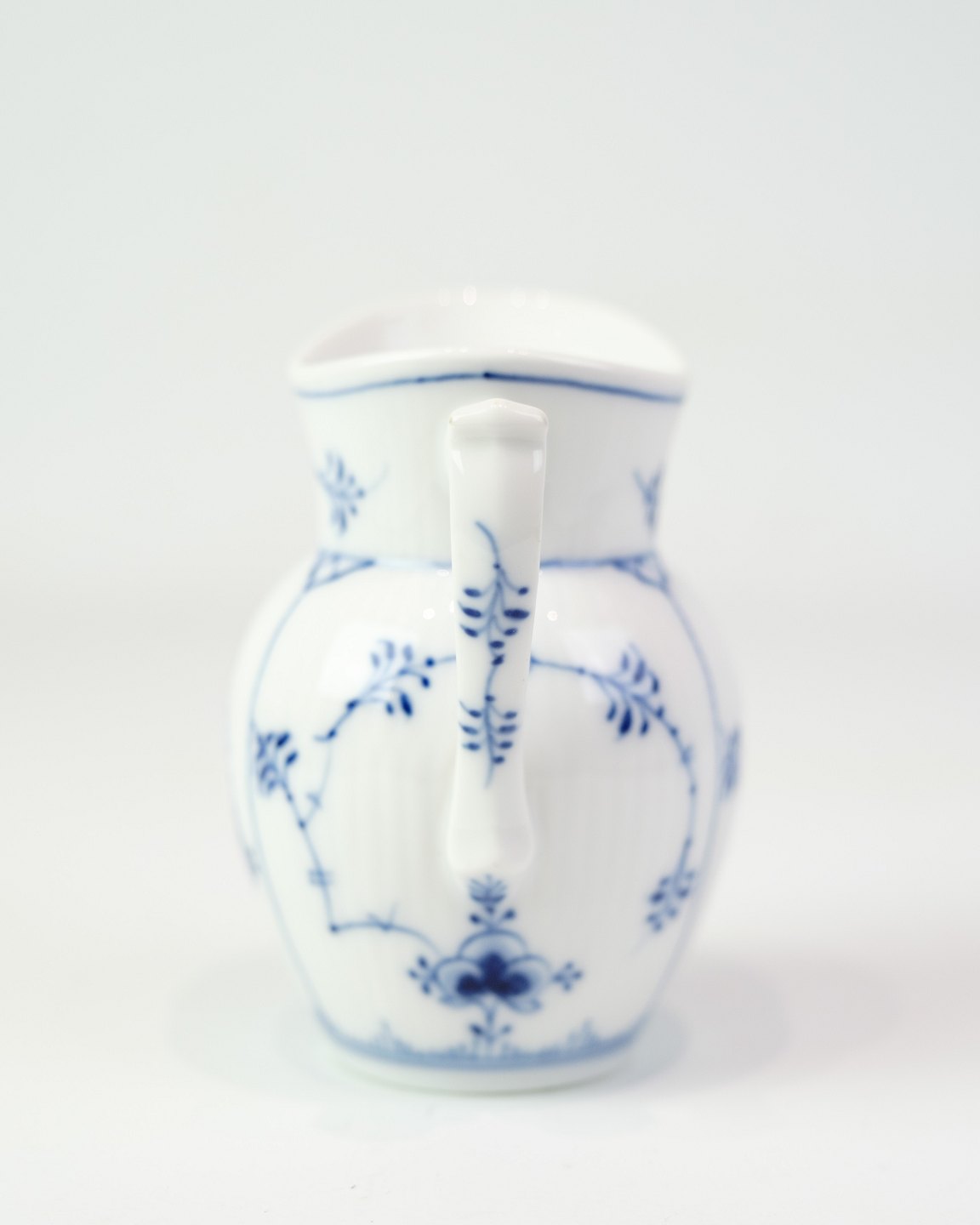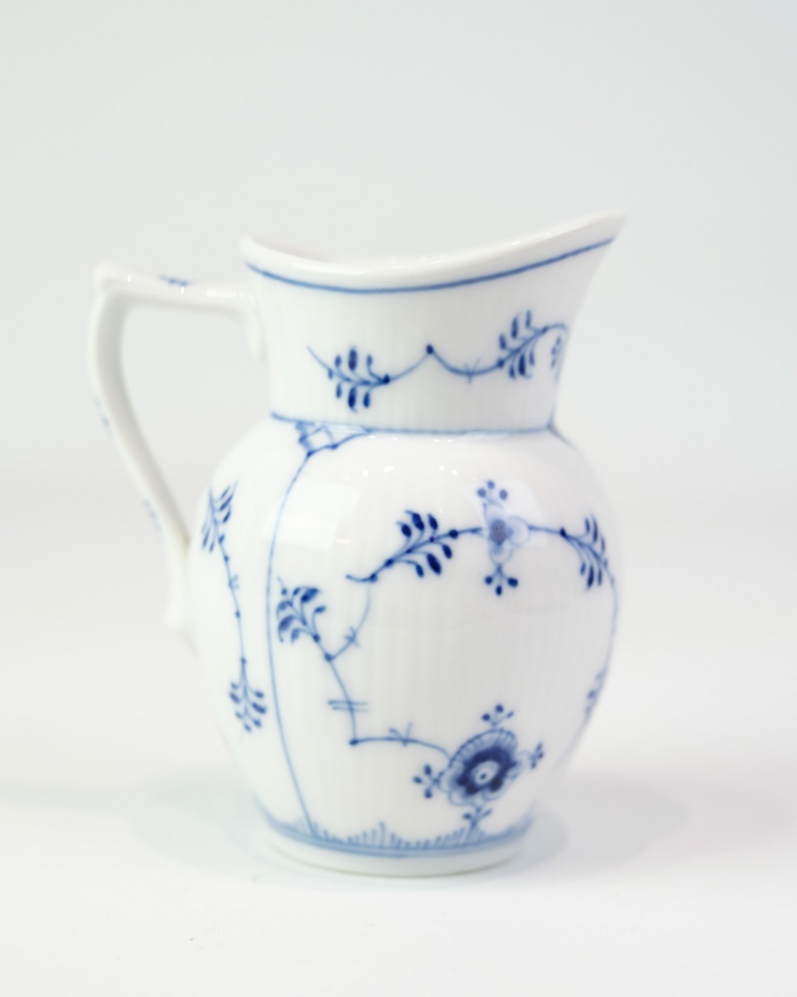 Fin lille flødekande fra Royal Copenhagen, udført i det klassiske musselmalede riflet mønster. Model No. 1/60, håndmalet i det klassiske mønster og stemplet som 1. sortering. Materiale: Porcelæn