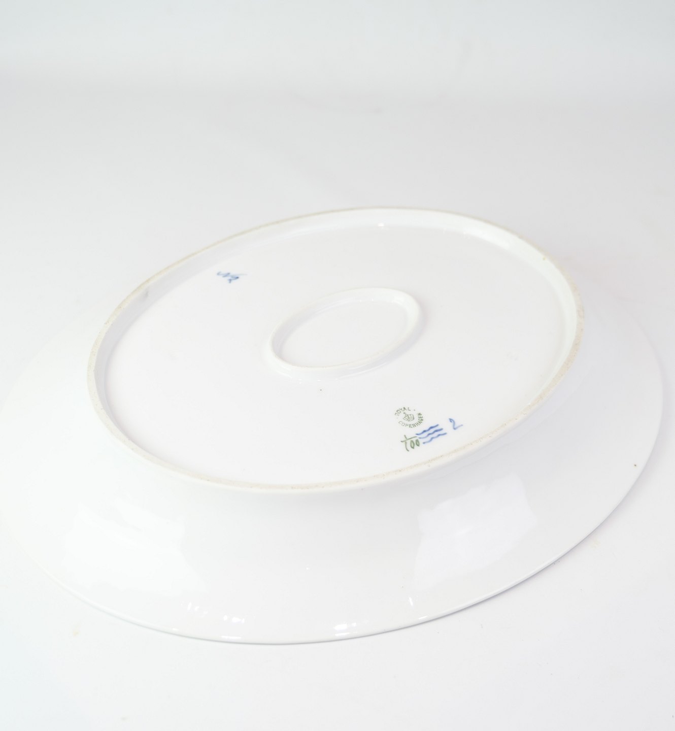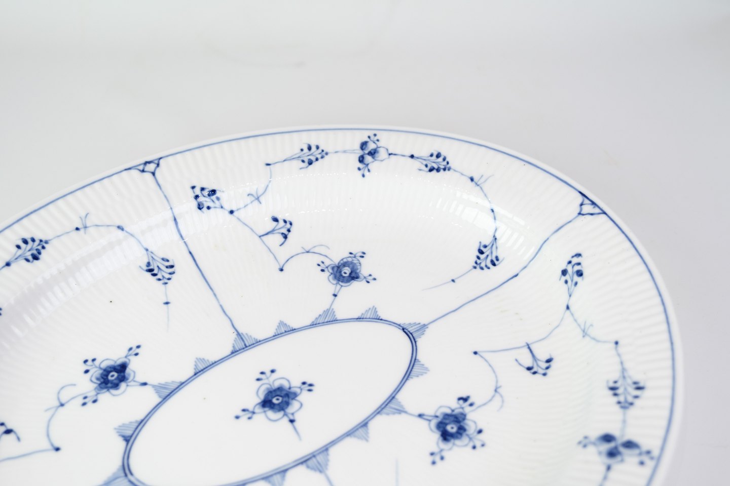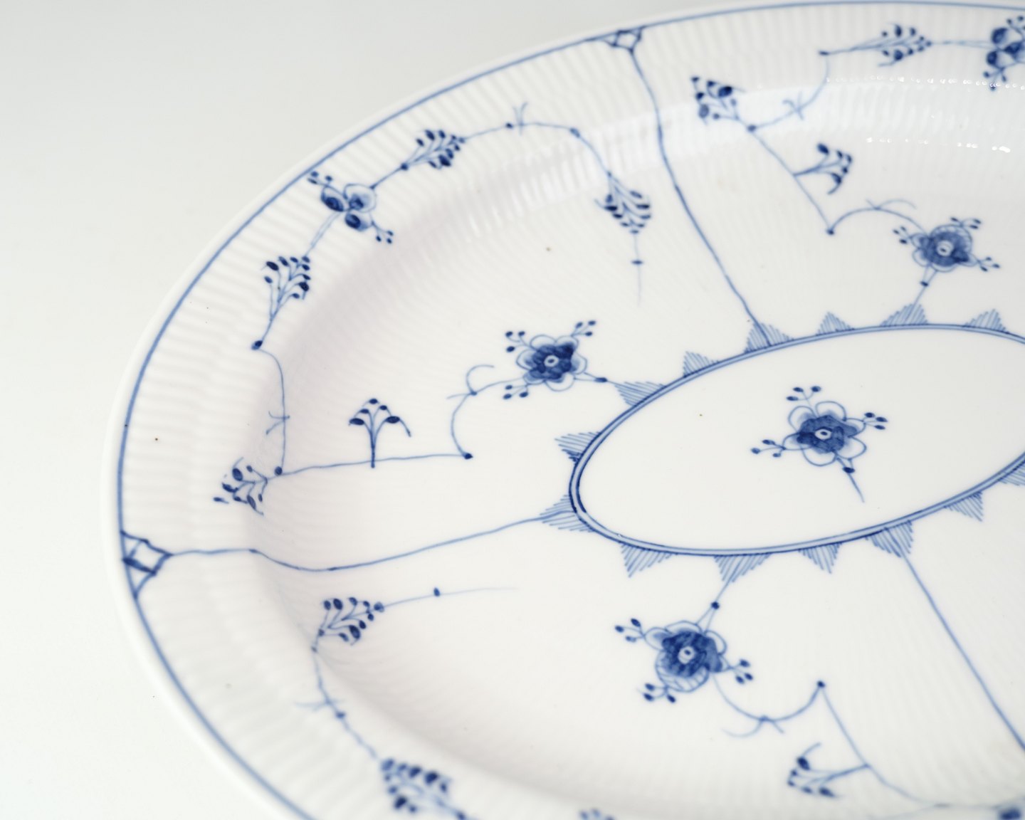 Große Servierplatte von Royal Copenhagen im klassischen Blaue-Gerappt-Dekor. Entworfen von Arnold Krog im späten 19. Jahrhundert und gekennzeichnet durch die elegante blaue Dekoration und das gerippte Porzellan.Material: Porzellan
