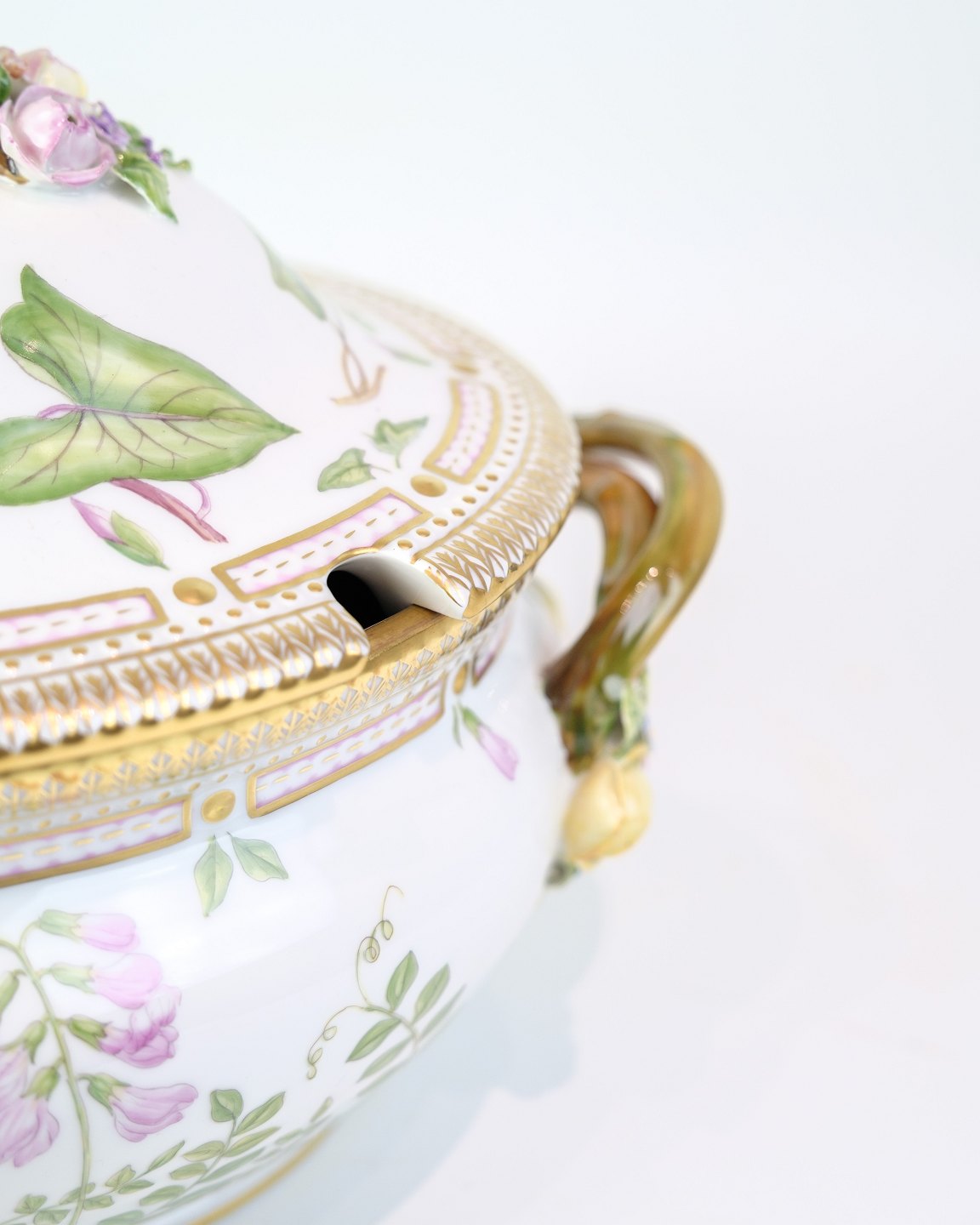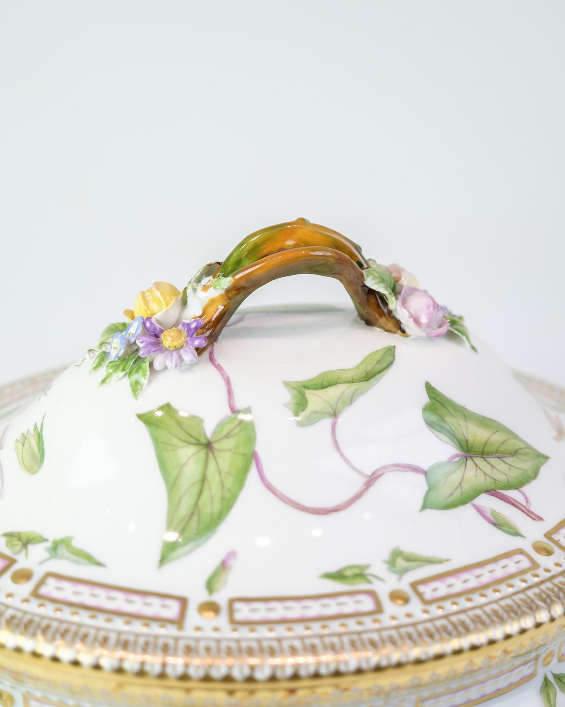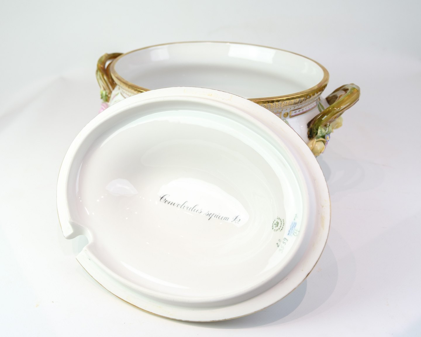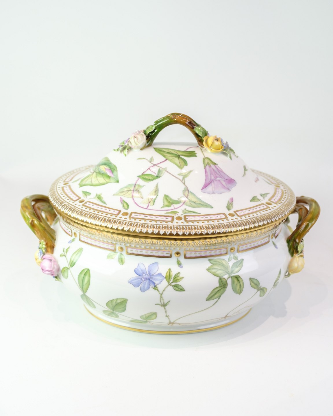 Terrine aus der Flora-Danica-Serie von Royal Copenhagen, aus Porzellan gefertigt und handbemalt mit Dekor Nr. 20/3559. Die Terrine ist reich mit naturgetreuen Blumen dekoriert und mit einem Deckelgriff sowie zwei Seitengriffen versehen, die als Zweigmotive mit Blumen und Blättern in Farben gestaltet sind.Material: Porzellan