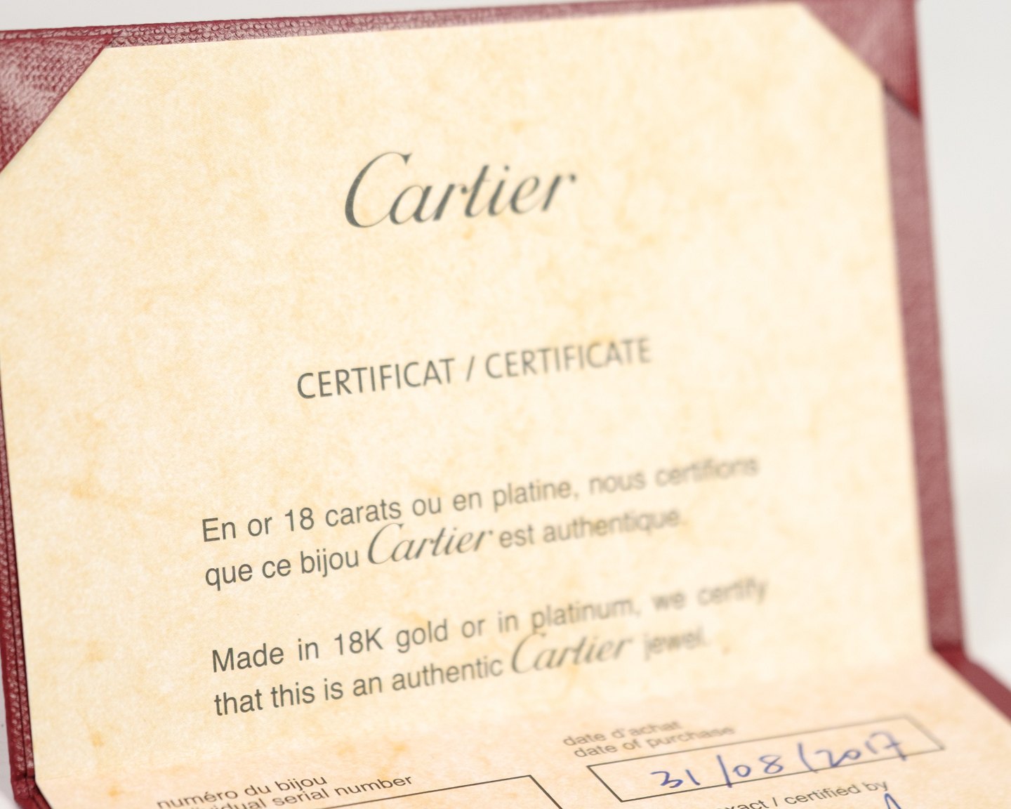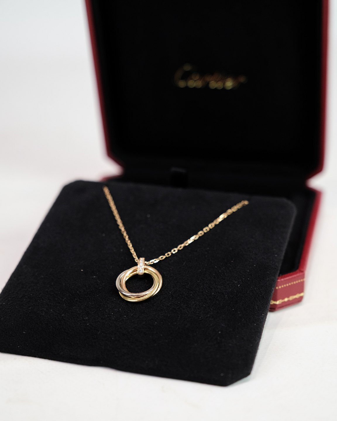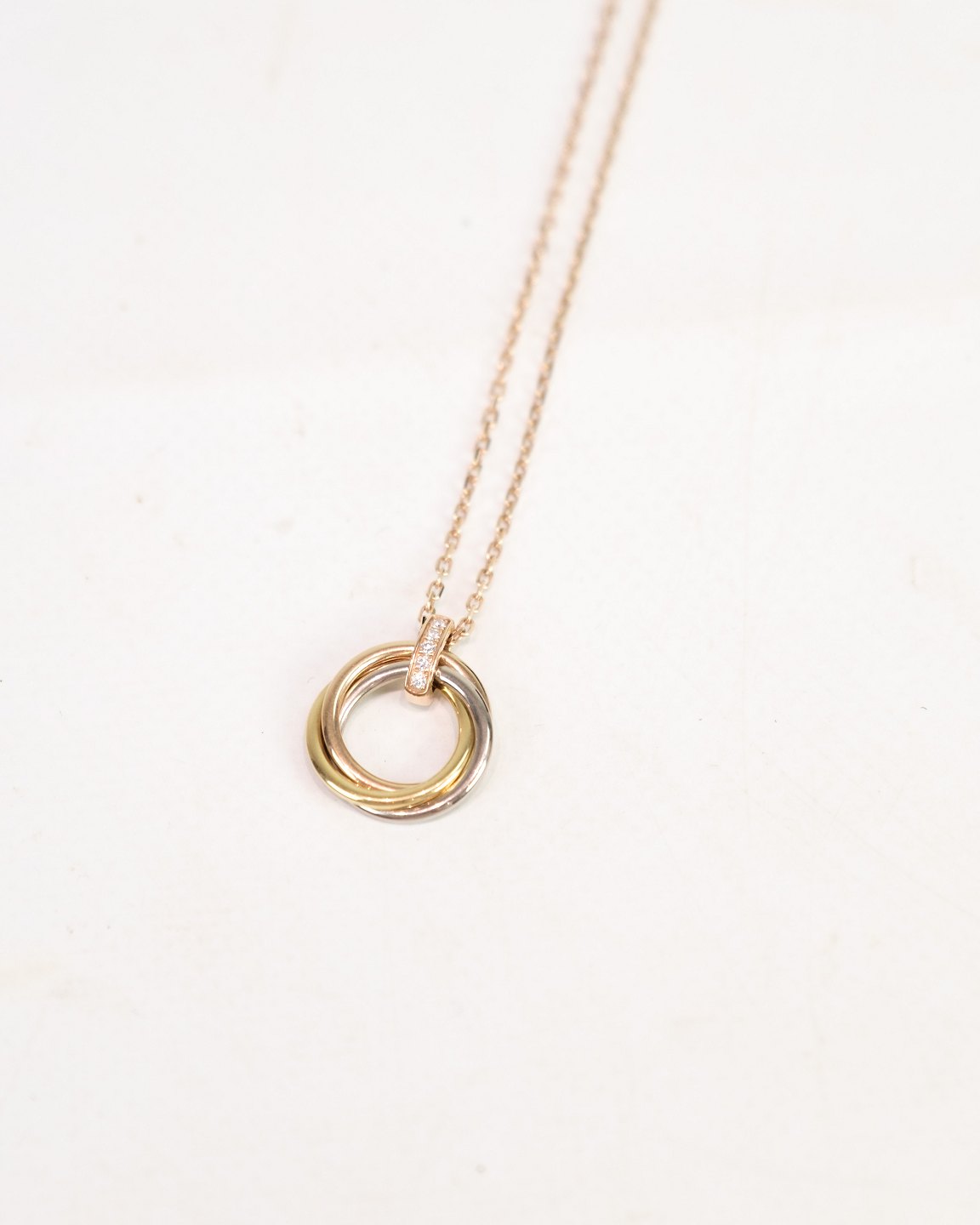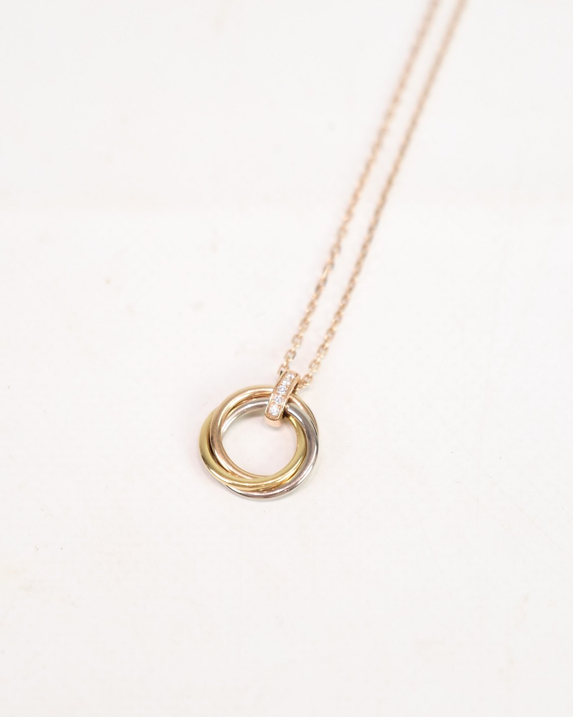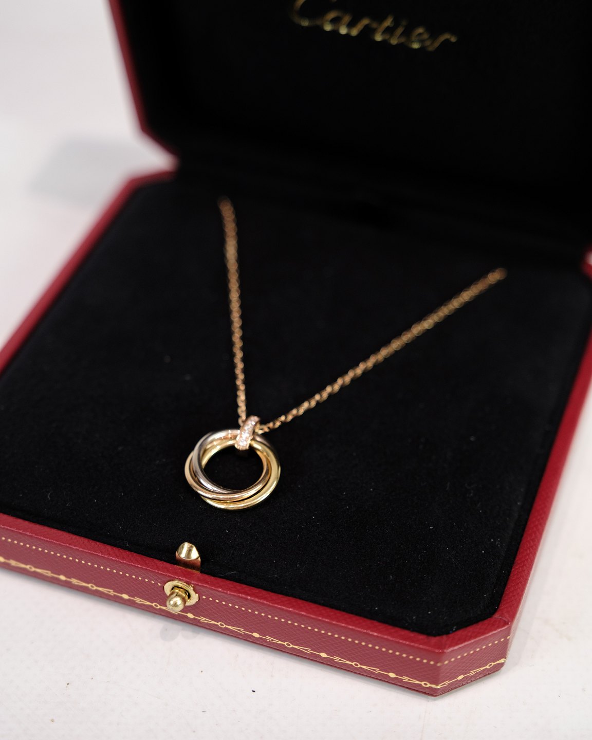 Halskette von Cartier aus der Trinity-Kollektion. Die Kette besteht aus 750er Roségold mit Sicherheitsverschluss und ist mit einem Anhänger verziert, der aus drei ineinander verschlungenen Ringen aus Weißgold, Roségold und Gelbgold besteht – eine klassische Cartier-Signatur.Die Aufhängung des Anhängers ist mit Diamanten im Brillantschliff besetzt, was für ein dezentes, aber exklusives Funkeln sorgt.