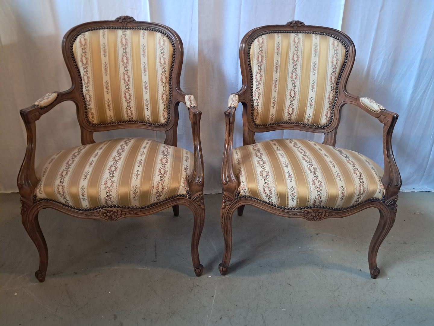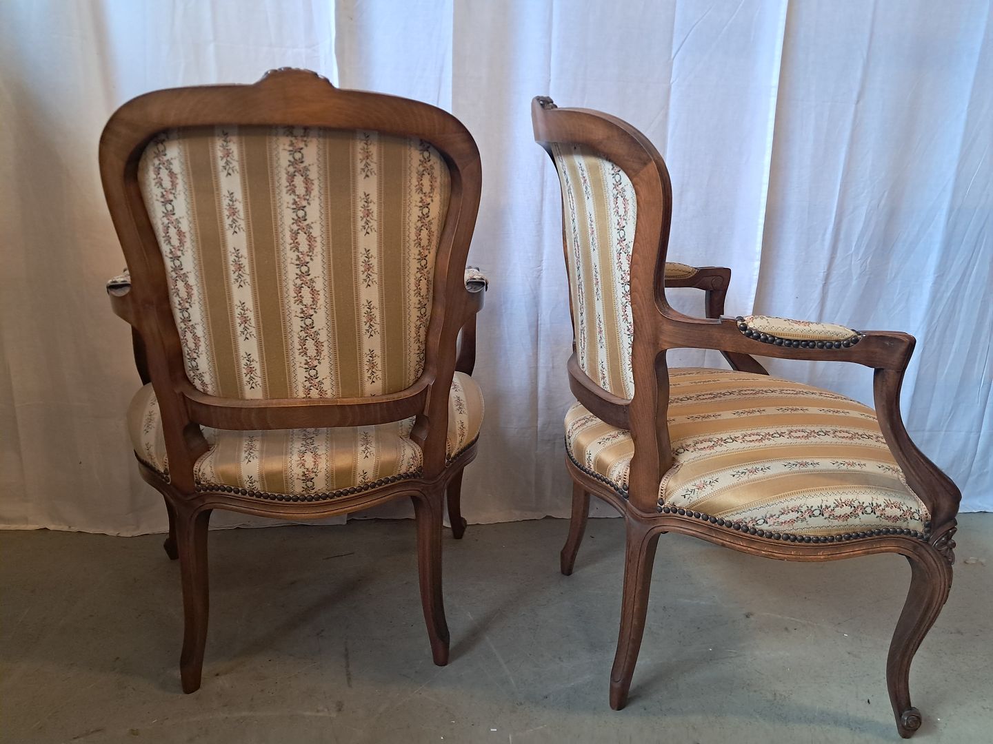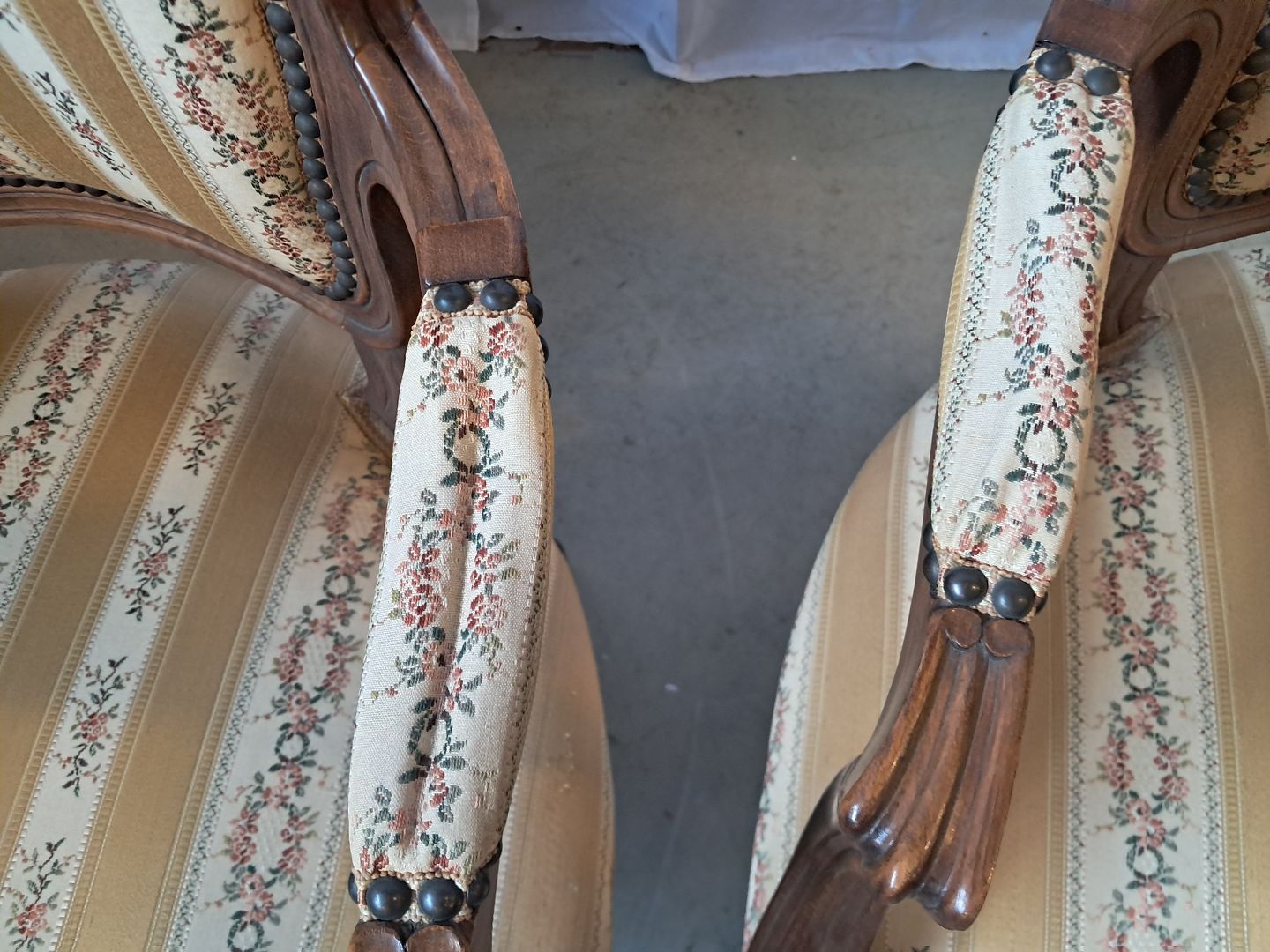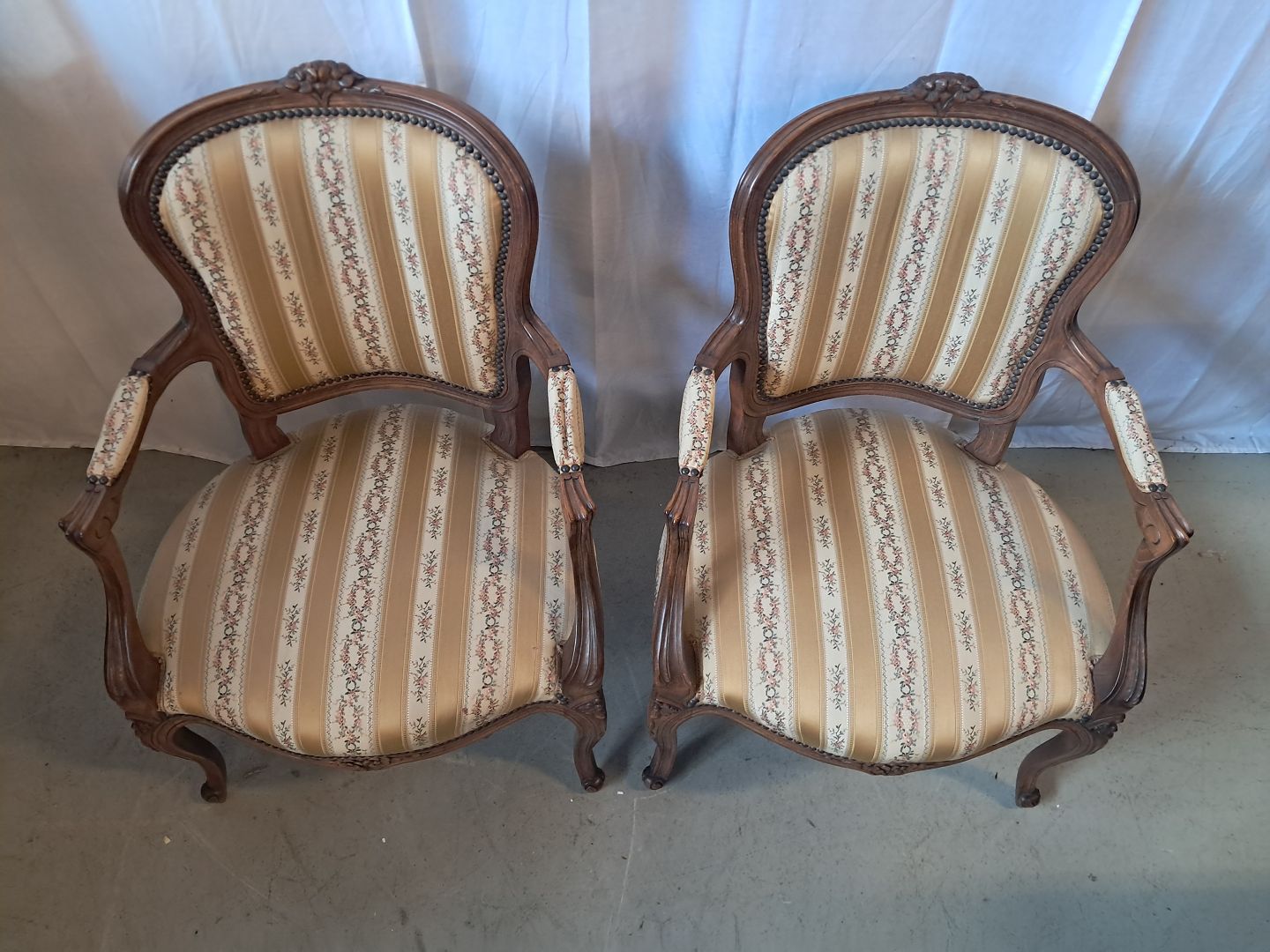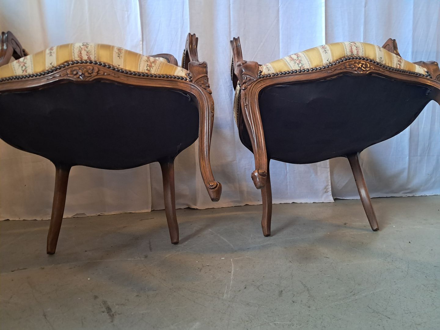 2 Rokokostole i massivt bøgetræ, fra 1950erne.De har brugsspor og polstringen på armlænene er faldet sammen.