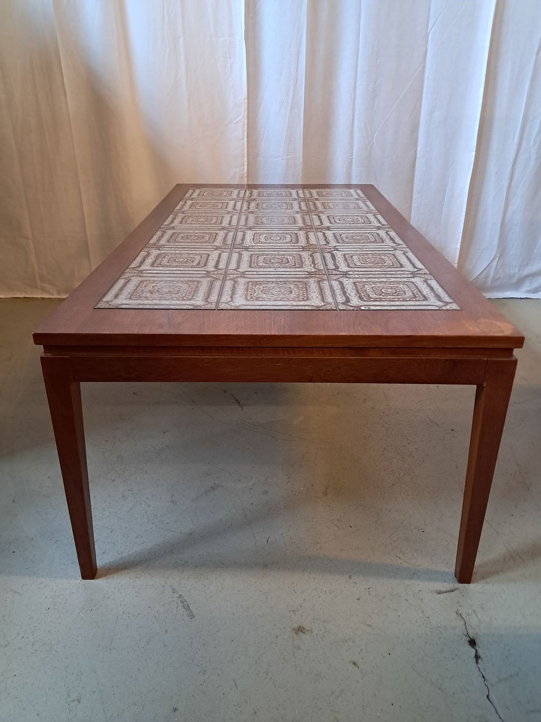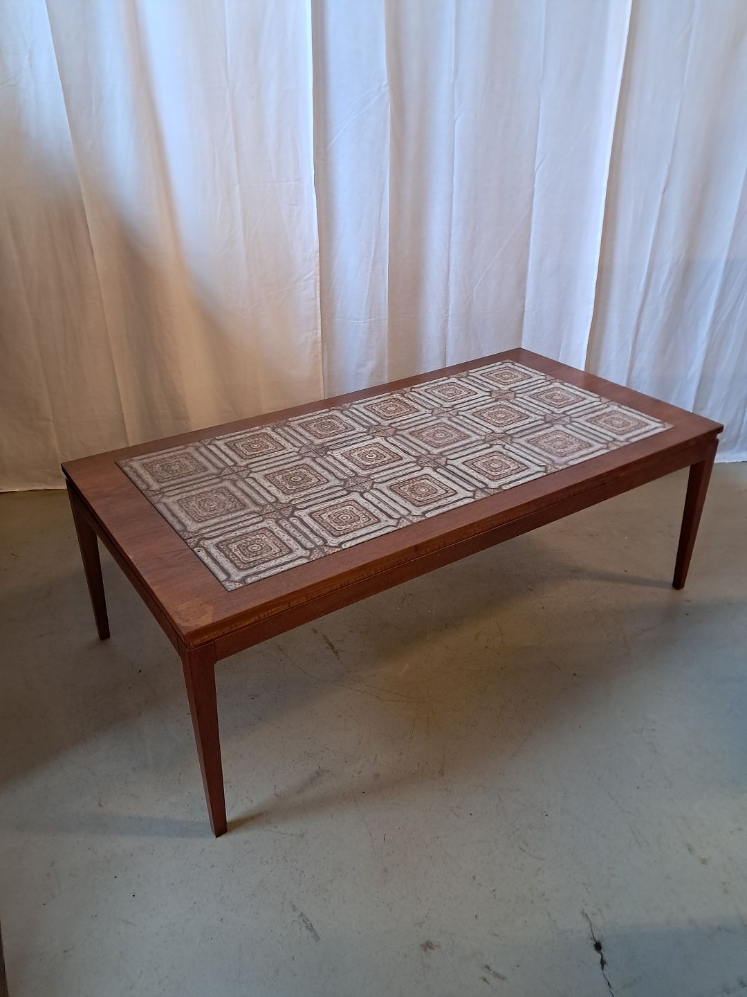 Sofabord i fineret teaktræ med kakler, fra 1960erne.Det har brugsspor.