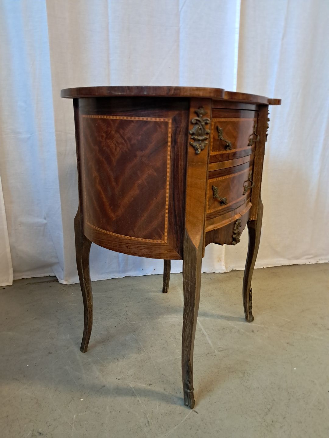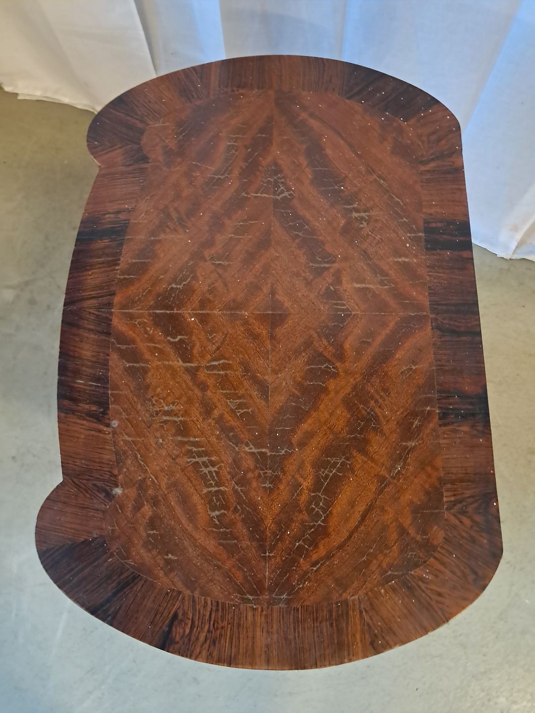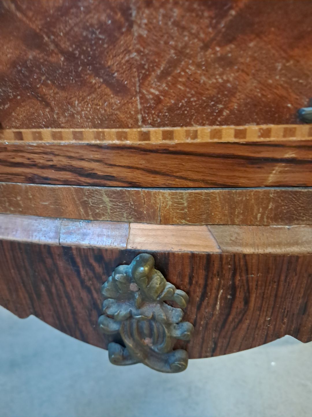 Kommode i fineret mahogni og rodtræ, fra 1980erne.Den har brugsspor og en finer defekt.