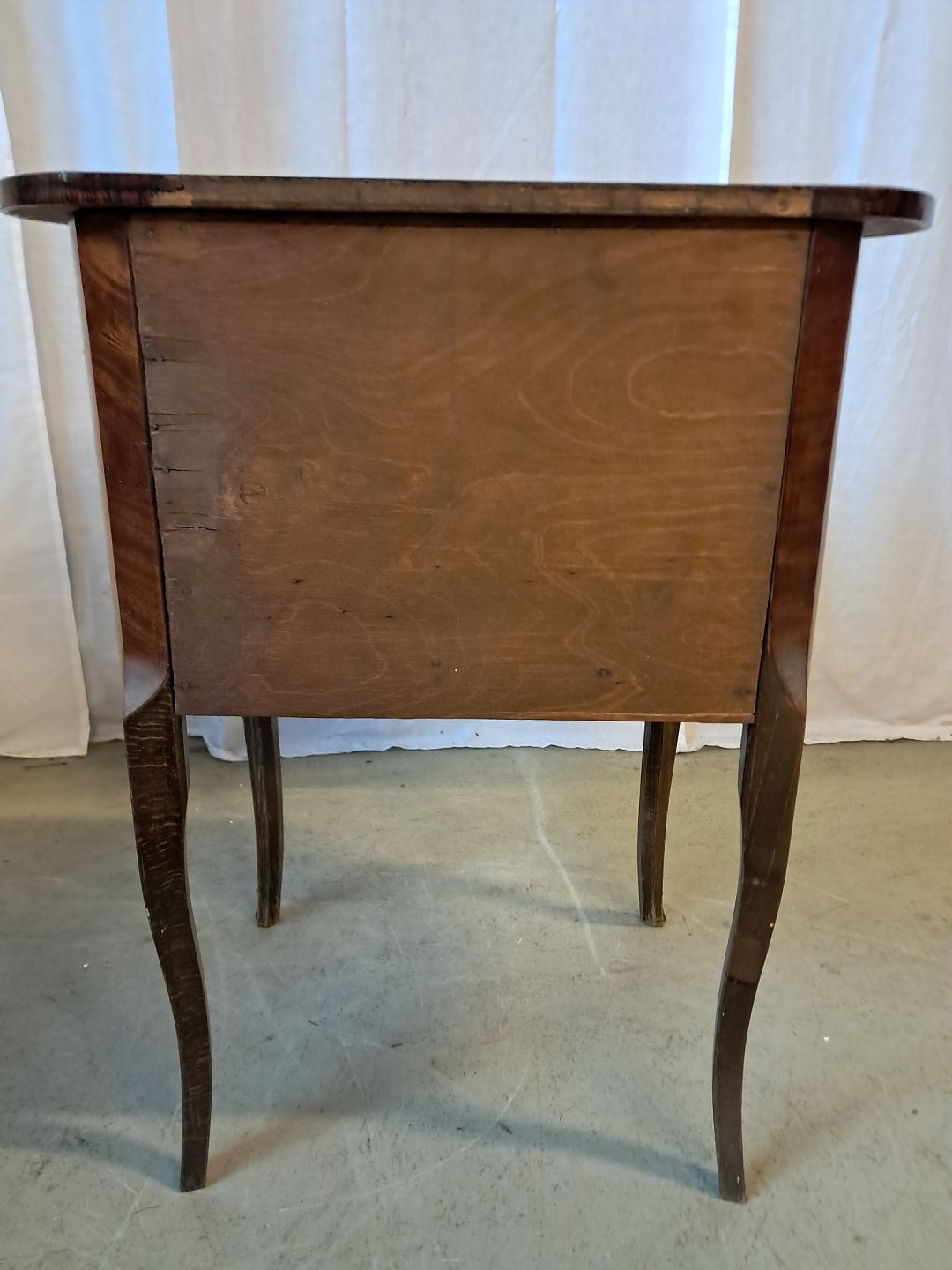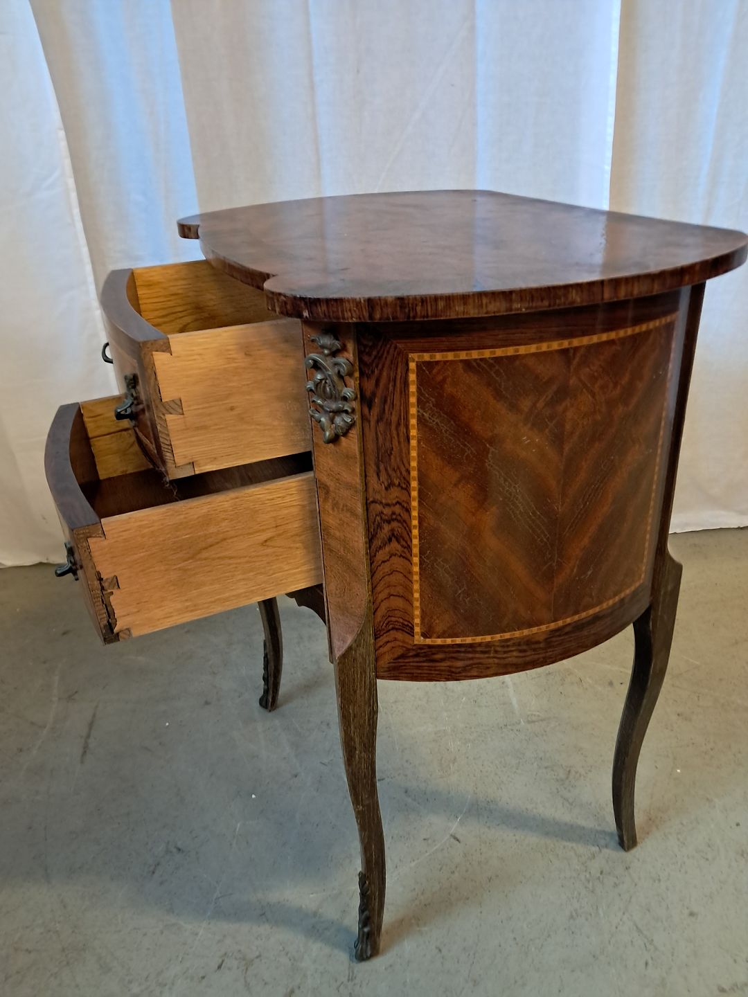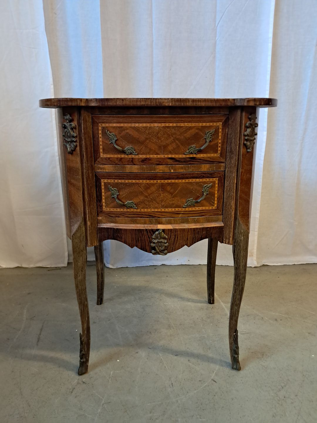 Kommode i fineret mahogni og rodtræ, fra 1980erne.Den har brugsspor og en finer defekt.