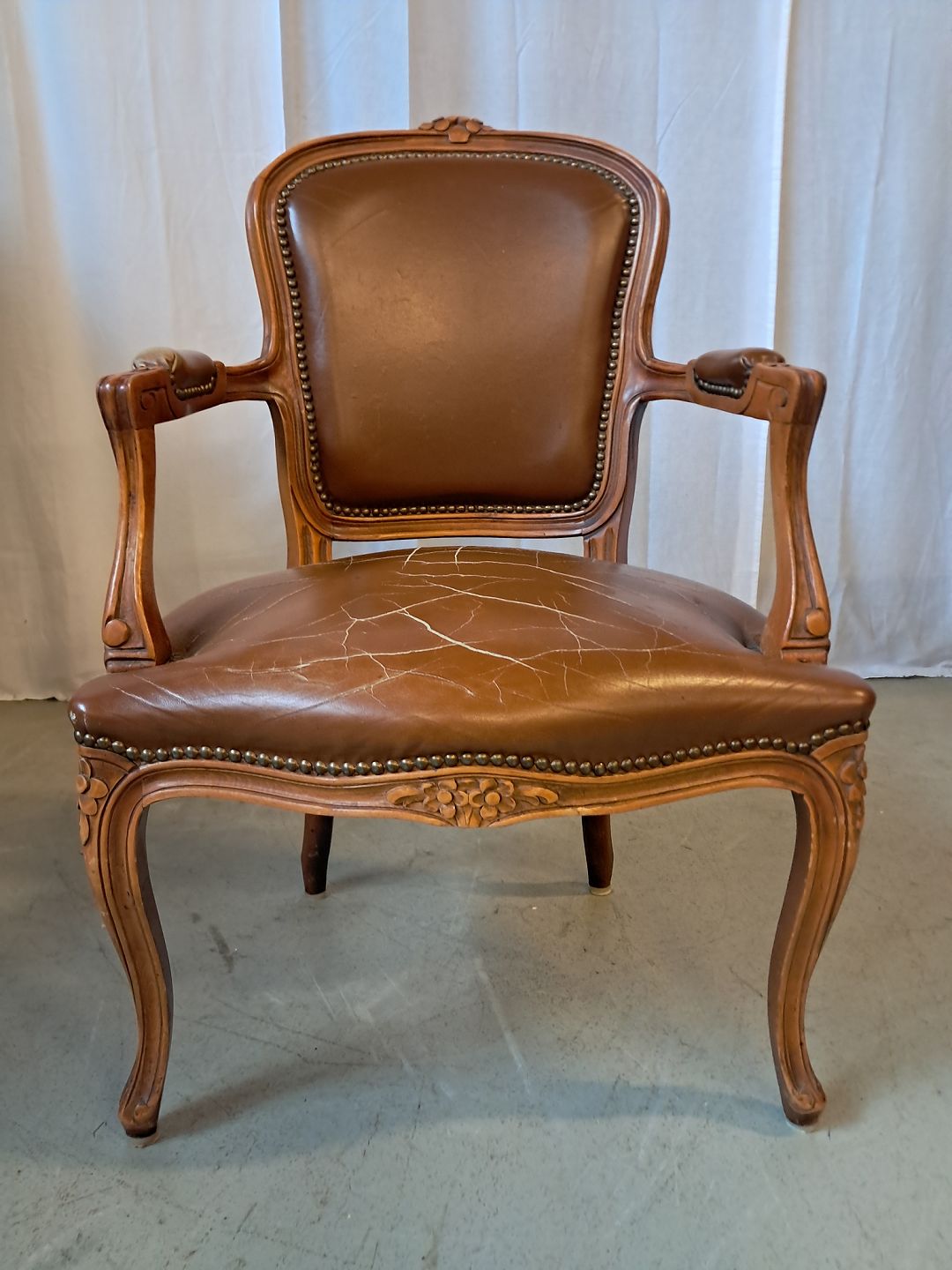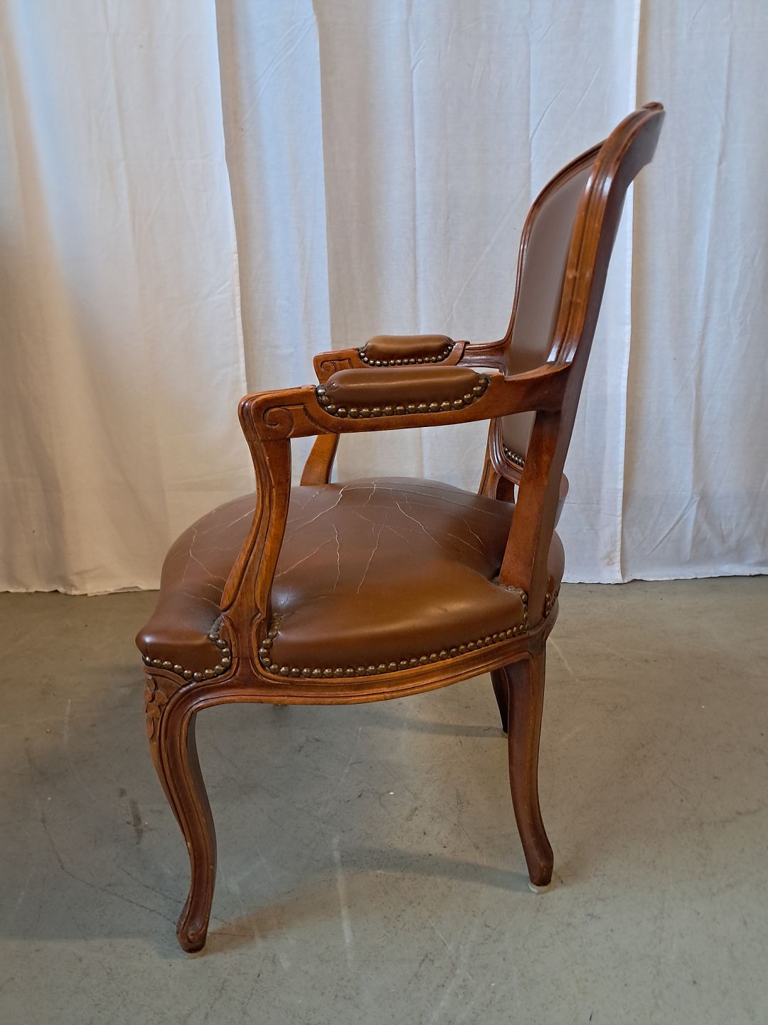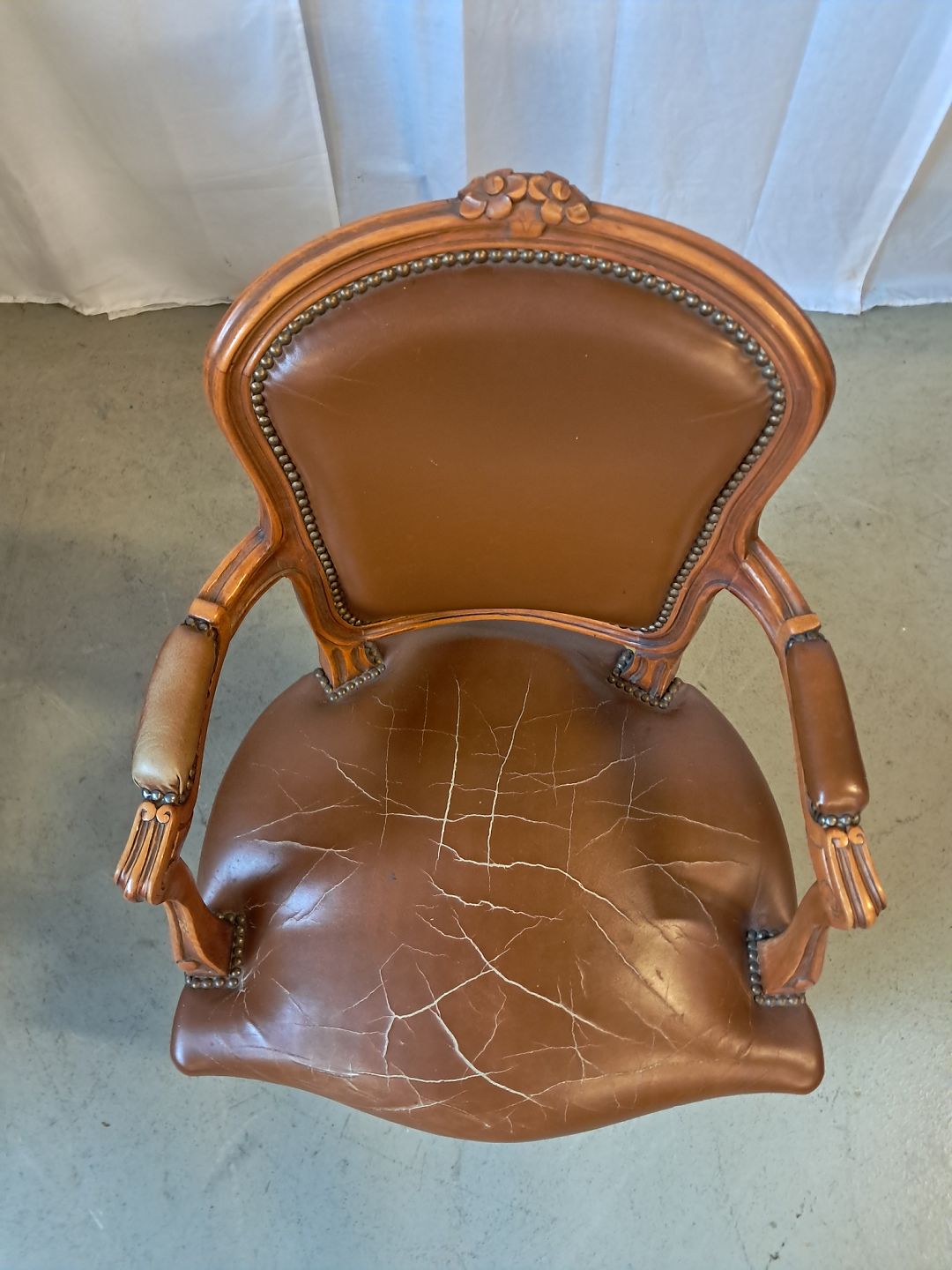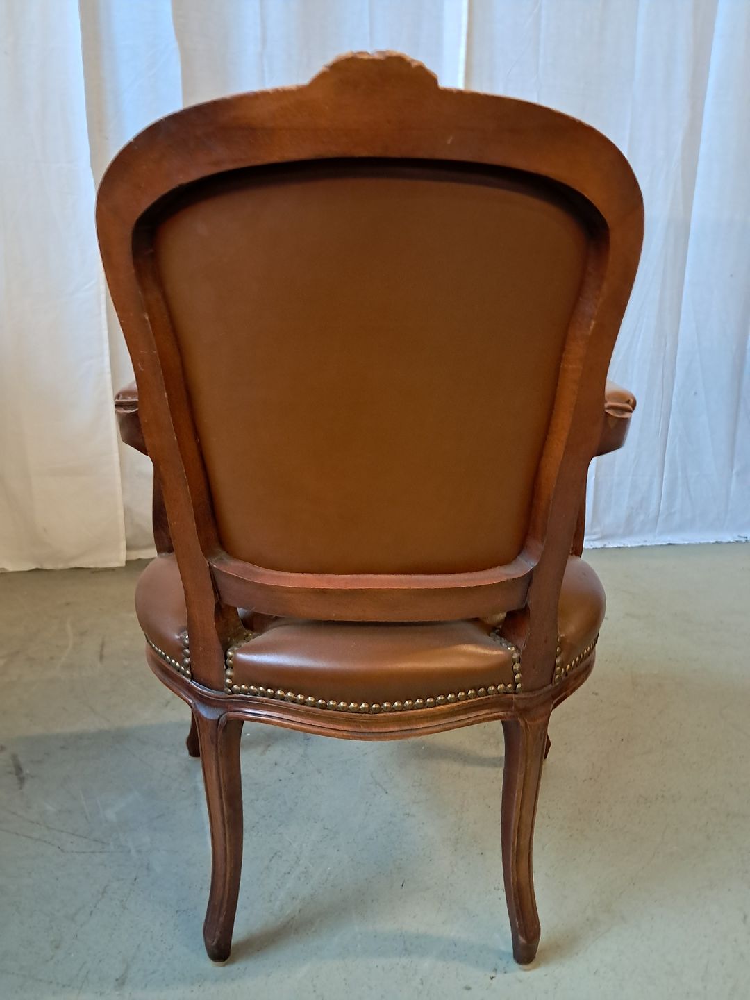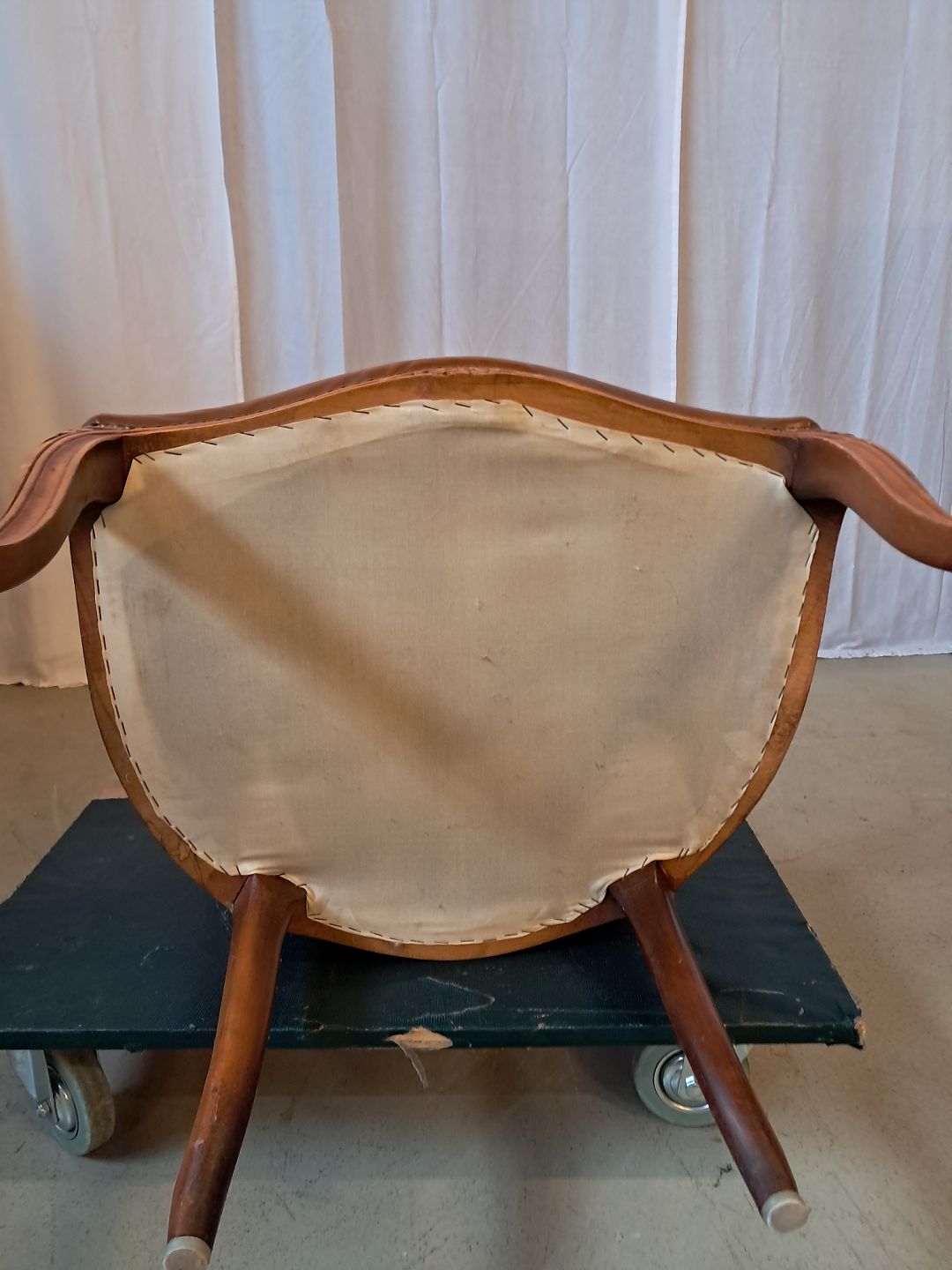 Rokokostol i massivt bøgetræ med kunstlæder, fra 1980erne.Den har brugsspor.