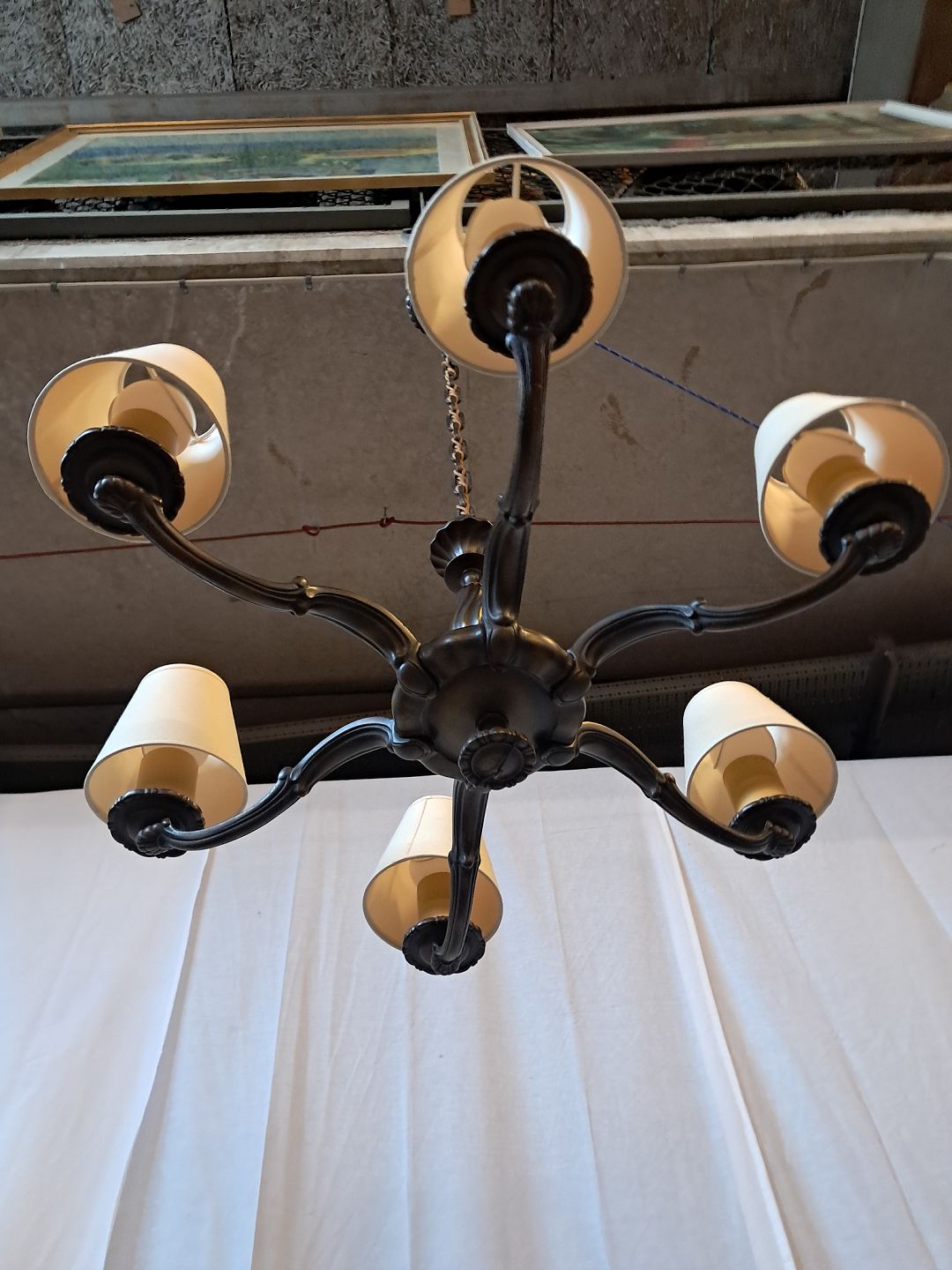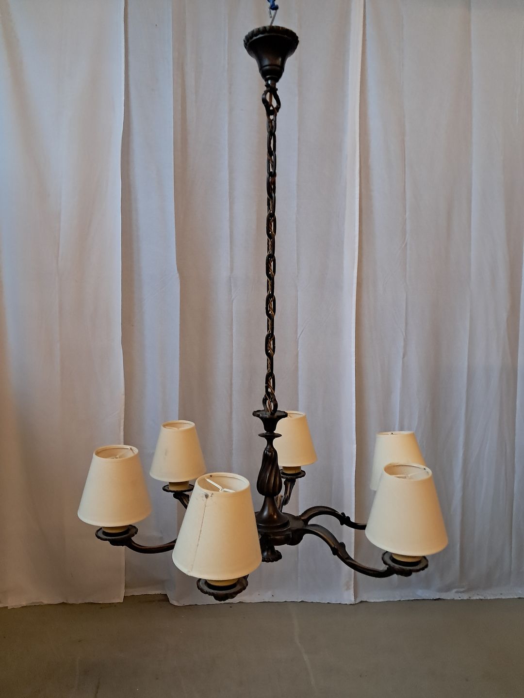Lysekrone i metal, fra 1930erne.Den har brugsspor.