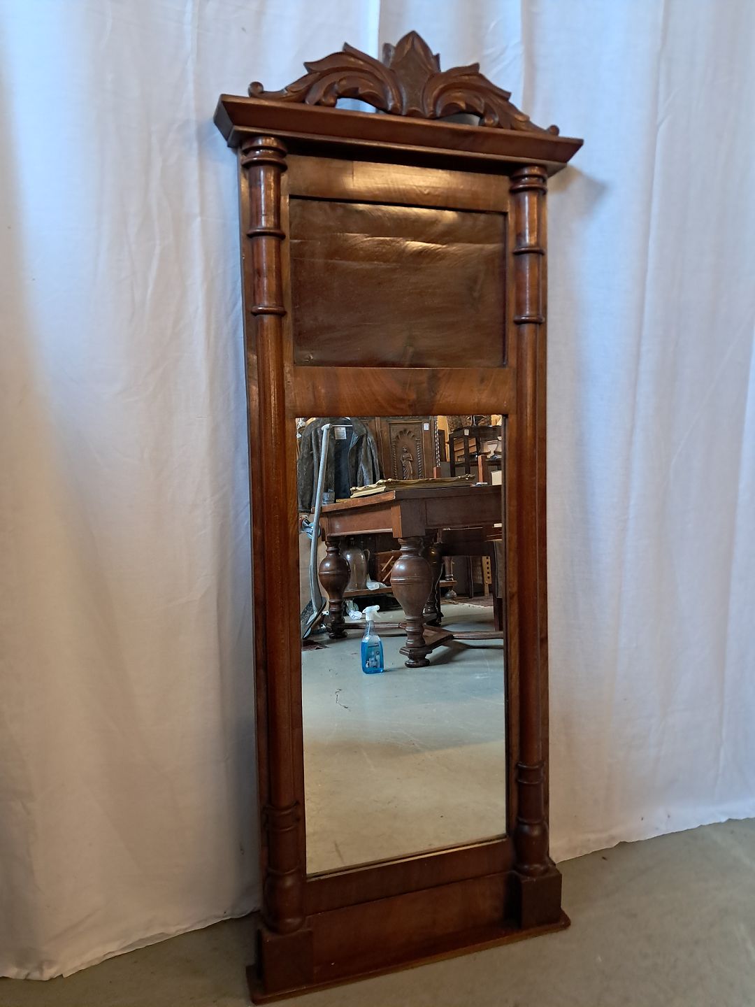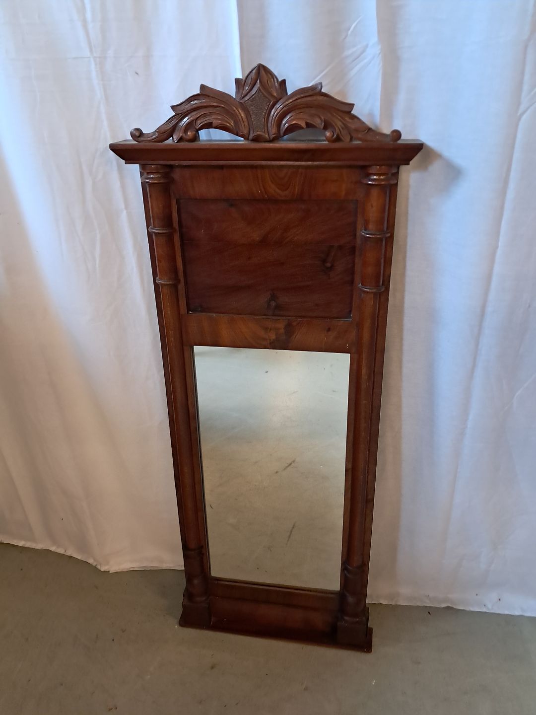 Spejl i fineret mahogni, fra 1900erne.Det har brugsspor.