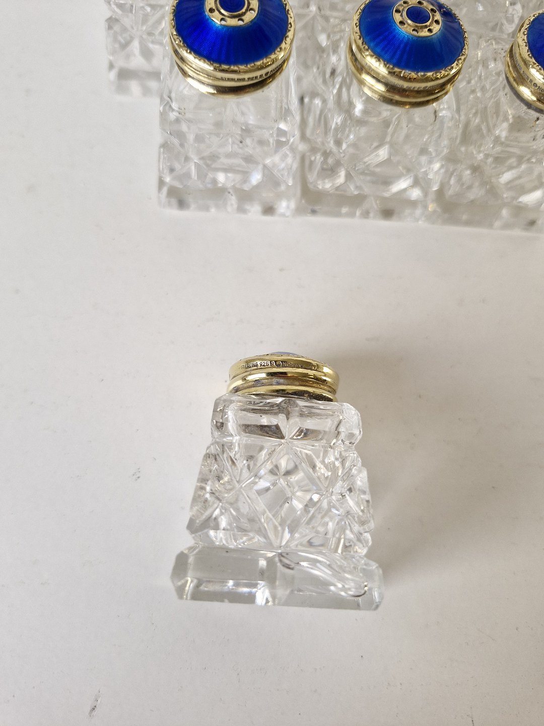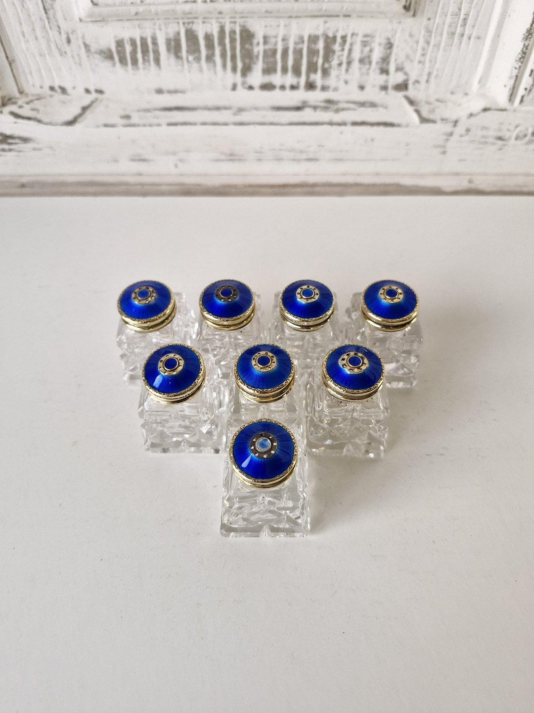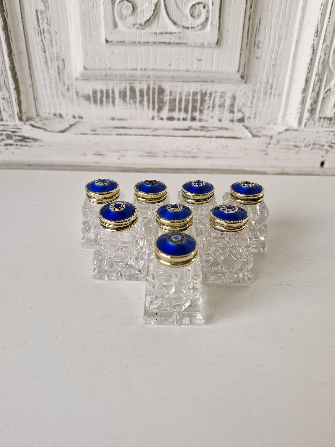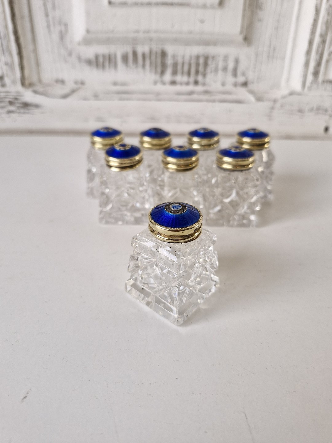 Sæt på 8 saltbøsser i krystal med låg i forgyldt sølv og emalje Stemplet: Sterling - 925s - Norway