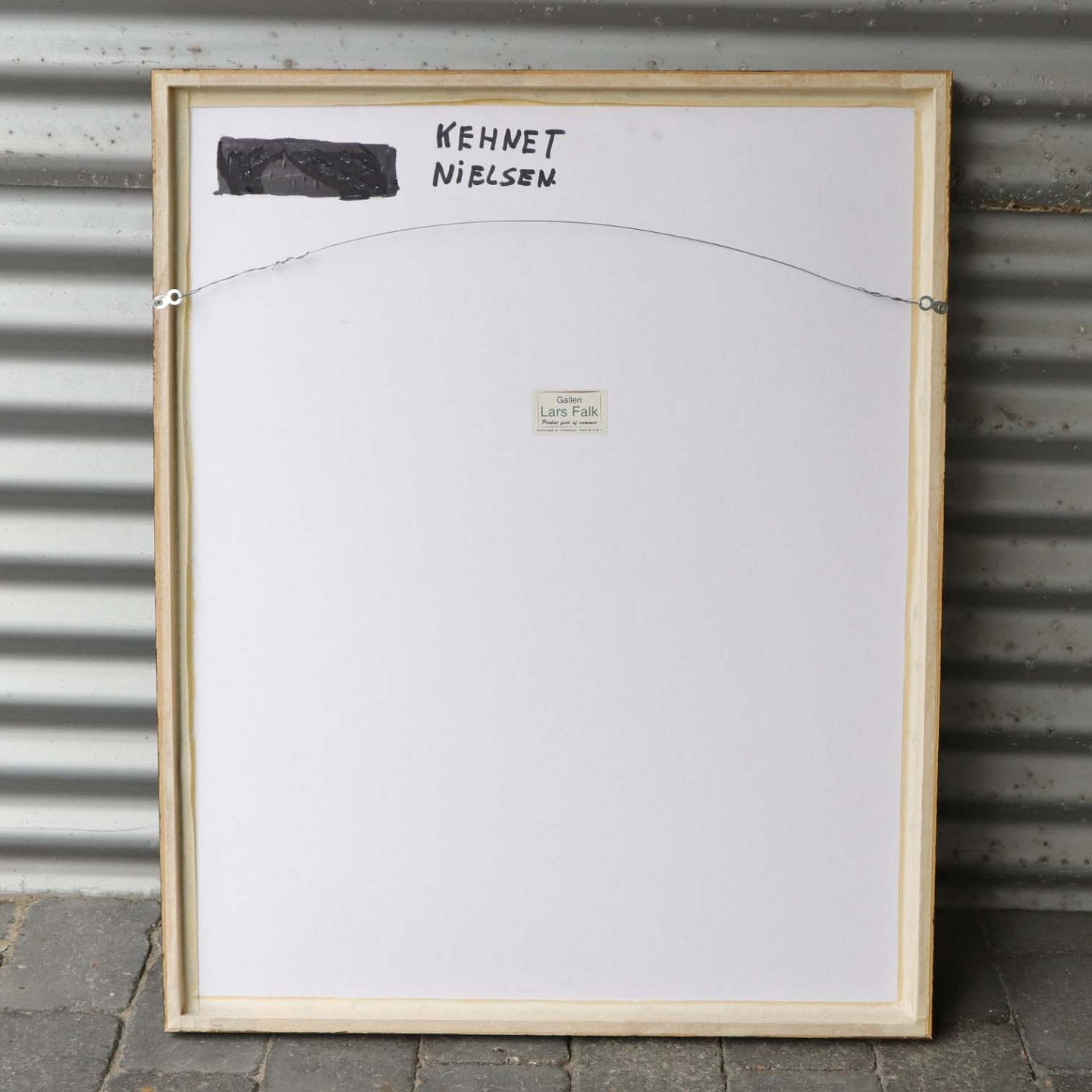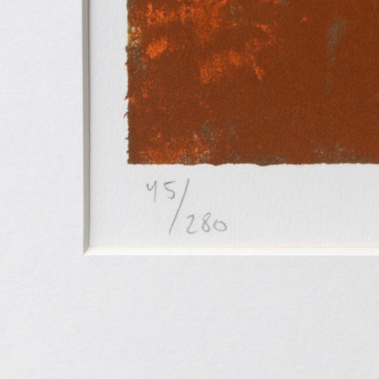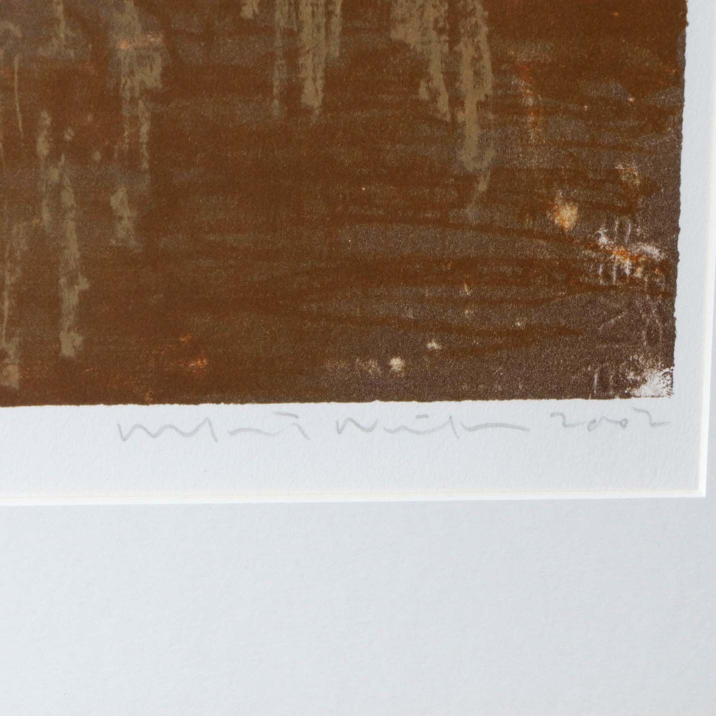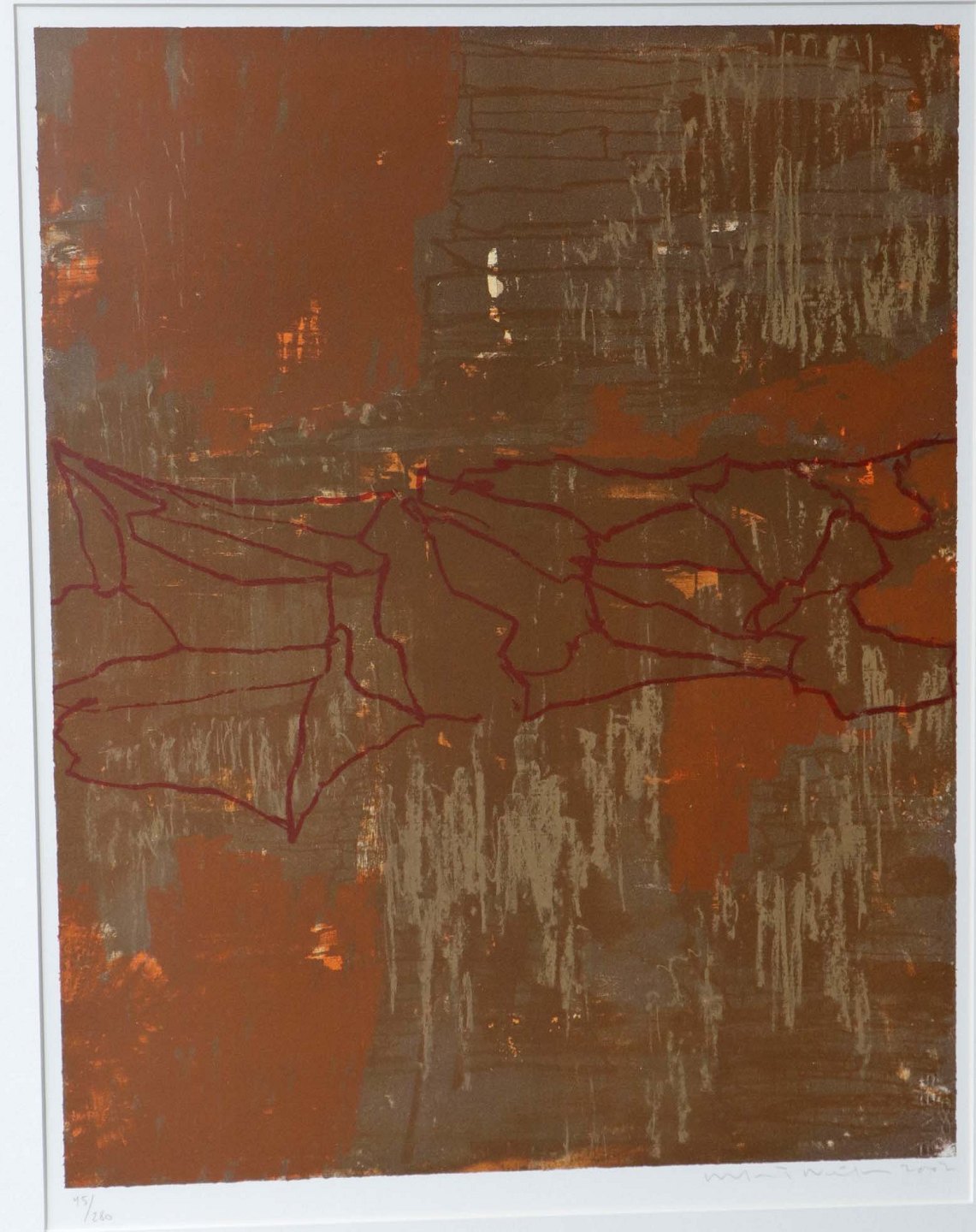 Indrammet litografi med passepartout i mørkmalet træramme med abstrakt motiv i jordfarver fra år 2002. Nr. 45 af 280 eksemplarer.Kunstner Kehnet Nielsen f. 1947