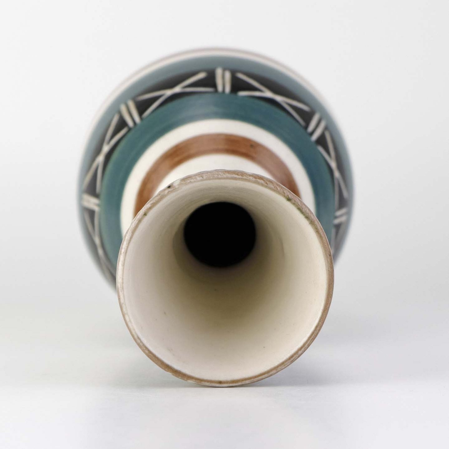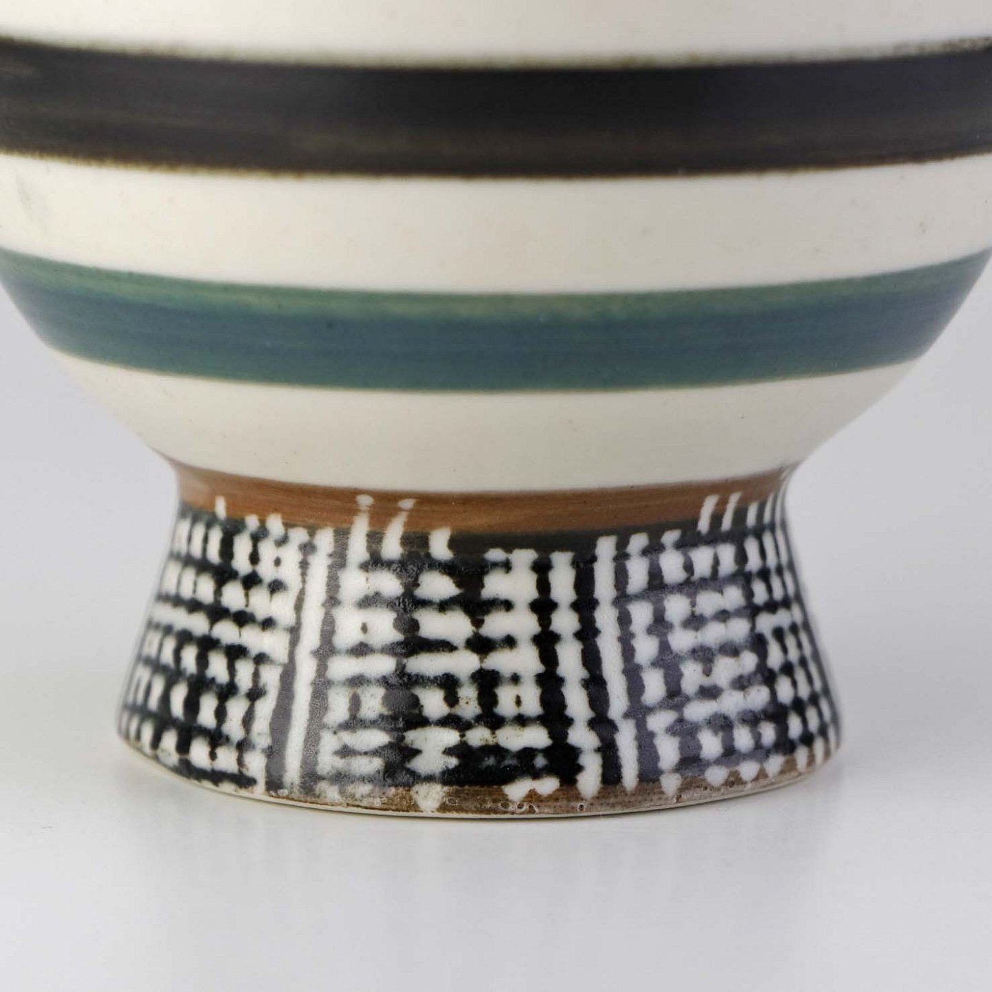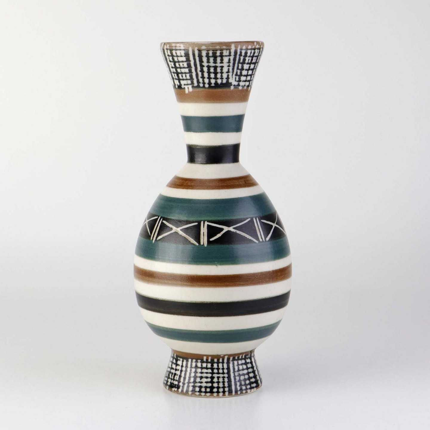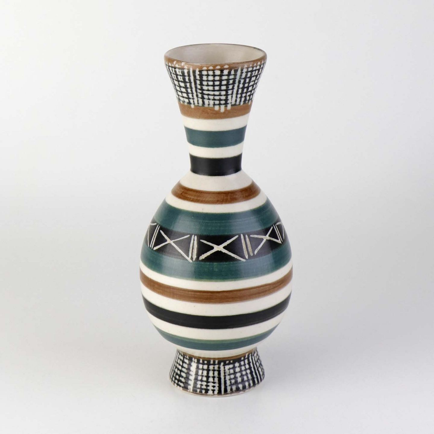 Vase i keramik dekoreret med farverig glasur og stribet mønster.Formgiver Aksel Sigvald Nielsen (1910-1988)
