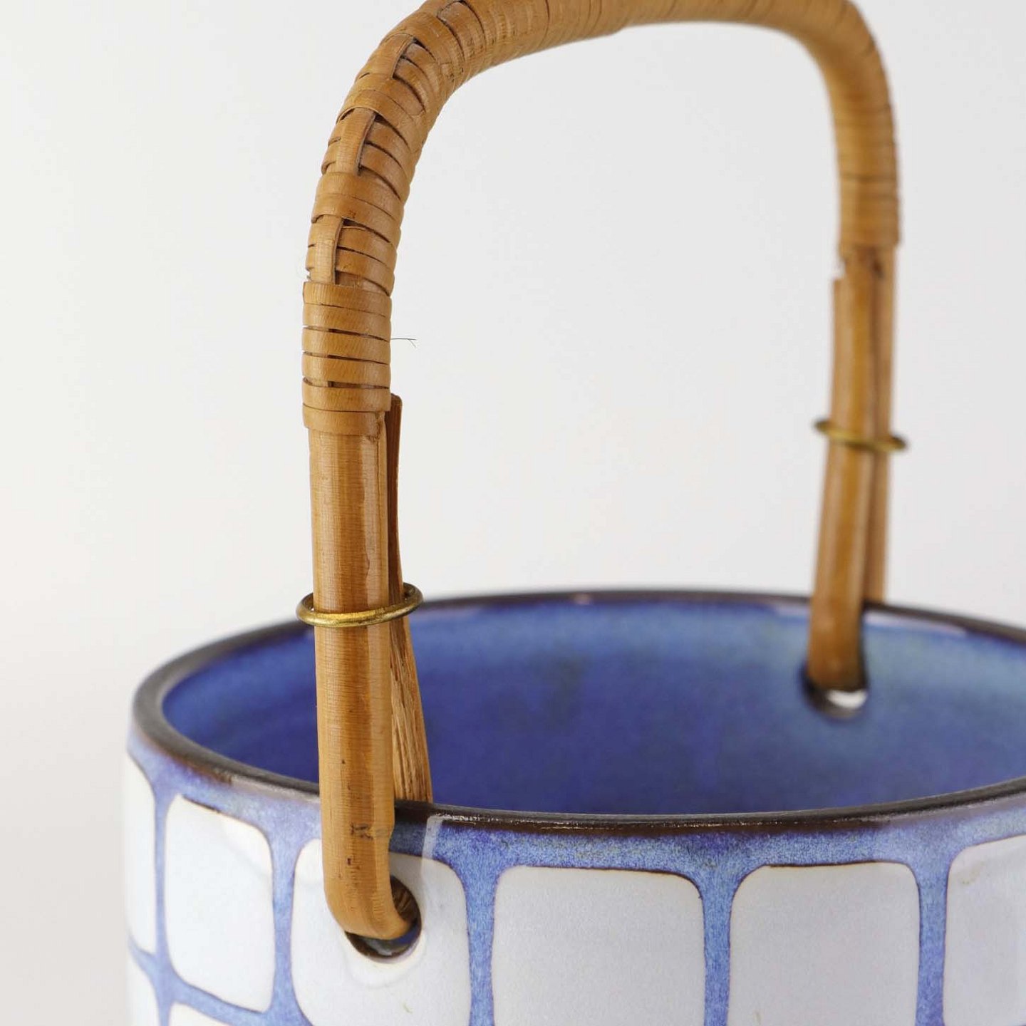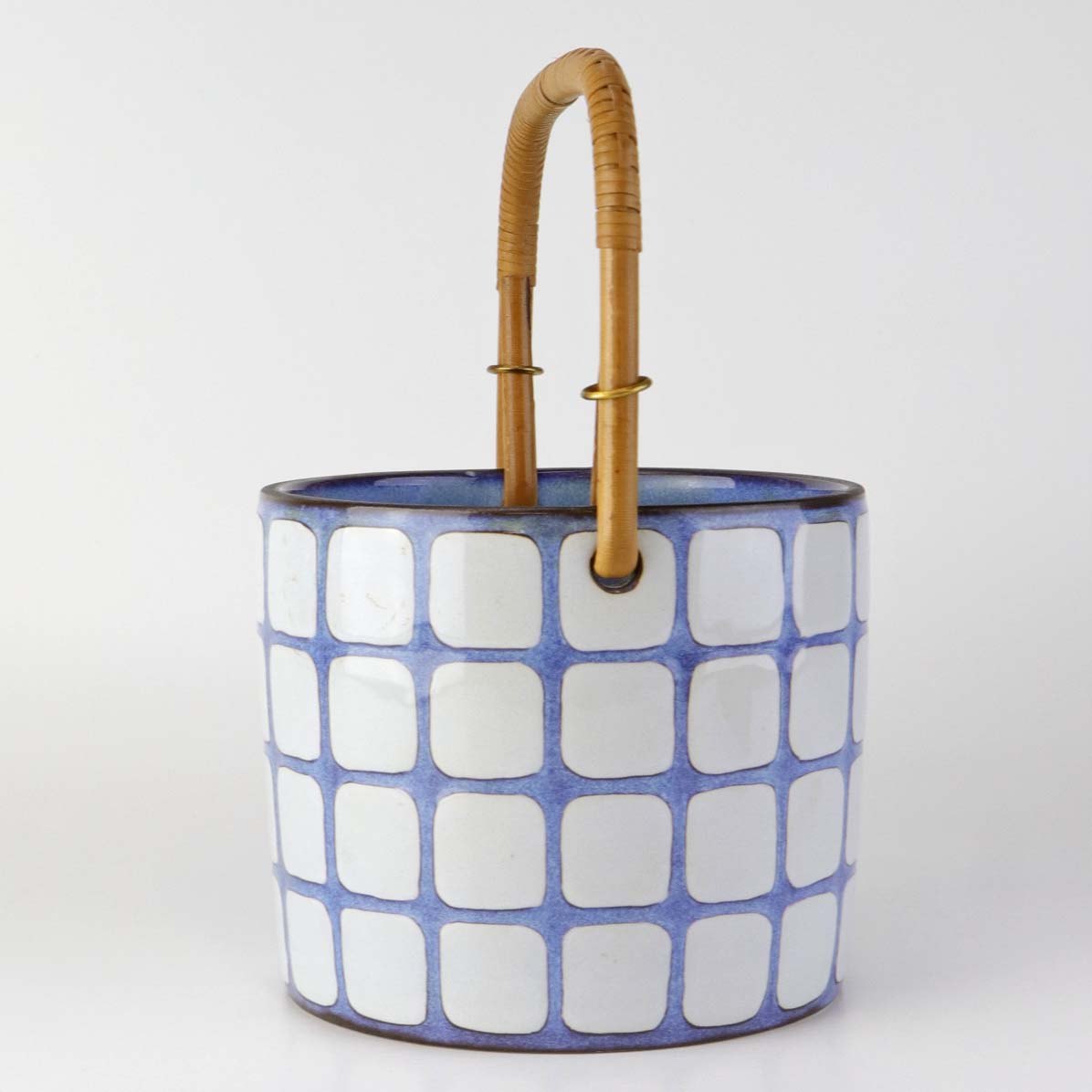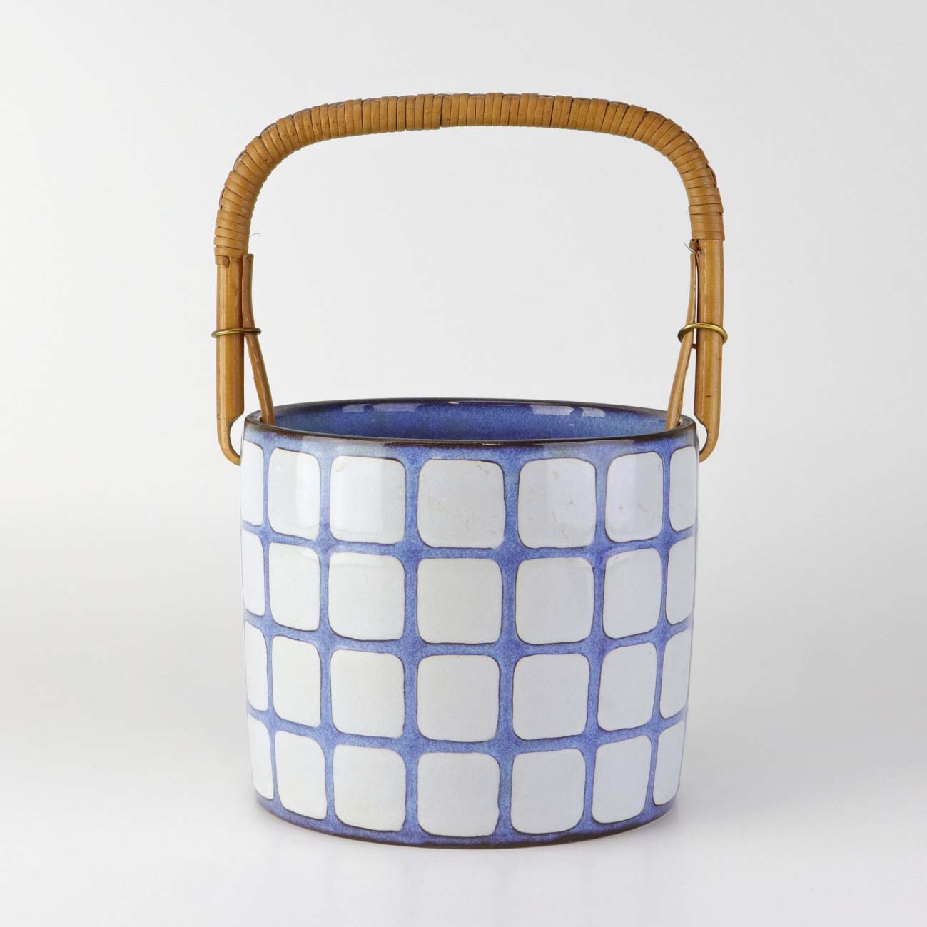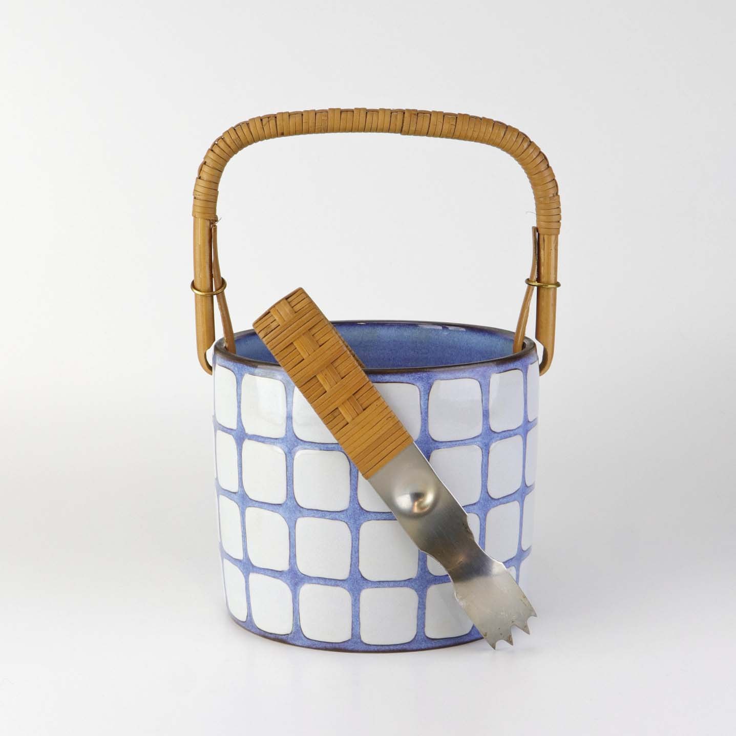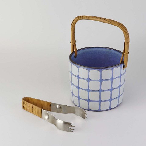 Isspand i lyseblå fajance med hvide tern og tilhørende tang i metal. Spandens hank og grebet på tangen er lavet af bambusflet. Nr. 3310Formgiver Anni Rigmor Jeppesen