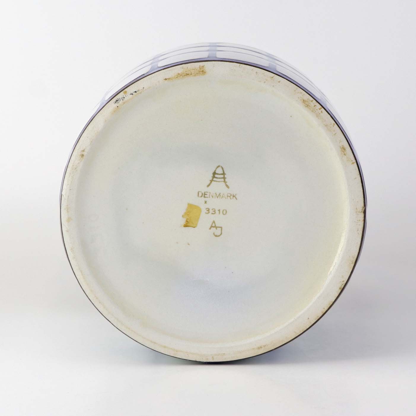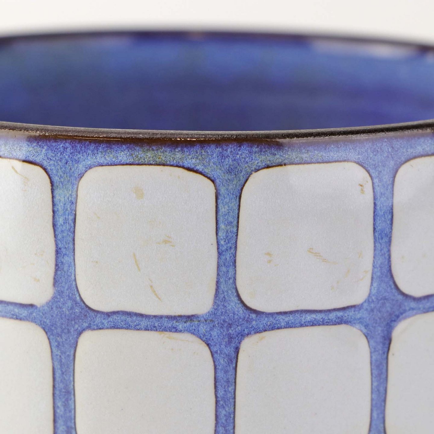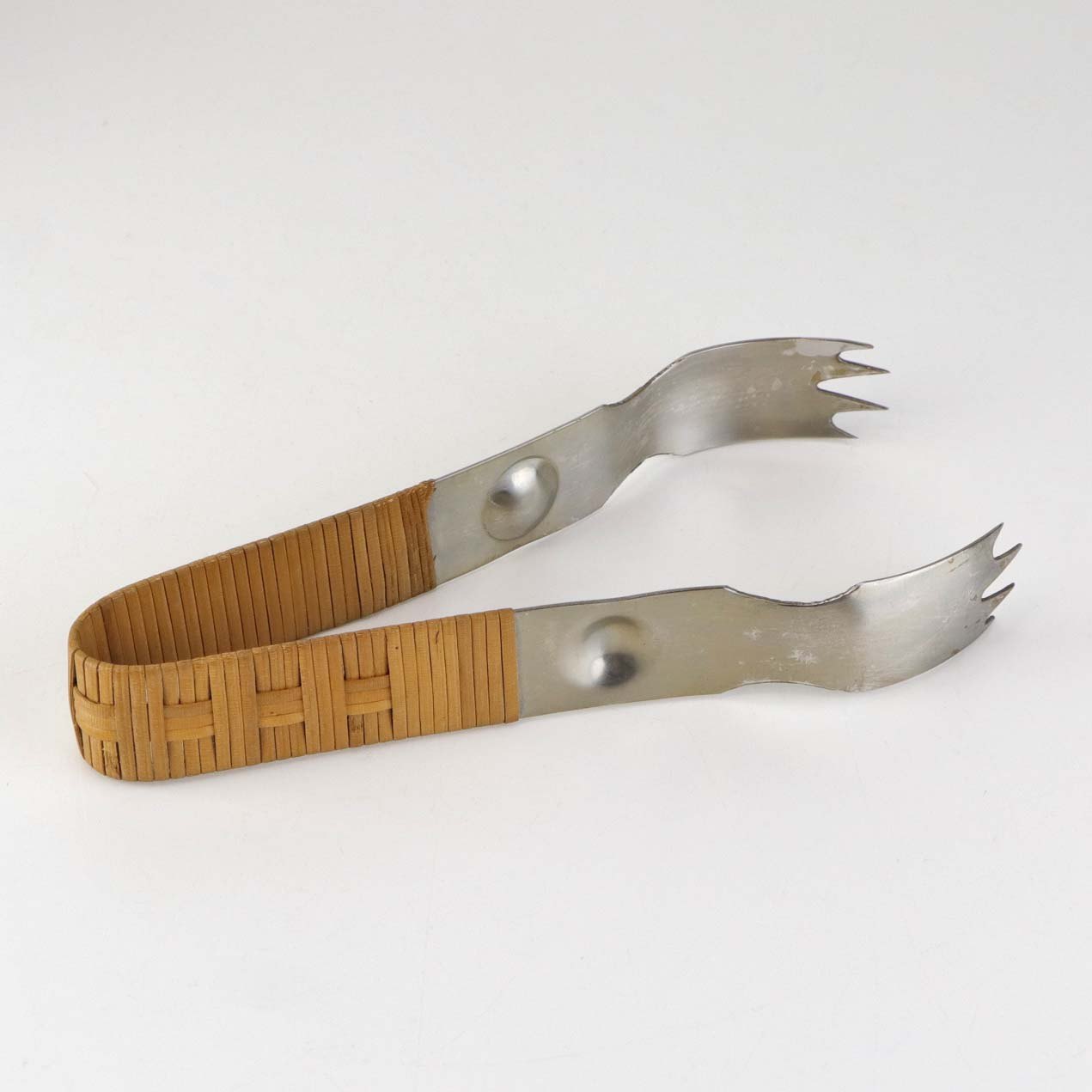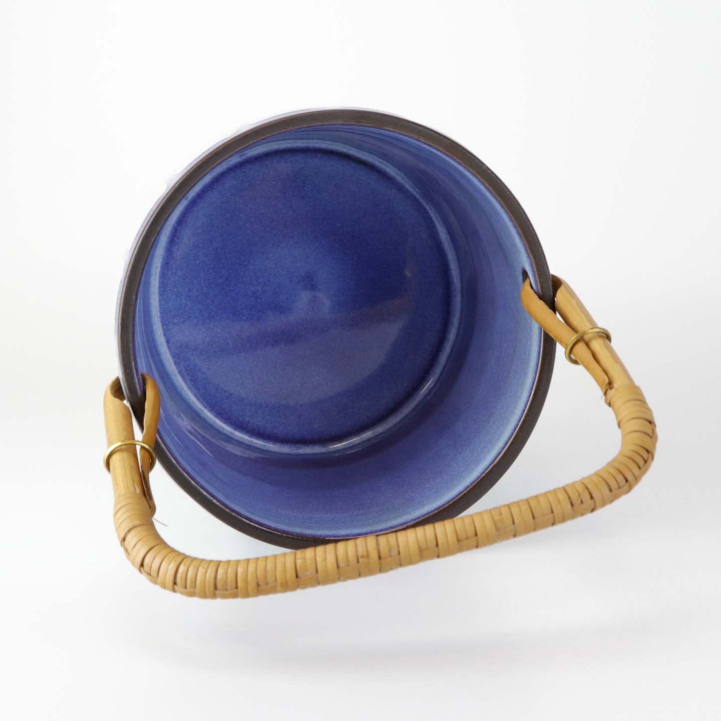 Isspand i lyseblå fajance med hvide tern og tilhørende tang i metal. Spandens hank og grebet på tangen er lavet af bambusflet. Nr. 3310Formgiver Anni Rigmor Jeppesen
