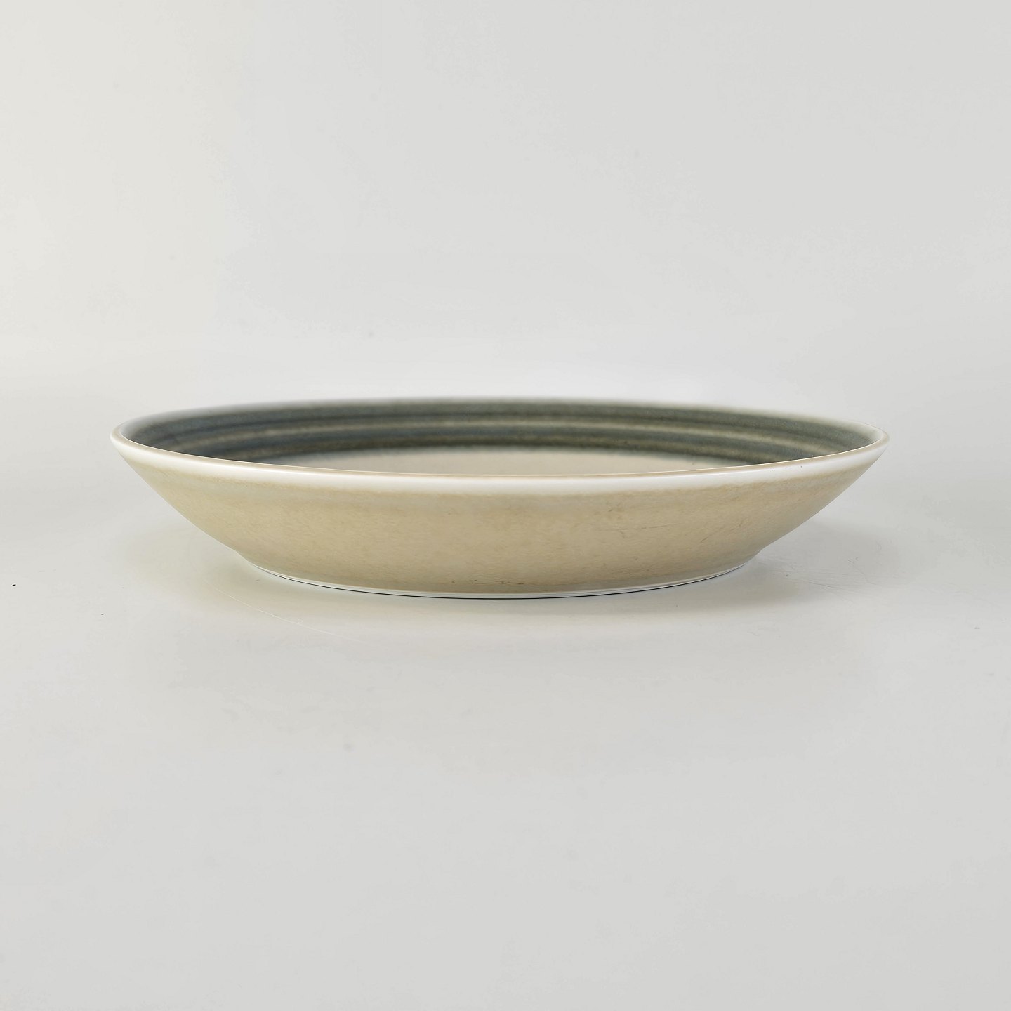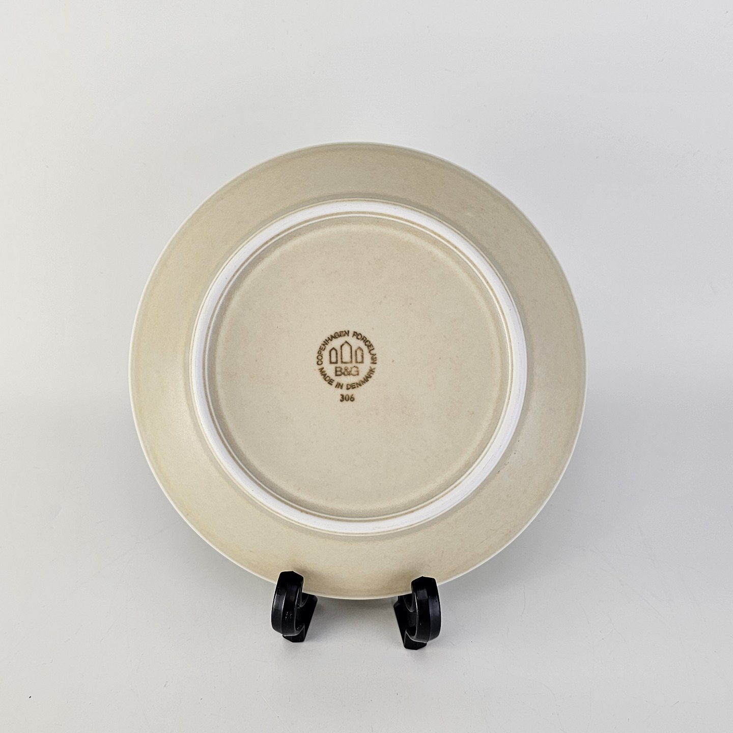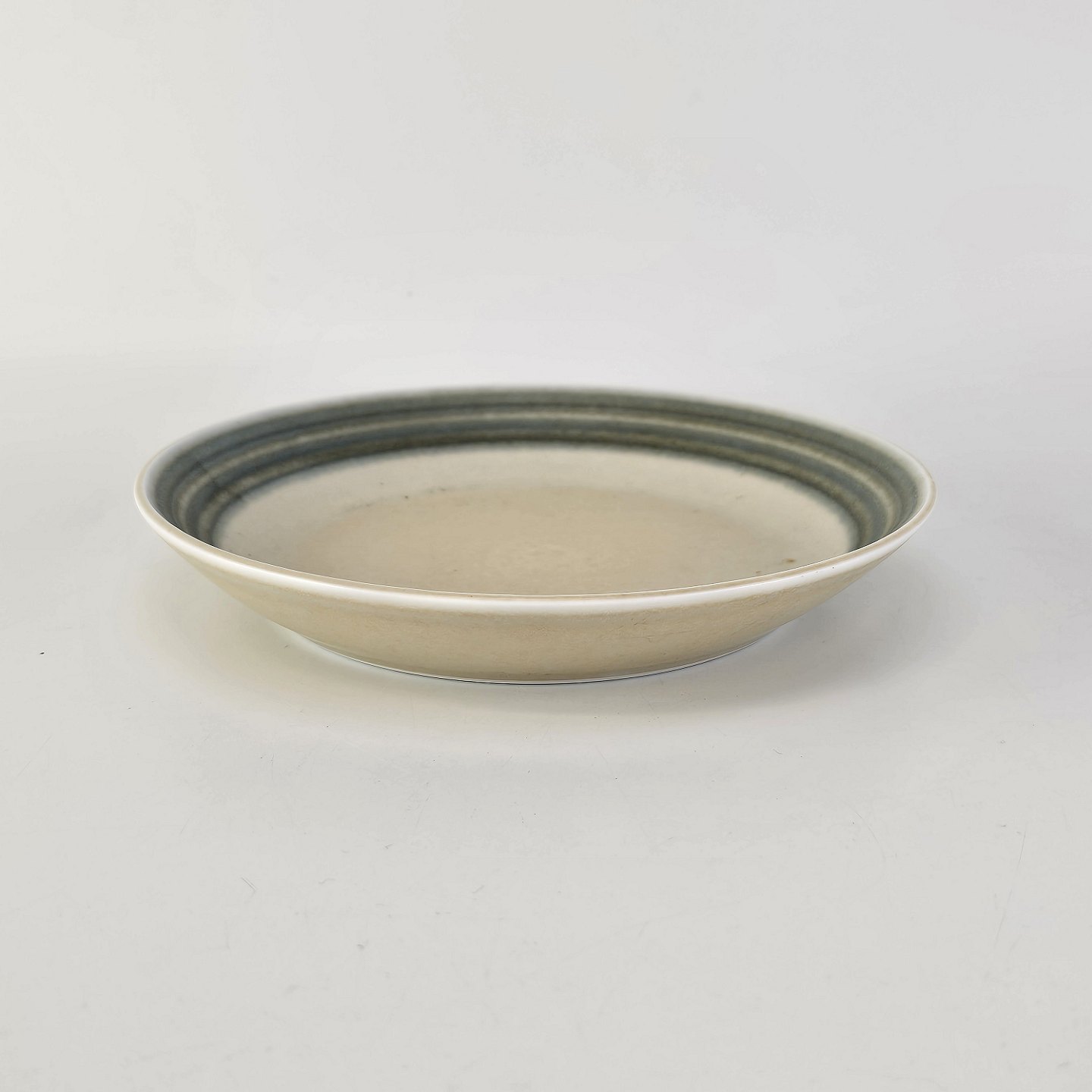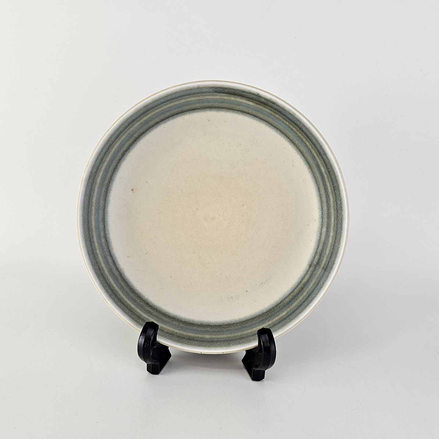 Dessert tallerken i stentøj fra stellet Edith Sonne, mat hvid dekoreret med en blå stribeNr. 306