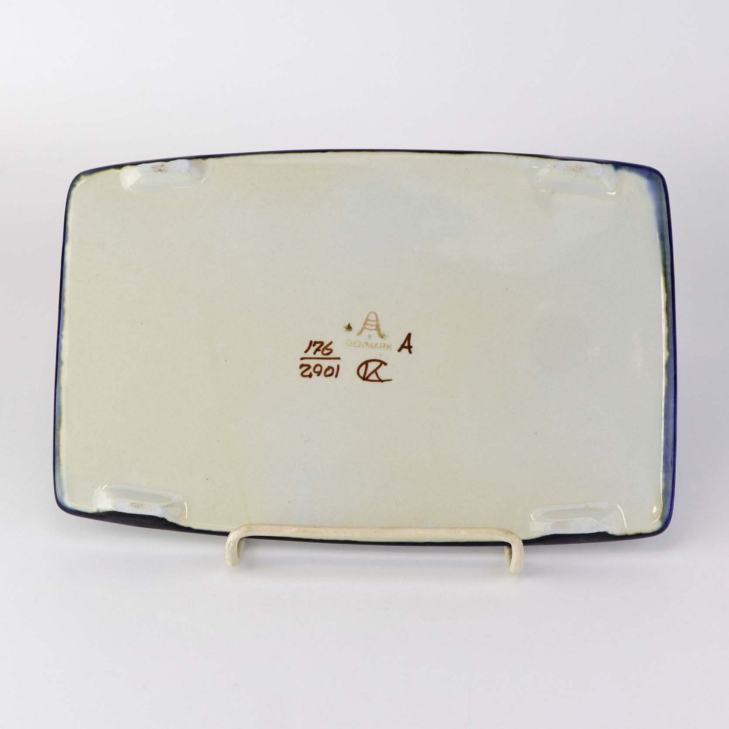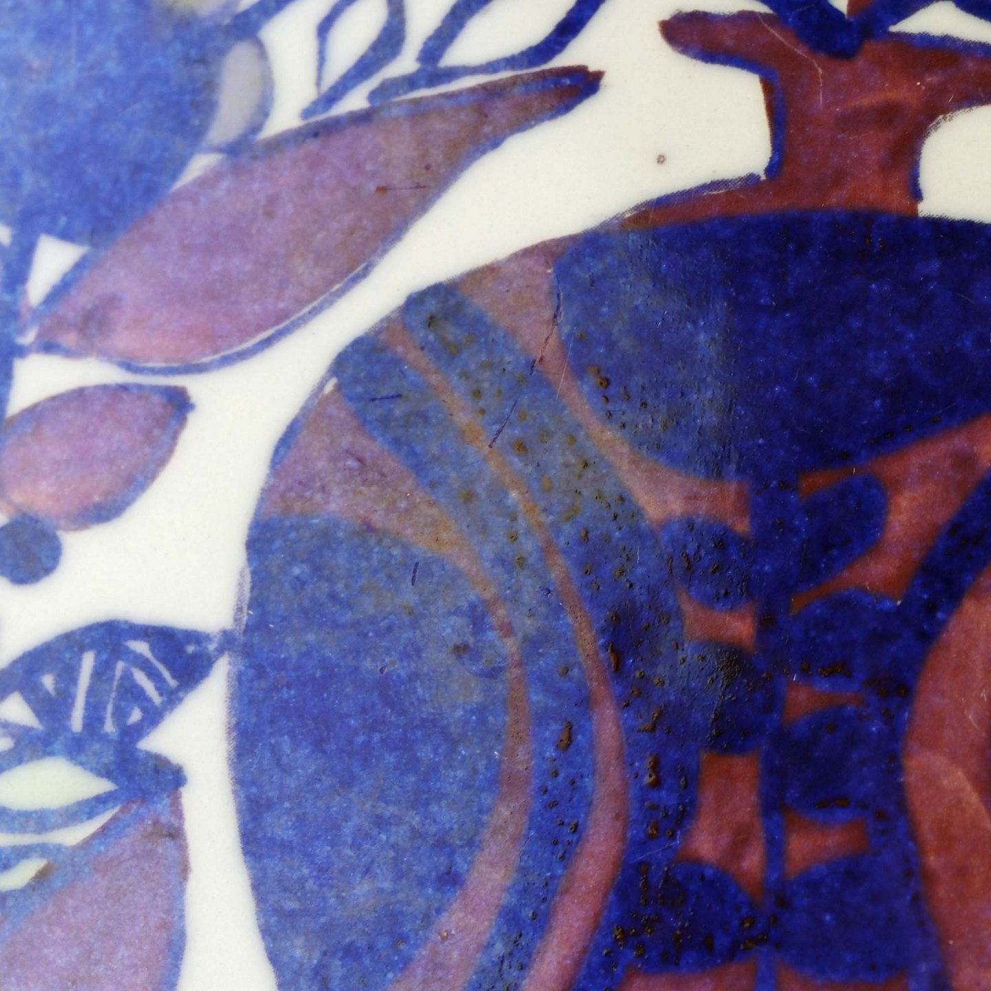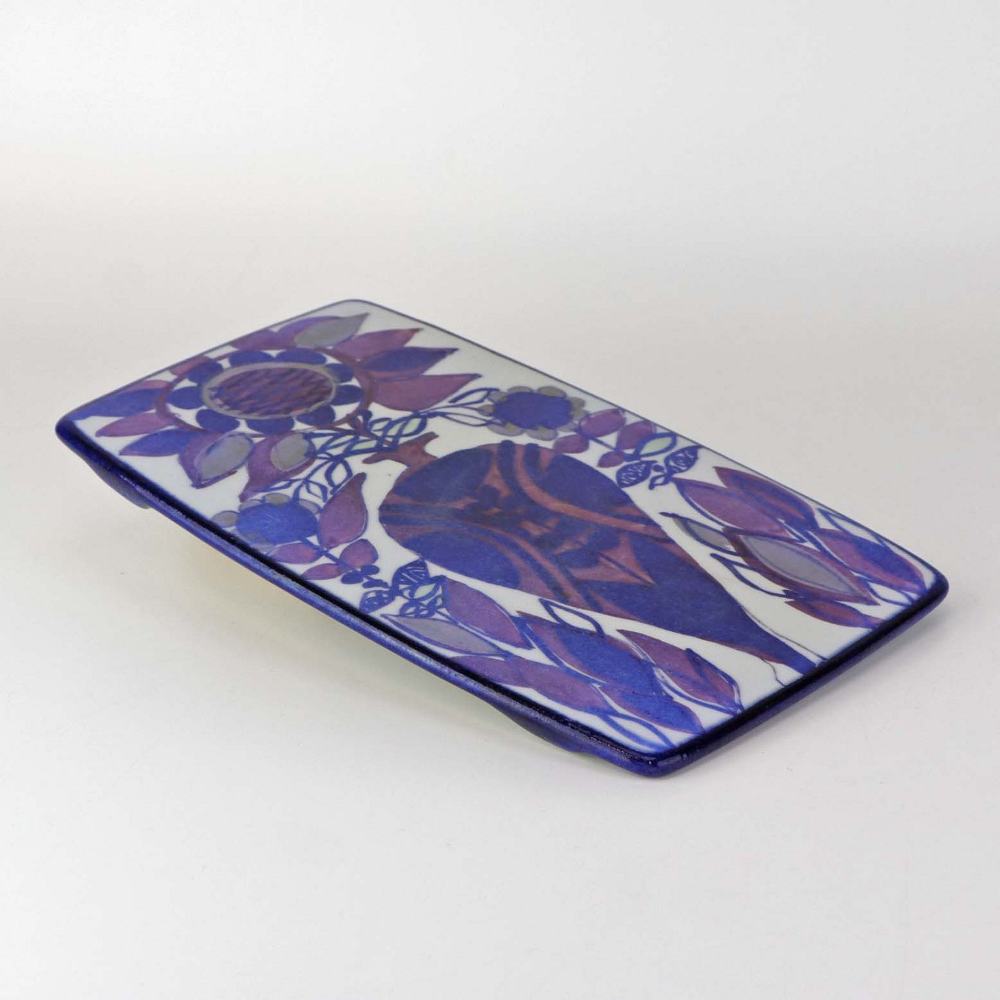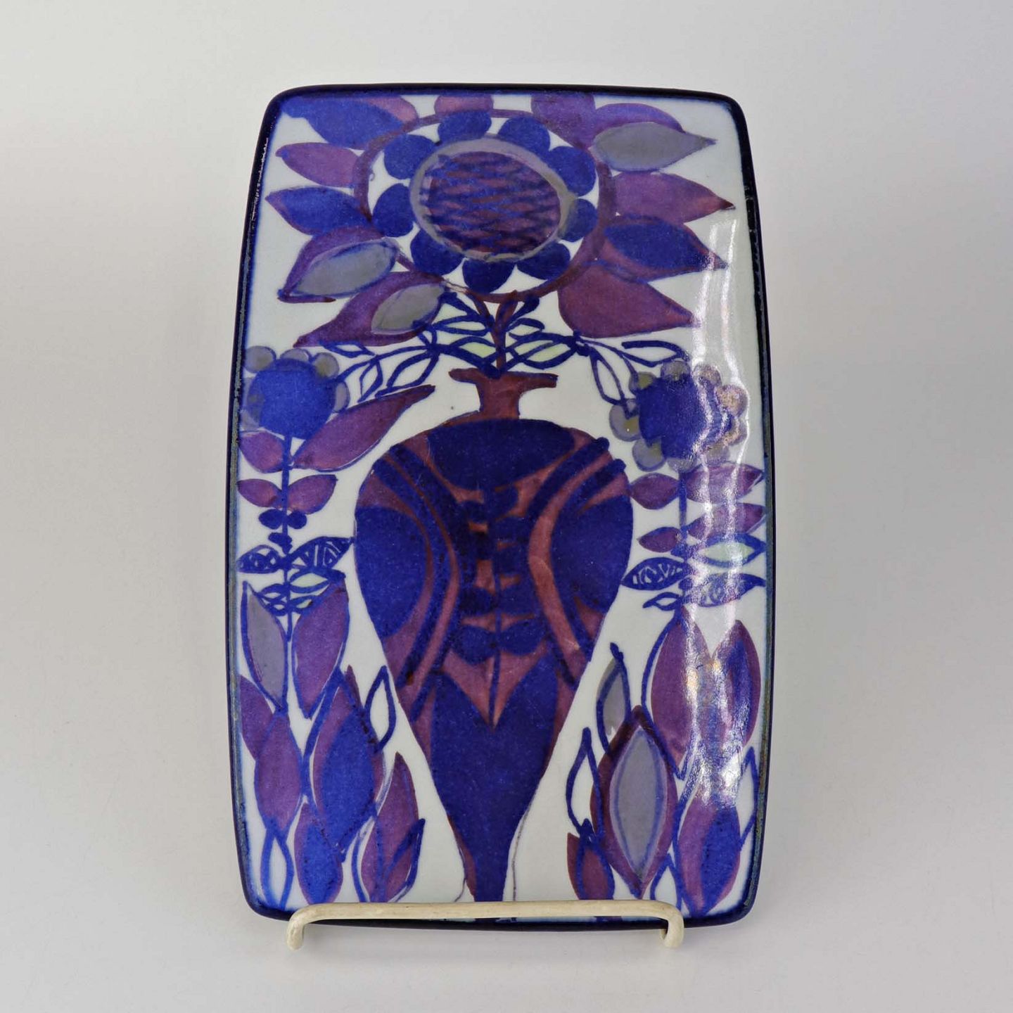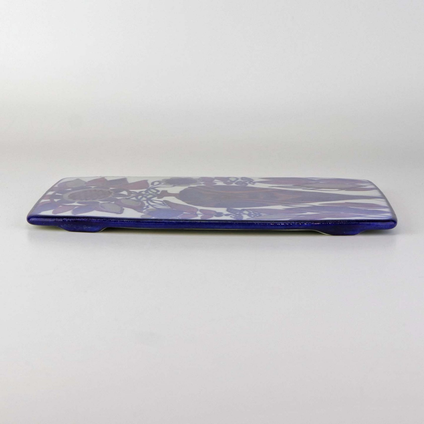 Smørbrik i fajance fra serien Tenera med motiv af blomster og vase i blå og lilla nuancer. Nr. 176/2901Formgiver Kari Christensen