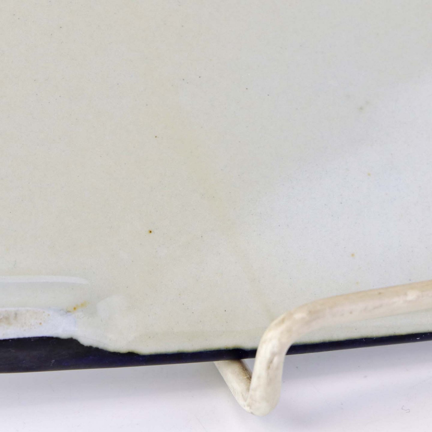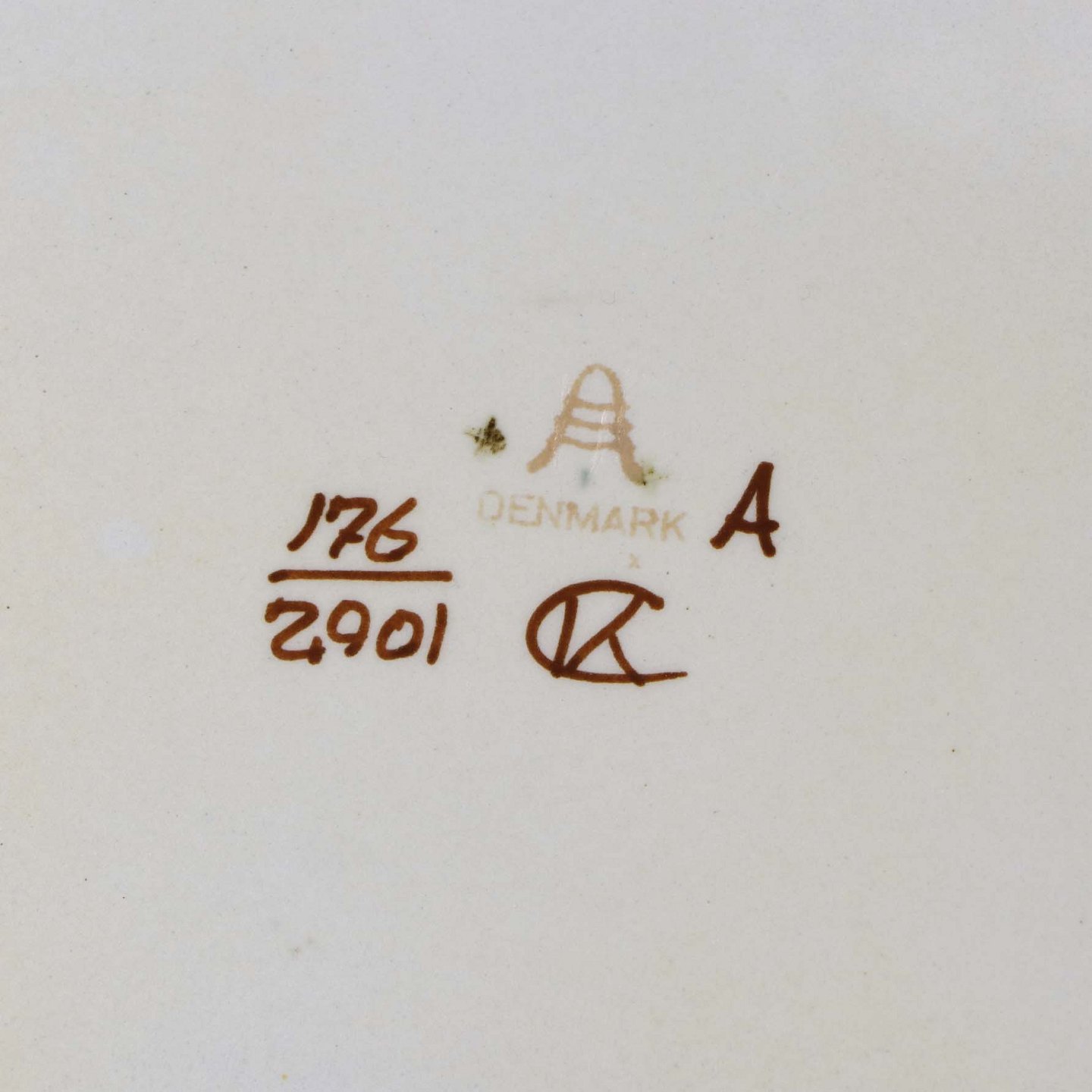 Fremstår med mindre ridse på frontsiden, ujævnheder i glasuren på siden samt gulning på bagsiden.