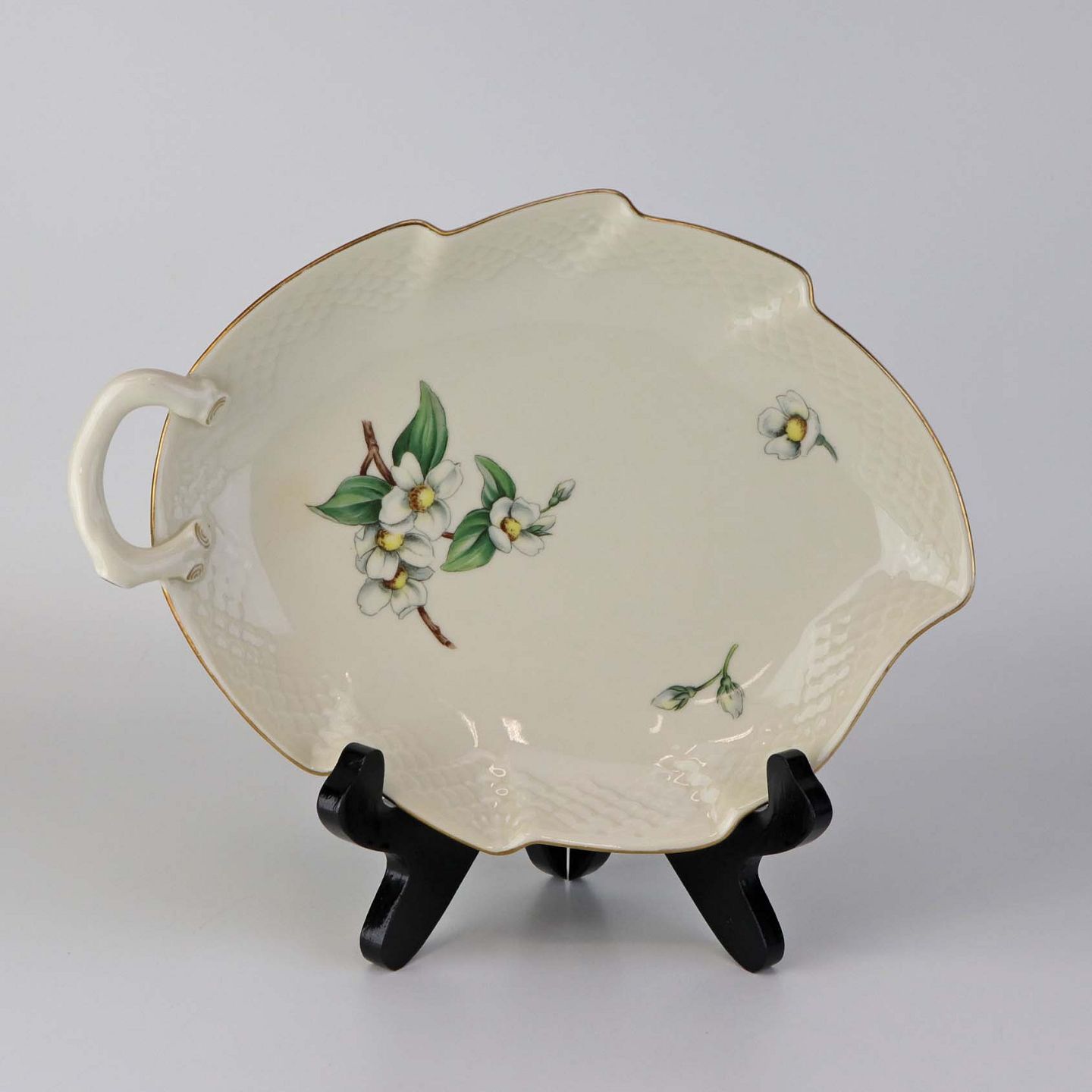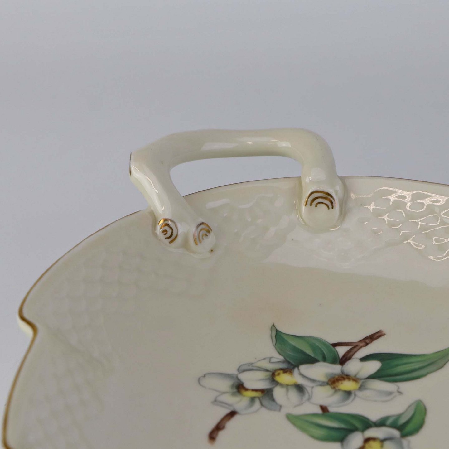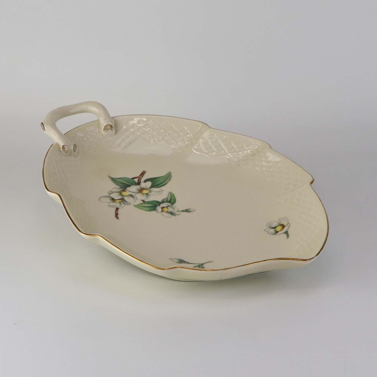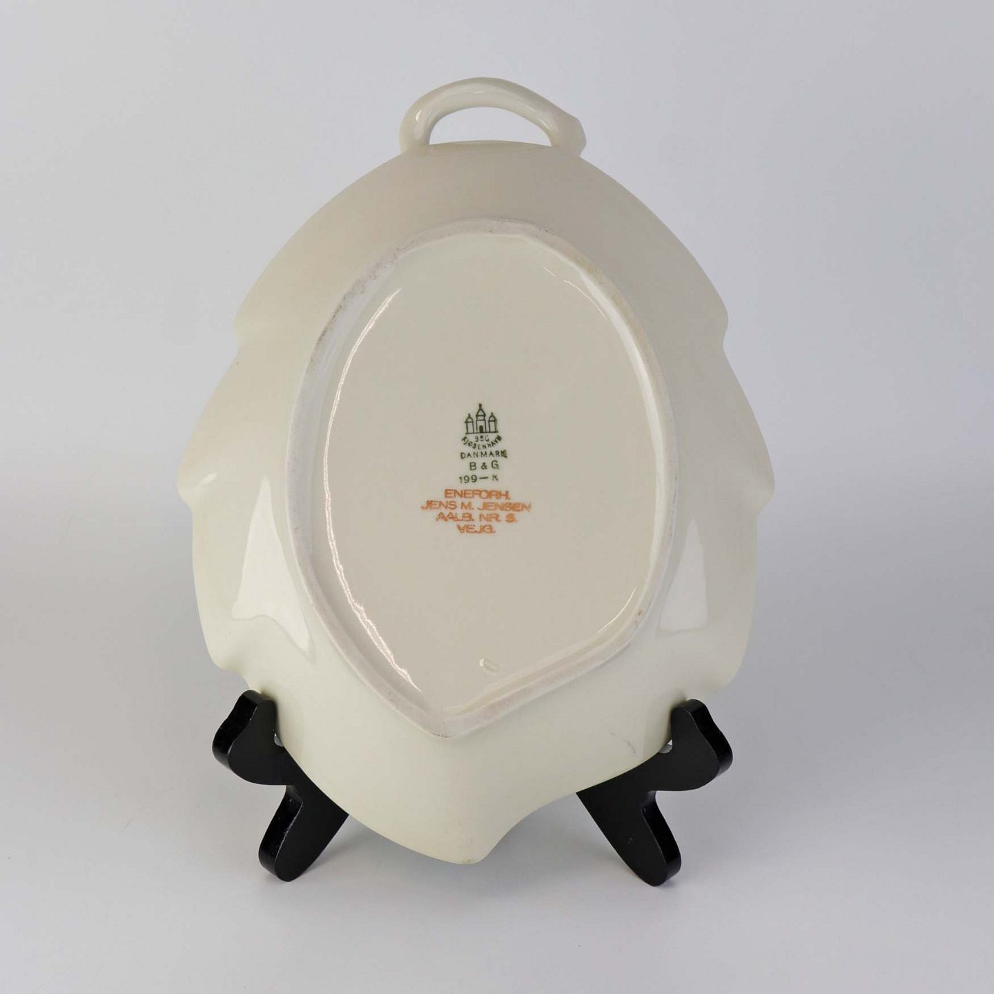 Bladformet kagefad med hank i porcelæn fra stellet Heimdal. Nr. 199Producent Bing & Grøndahl