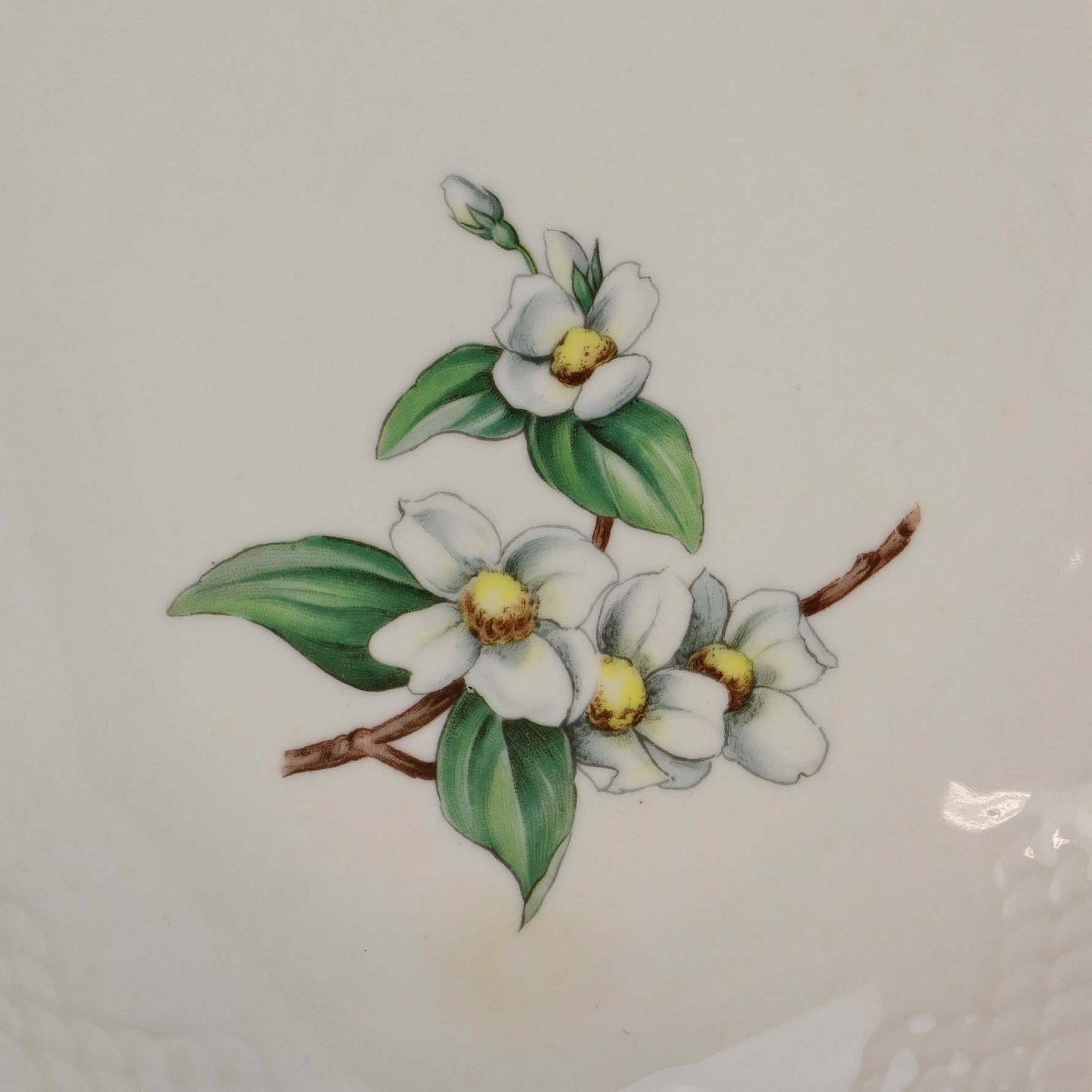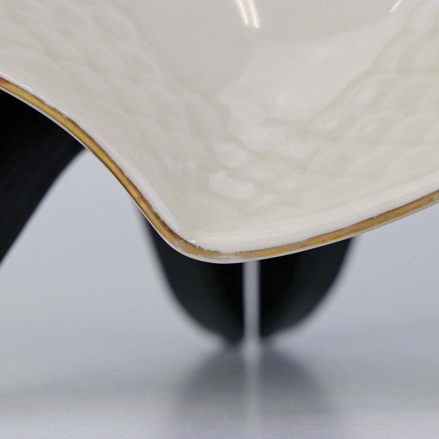 Heimdal er cremefarvet porcelæn i skælform, som dekoreret med jasminblomster, grene og en guldkant.