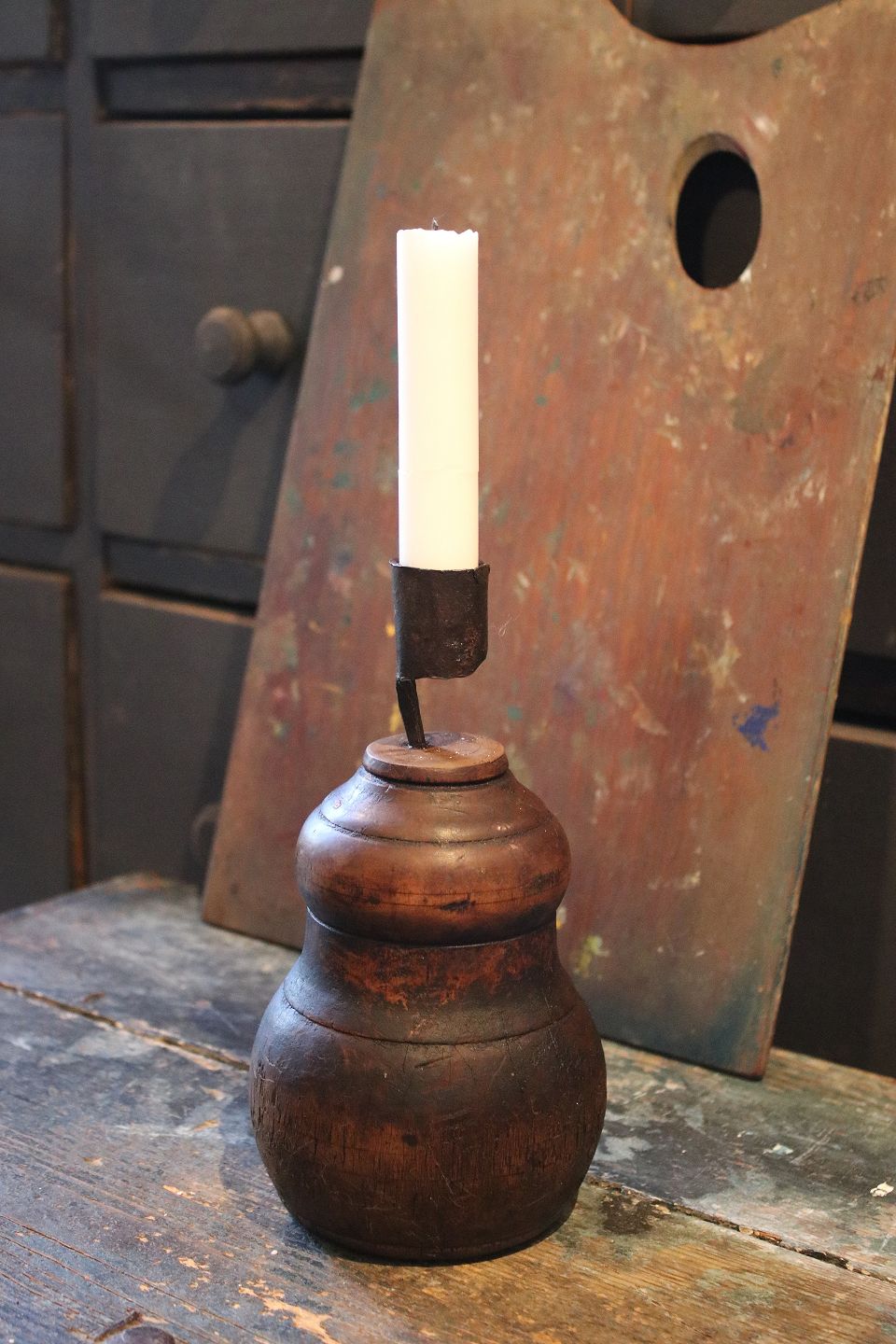 Træ og smedejern i smuk forening – med patina, historie og nordisk sjæl. H: 20,5cm. Dia.: 11cm.
