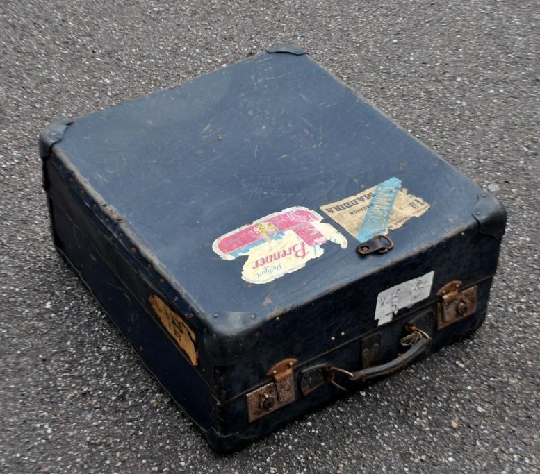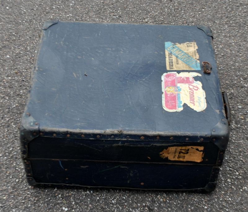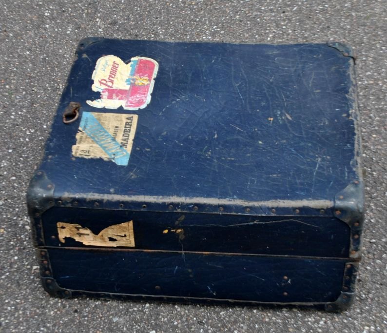 Koffer, 20. Jahrhundert. Mit deutschen Etiketten. Breiter Griff. Zwei Schlösser, rostig und ohne Schlüssel. L: 54 cm. B: 49 cm. H: 26 cm.Bestellnummer: 28004