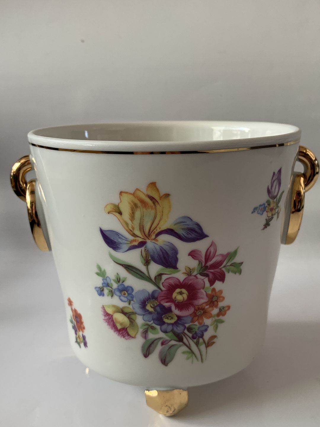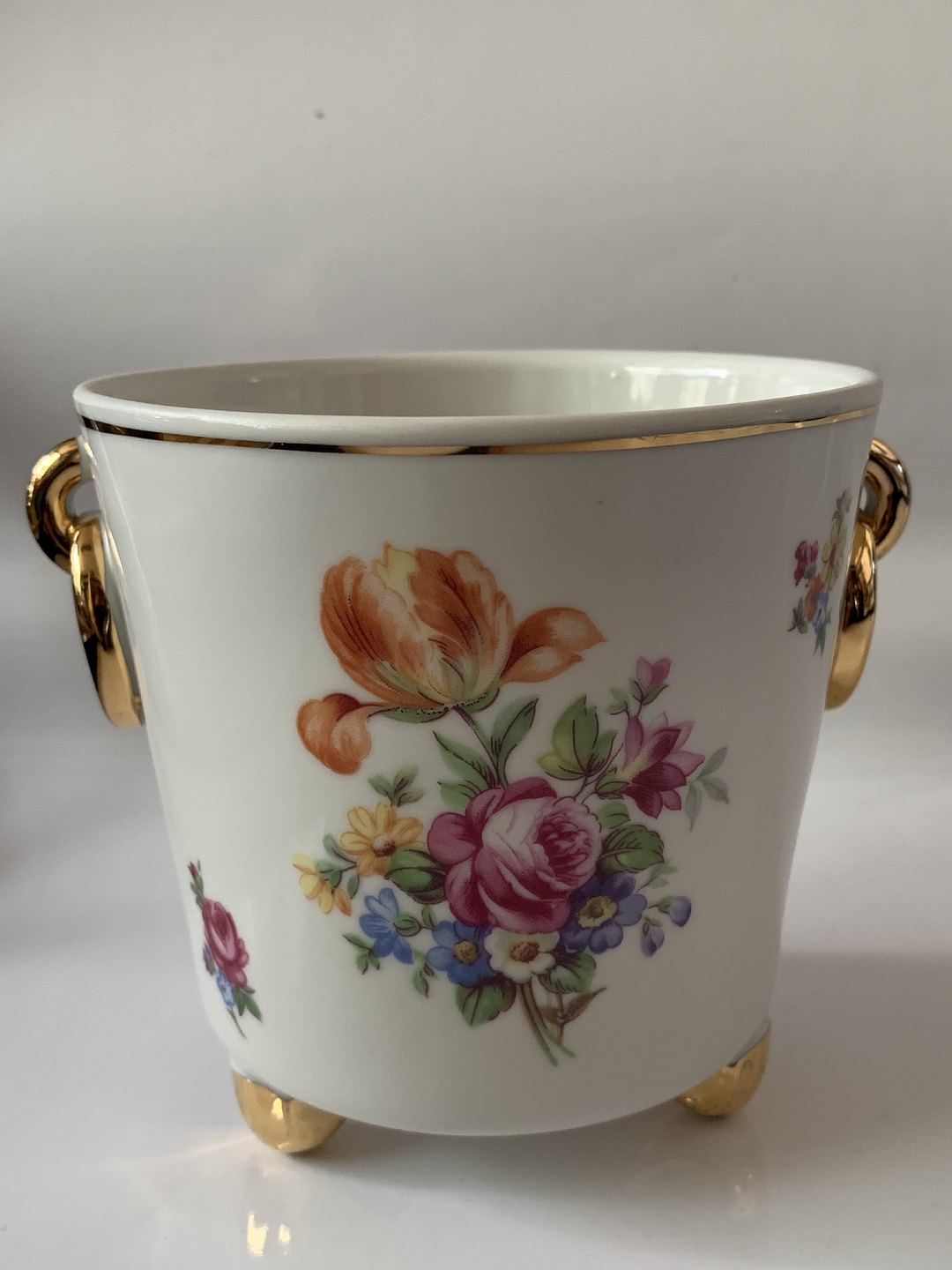 Urtepotteskjuler med blomstermotiv / 3 fødder.Diameter indvendige mål 10,5 cm.