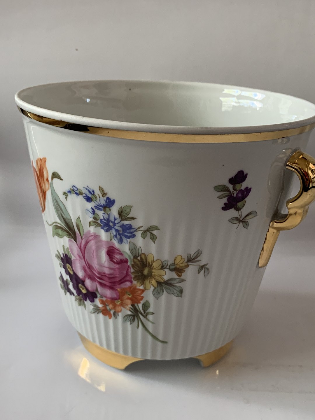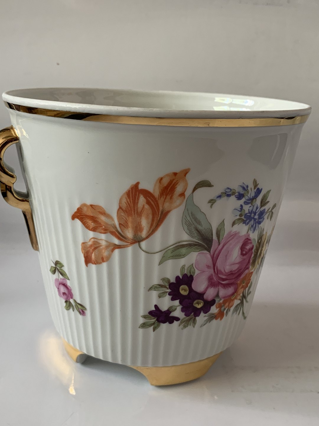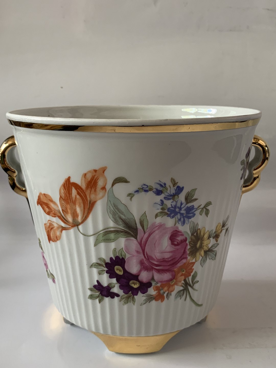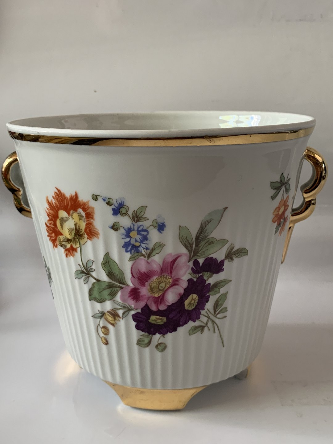 Urtepotteskjuler med blomstermotiv / 4 fødder.Diameter indvendige mål 15 cm.