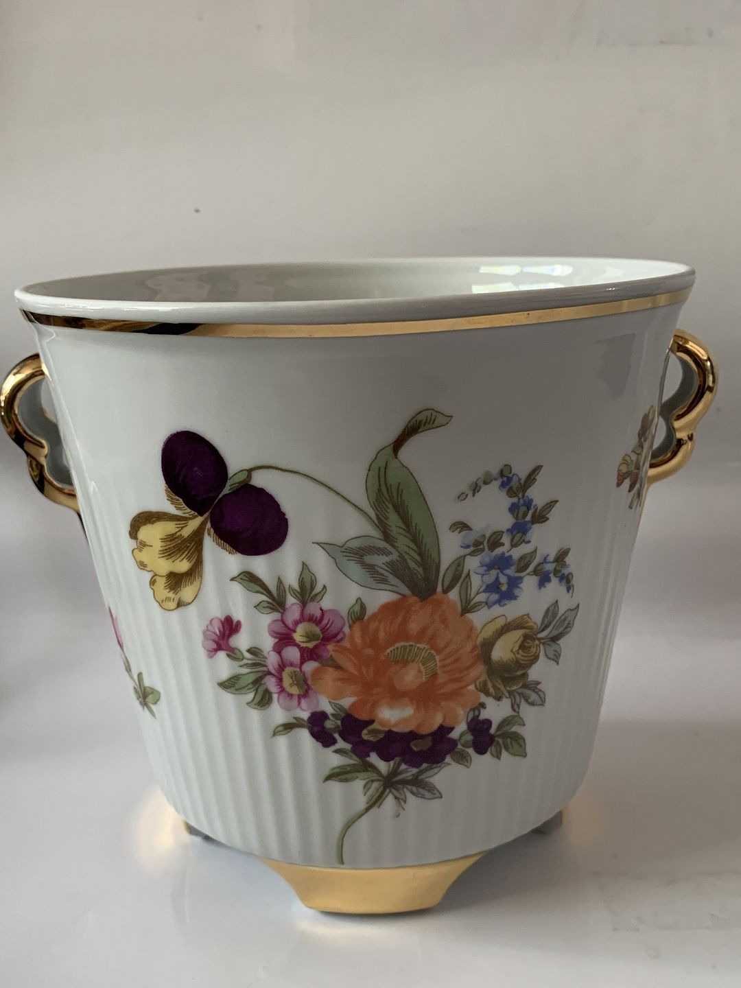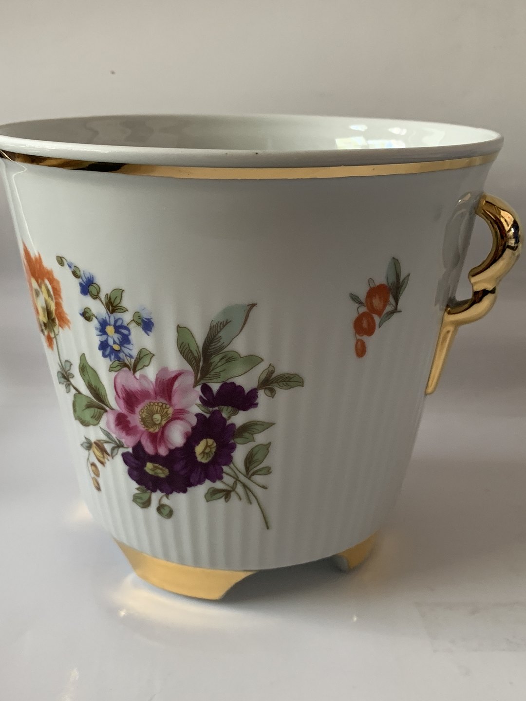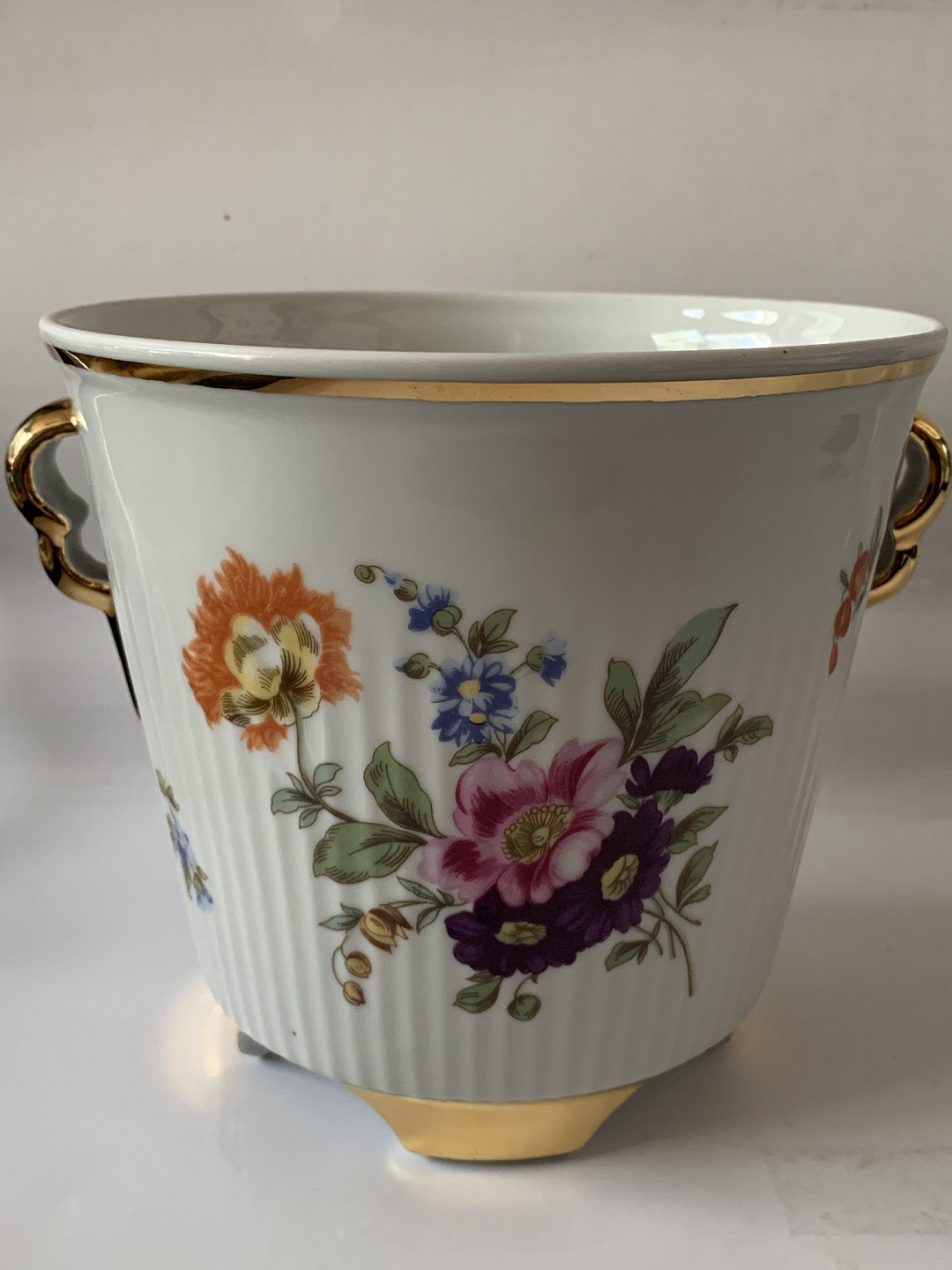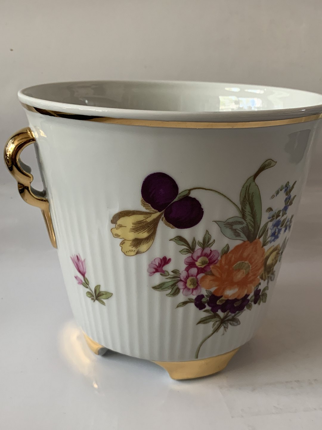 Urtepotteskjuler med blomstermotiv / 4 fødder.Diameter indvendige mål 15 cm.
