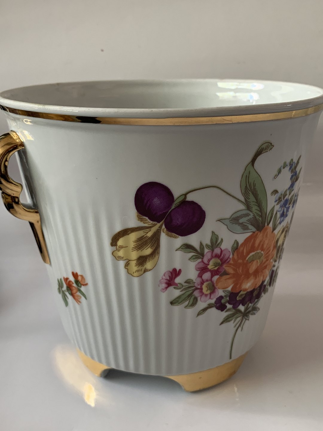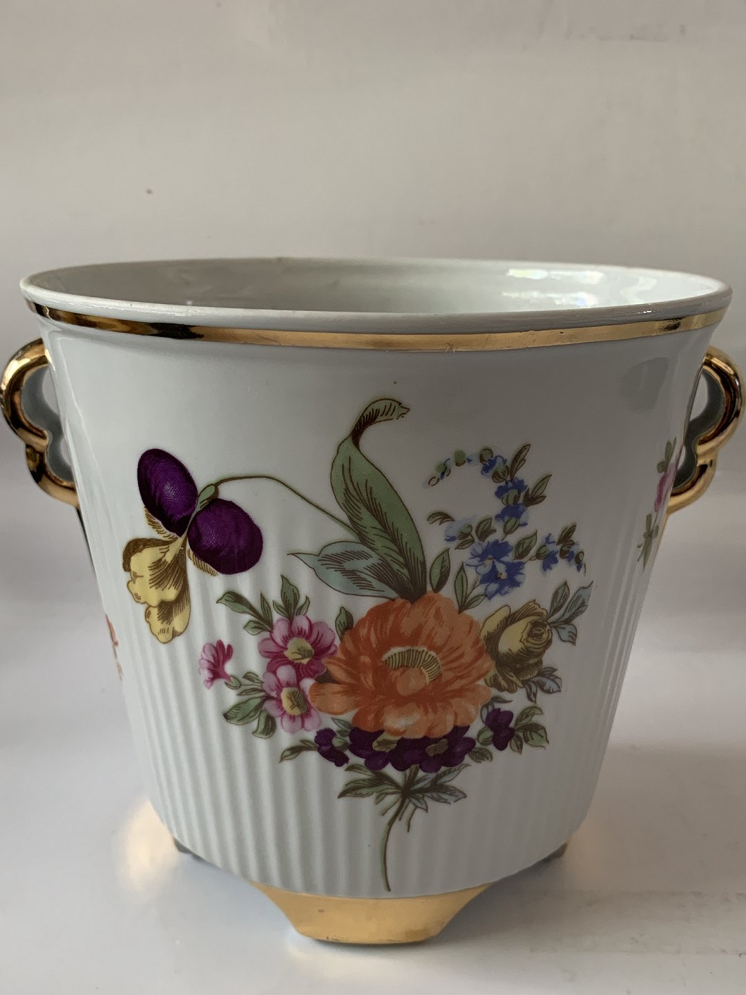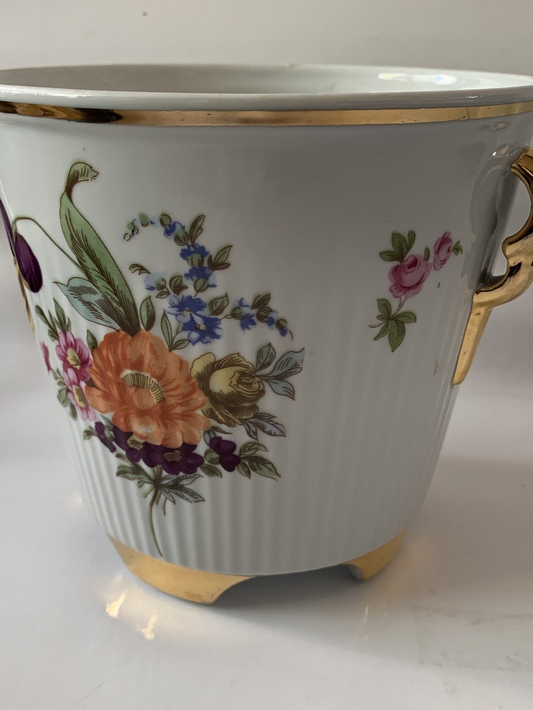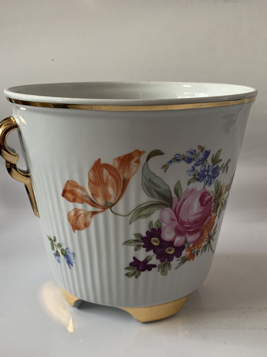 Urtepotteskjuler med blomstermotiv / 4 fødder.Diameter indvendige mål 15 cm.