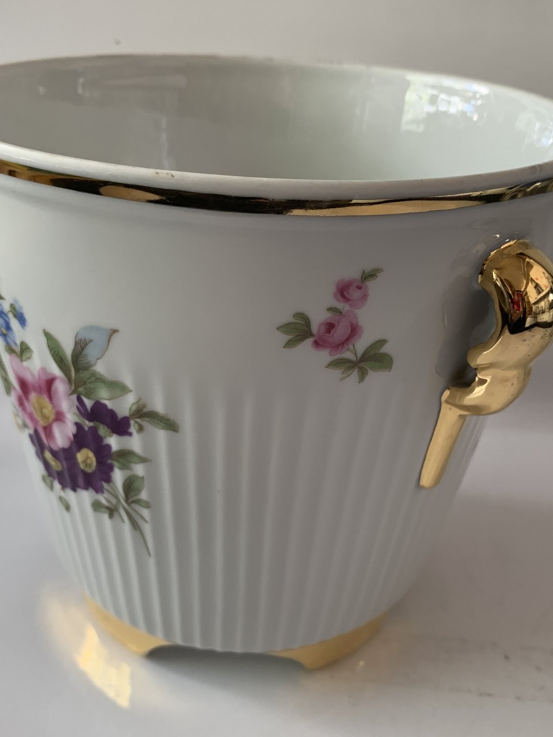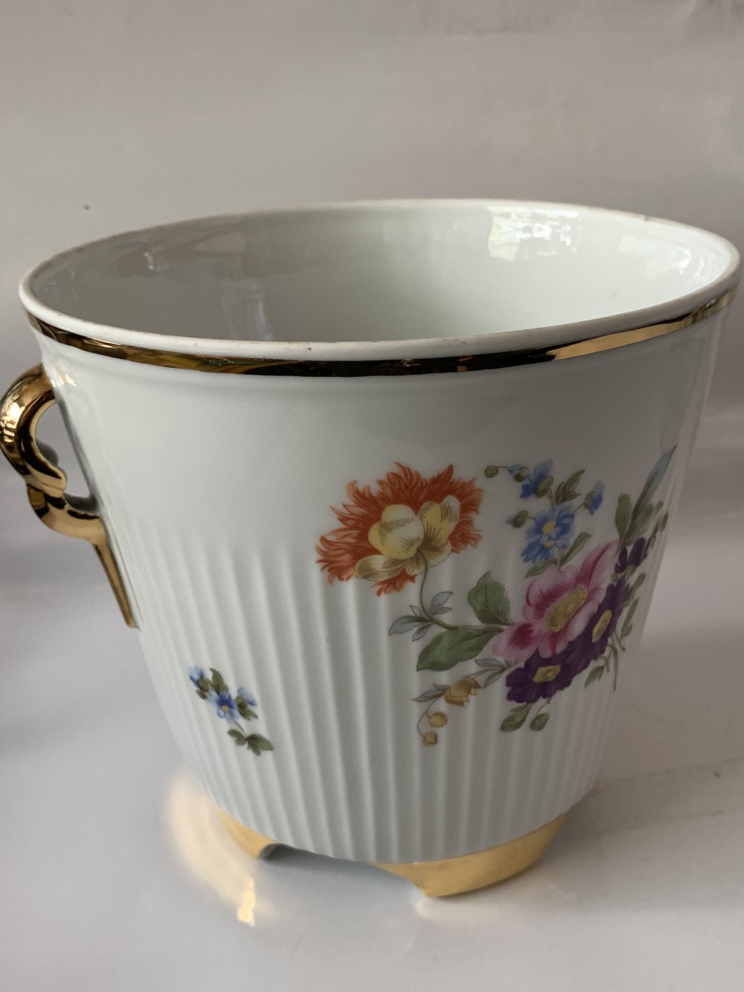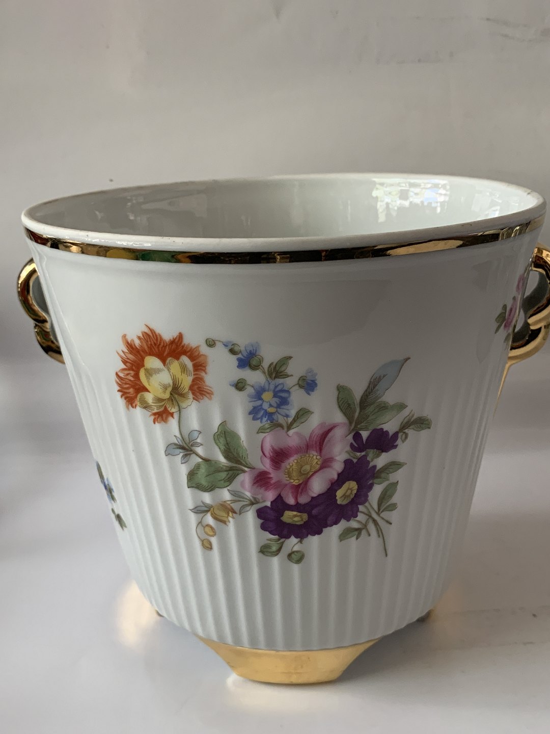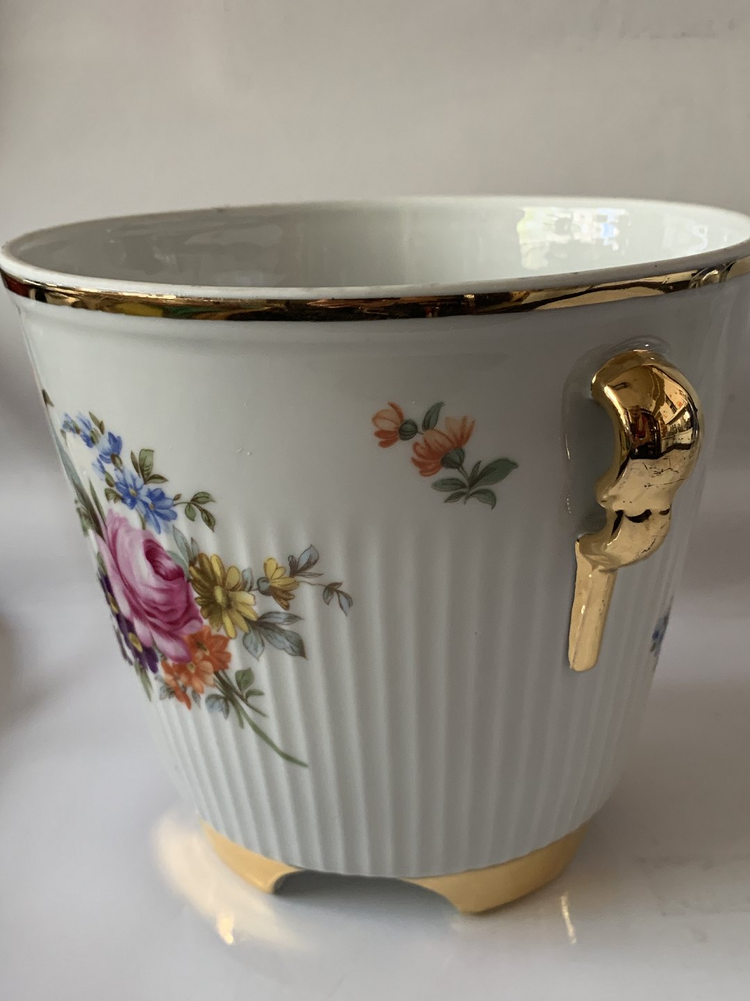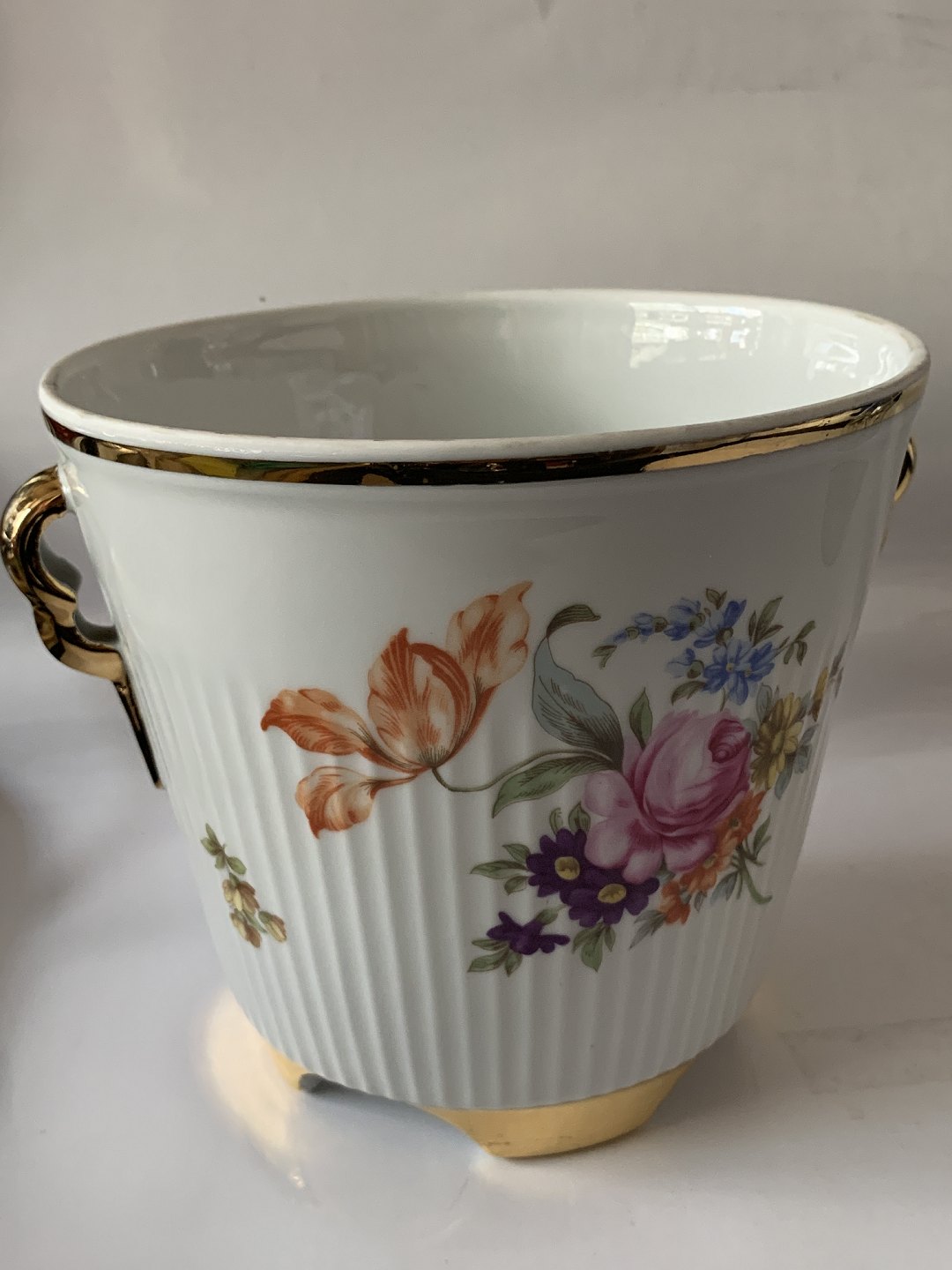 Urtepotteskjuler med blomstermotiv / 4 fødder.Diameter indvendige mål 17,3 cm.