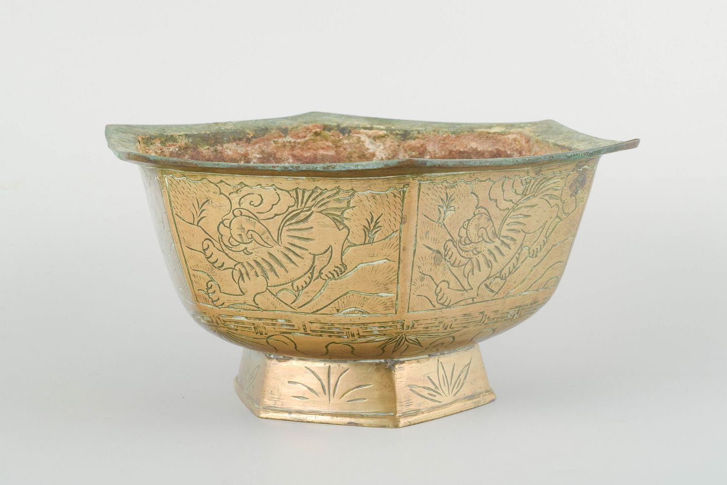 Kina, forgyldt bronzekar, Ming-dynastiet (Xuande-mærke, 1426–1435), senere, 18./19. årh.Forgyldt bronzekar i sekskantet form, dekoreret med indgraverede dyremotiver i felter. På bunden findes et firtegns Xuande-mærke “宣德年制” (fremstillet i Xuande-perioden). Sådanne mærker blev ofte anvendt i Qing-perioden og senere som en hyldest til Ming-tidens berømte bronzer. Karret har en smuk gylden patina med spor af slid og korrosion, som vidner om alder og brug.