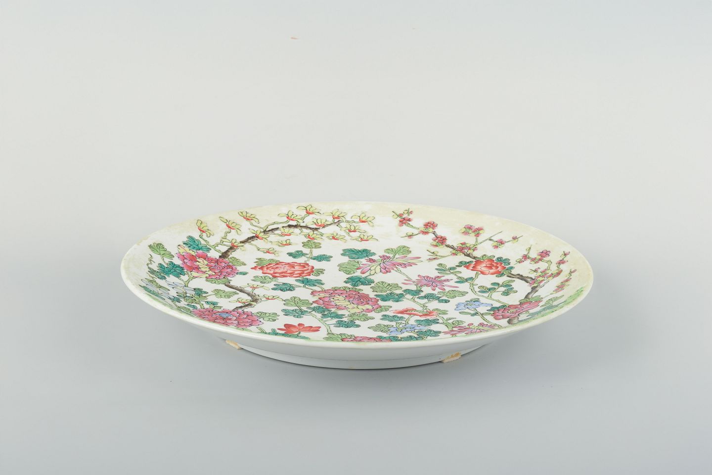 En dekorativ og stor skål, der med sit rige blomsterregister repræsenterer Qing-dynastiets sans for farvepragt og symbolik, hvor blomsterne står for velstand, harmoni og lang levetid.