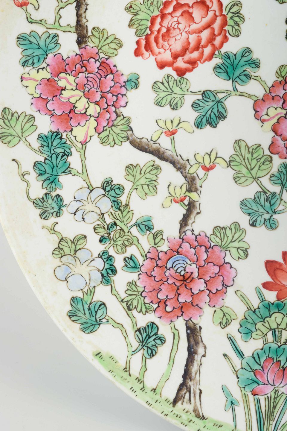 Kina, Tongzhi perioden (1862-1874)Stor porcelænsskål dekoreret i famille rose med blomstrende pæoner, krysantemum, lotus og blomstrende grene i flerfarvede nuancer af rød, grøn, pink og turkis. Underglasuret hvid baggrund. På bunden rødt seks-tegns mærke “Tongzhi nian zhi” (fremstillet i Tongzhi-perioden).
